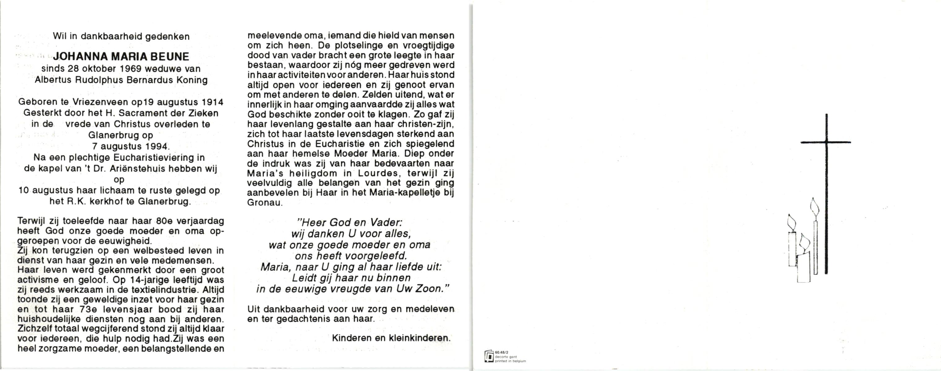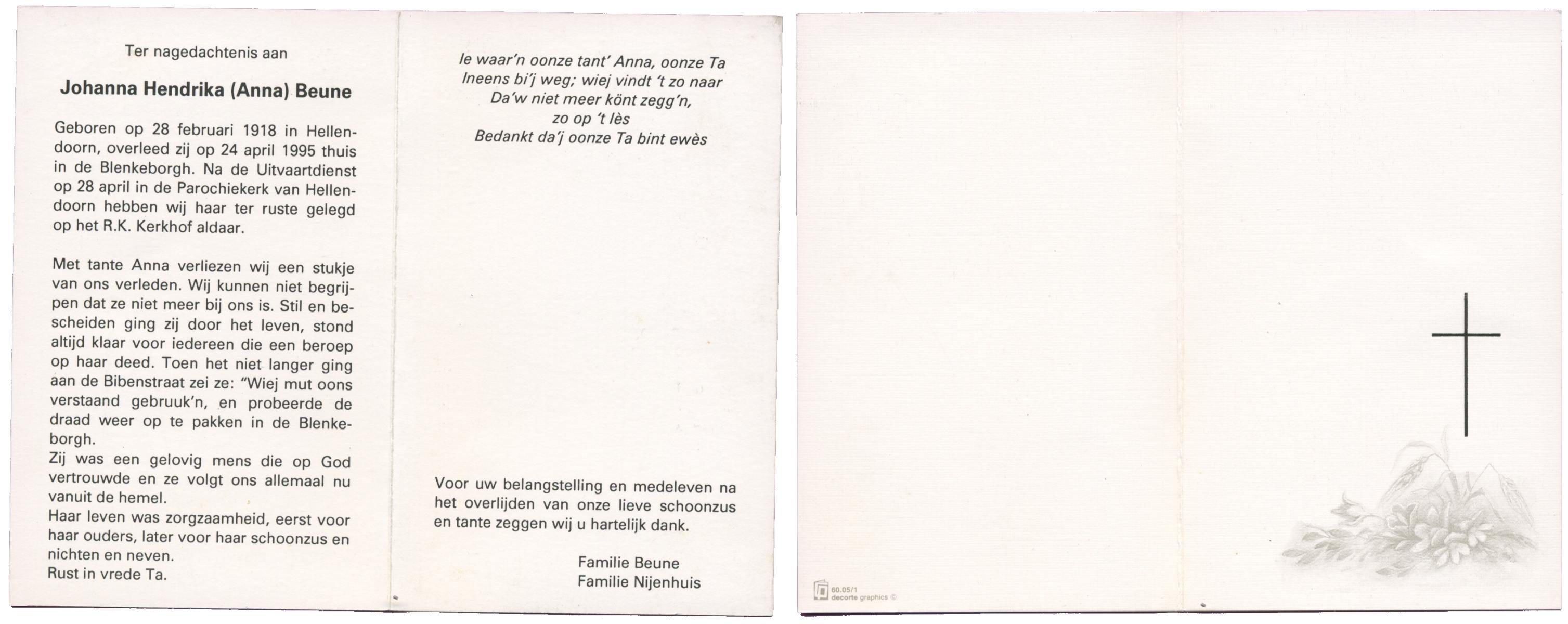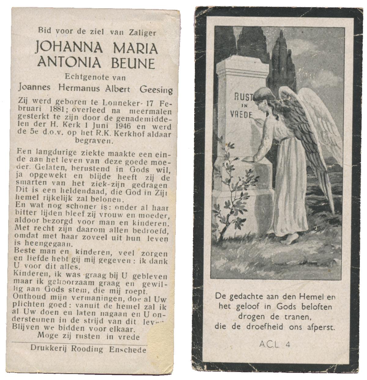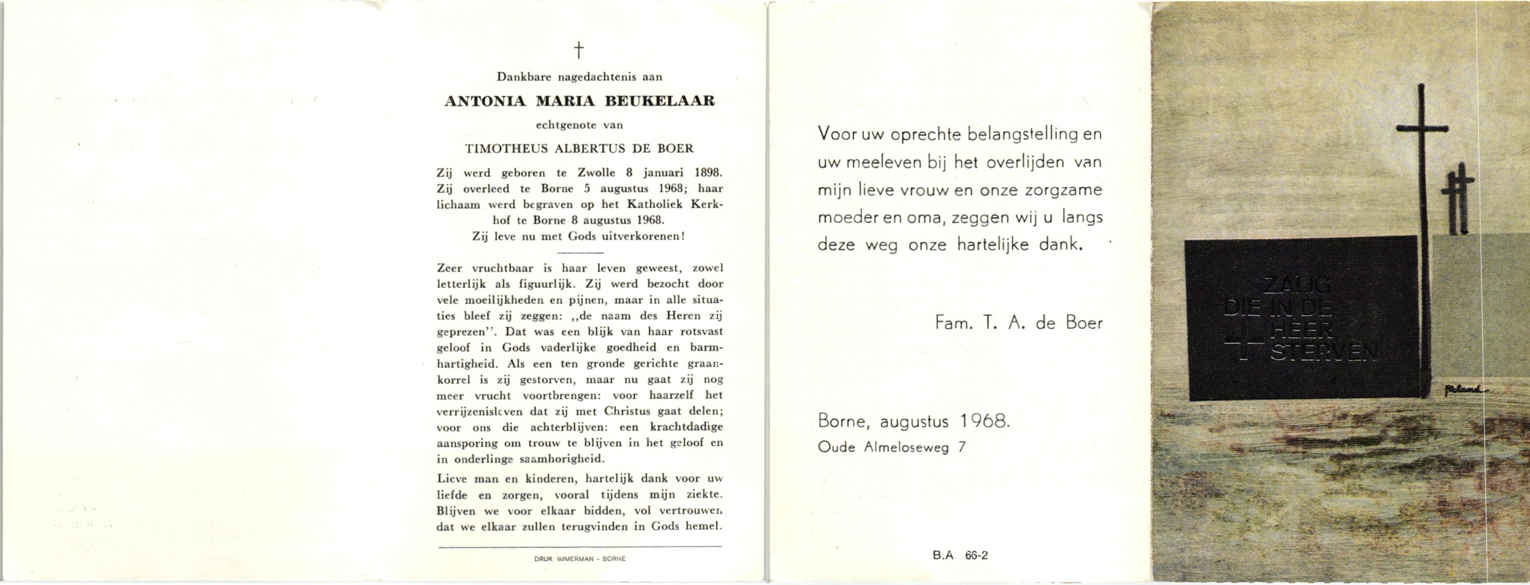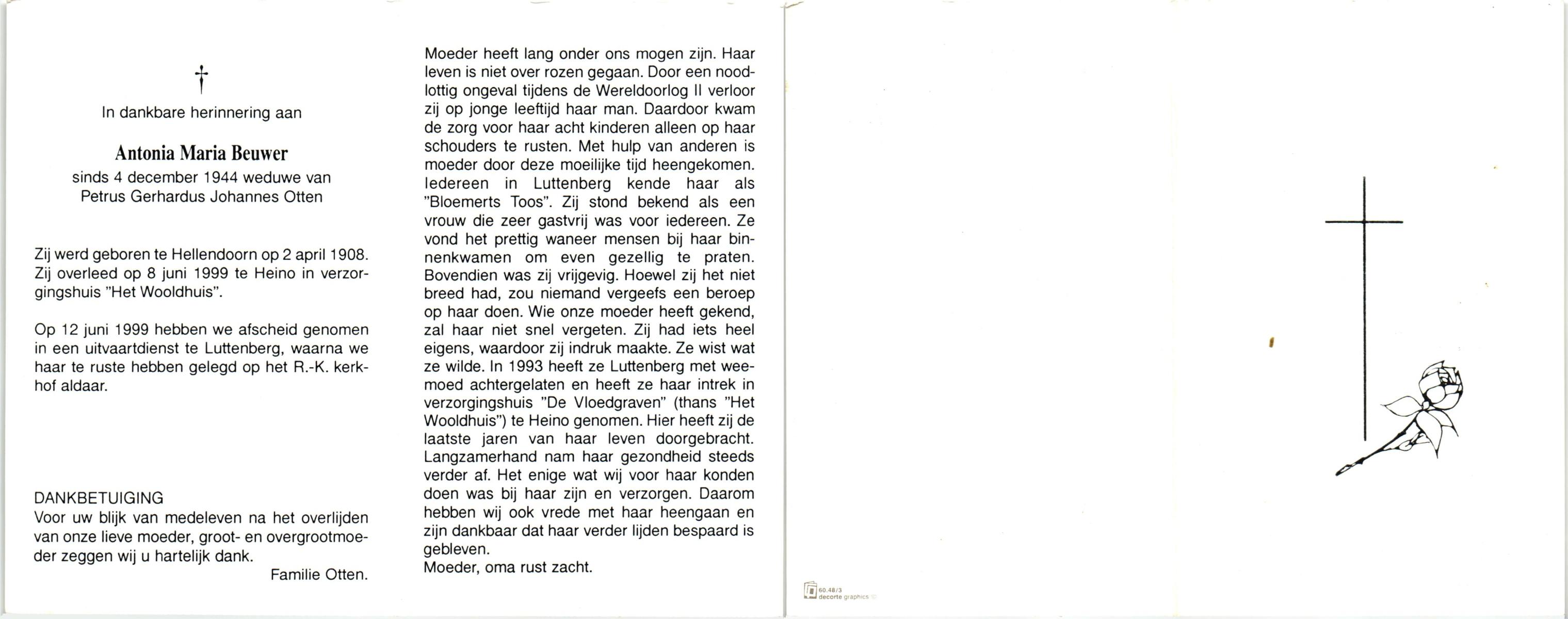 BEUWER, Antonia Maria, geboren op 2-4-1908 te Hellendoorn, overleden op 8-6-1999 te Heino op 91-jarige leeftijd, begraven op 12-6-1999 te Raalte, Luttenberg.