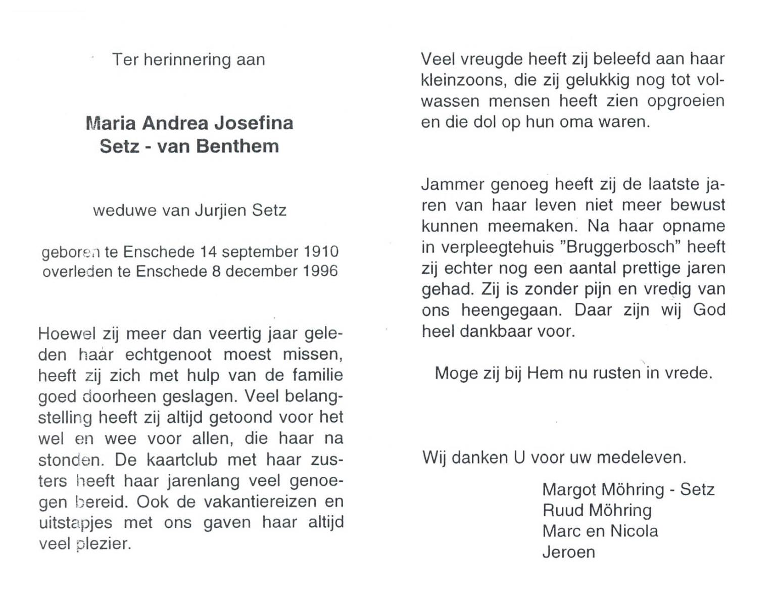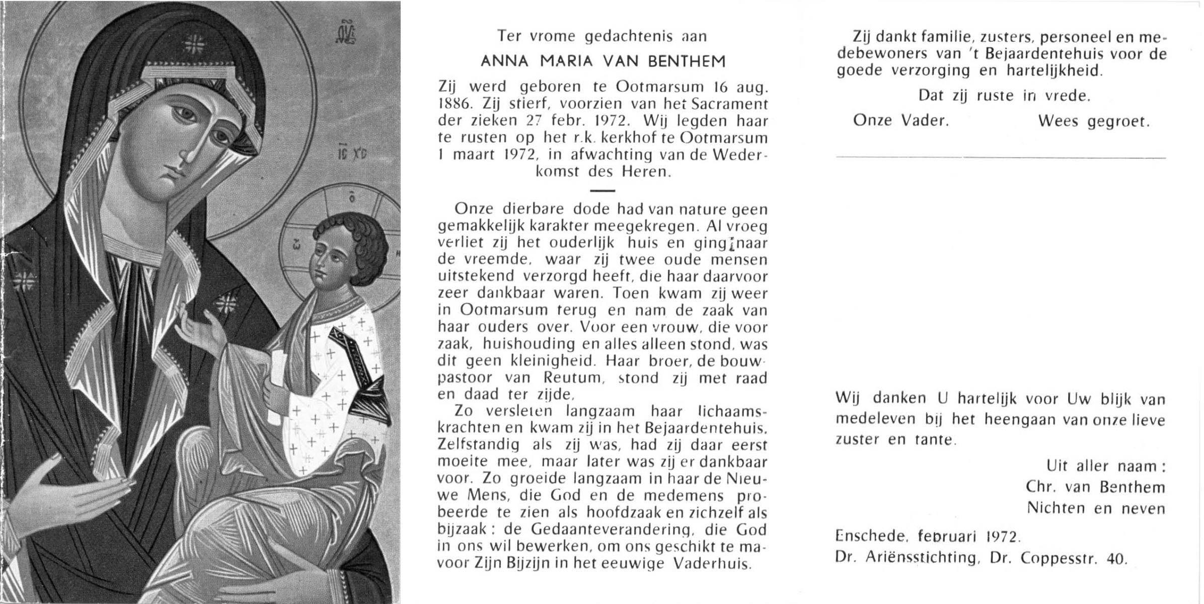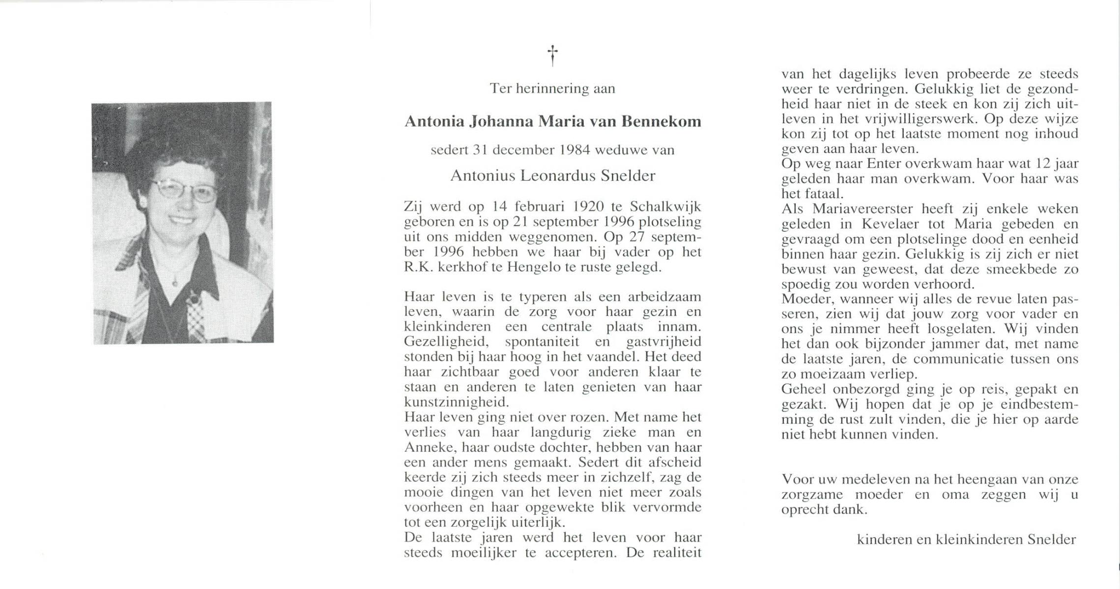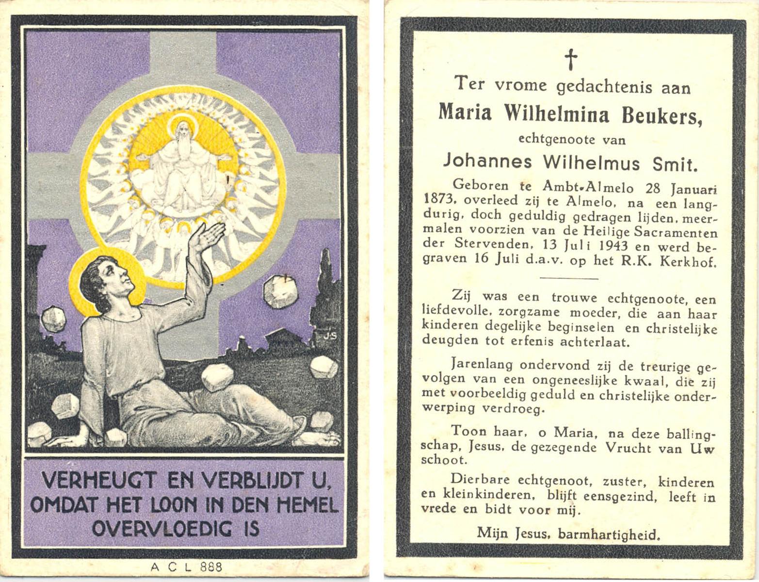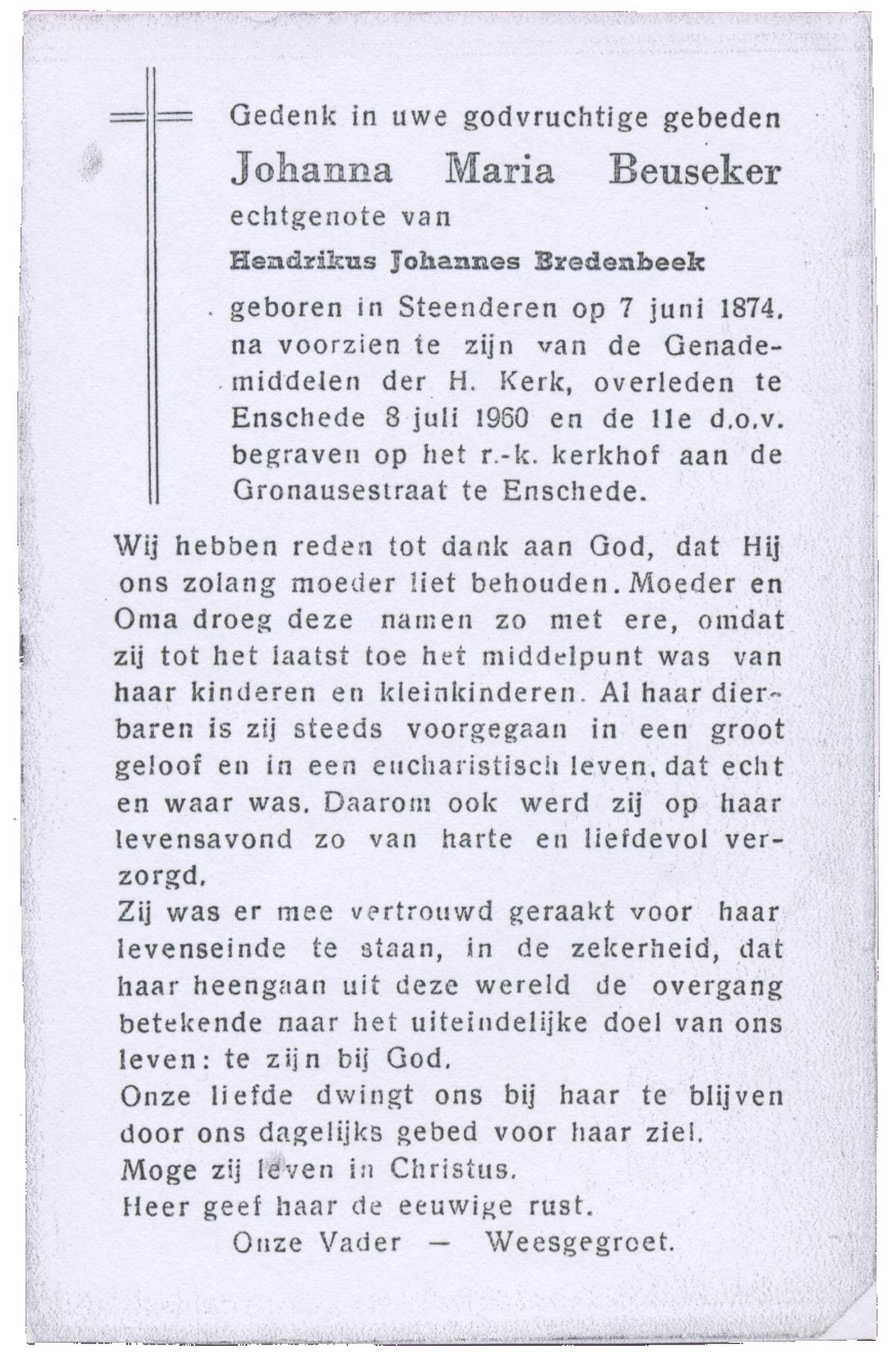 BEUWER, Antonia Maria, geboren op 2-4-1908 te Hellendoorn, overleden op 8-6-1999 te Heino op 91-jarige leeftijd, begraven op 12-6-1999 te Raalte, Luttenberg.
