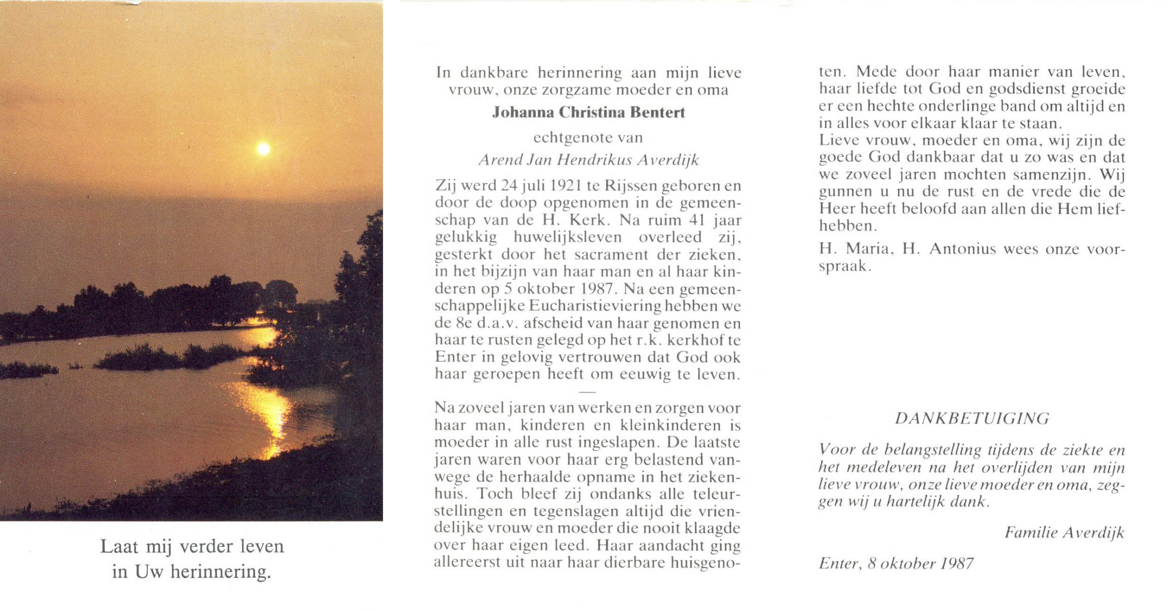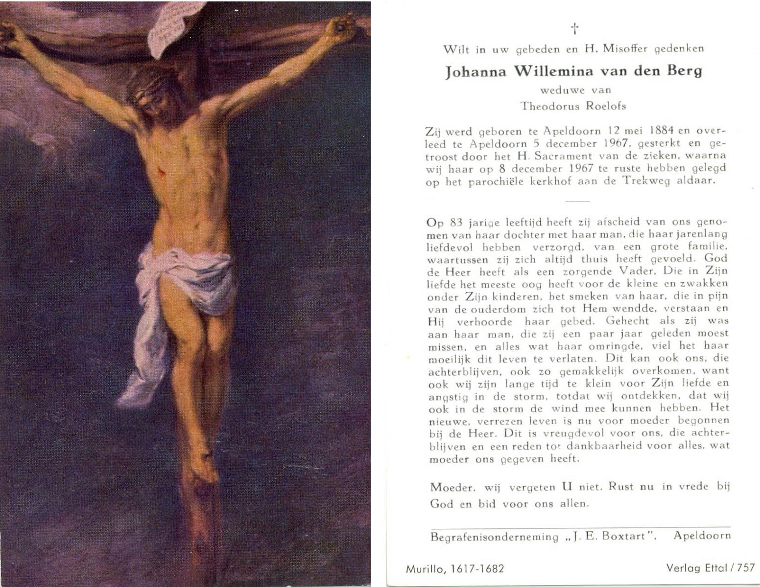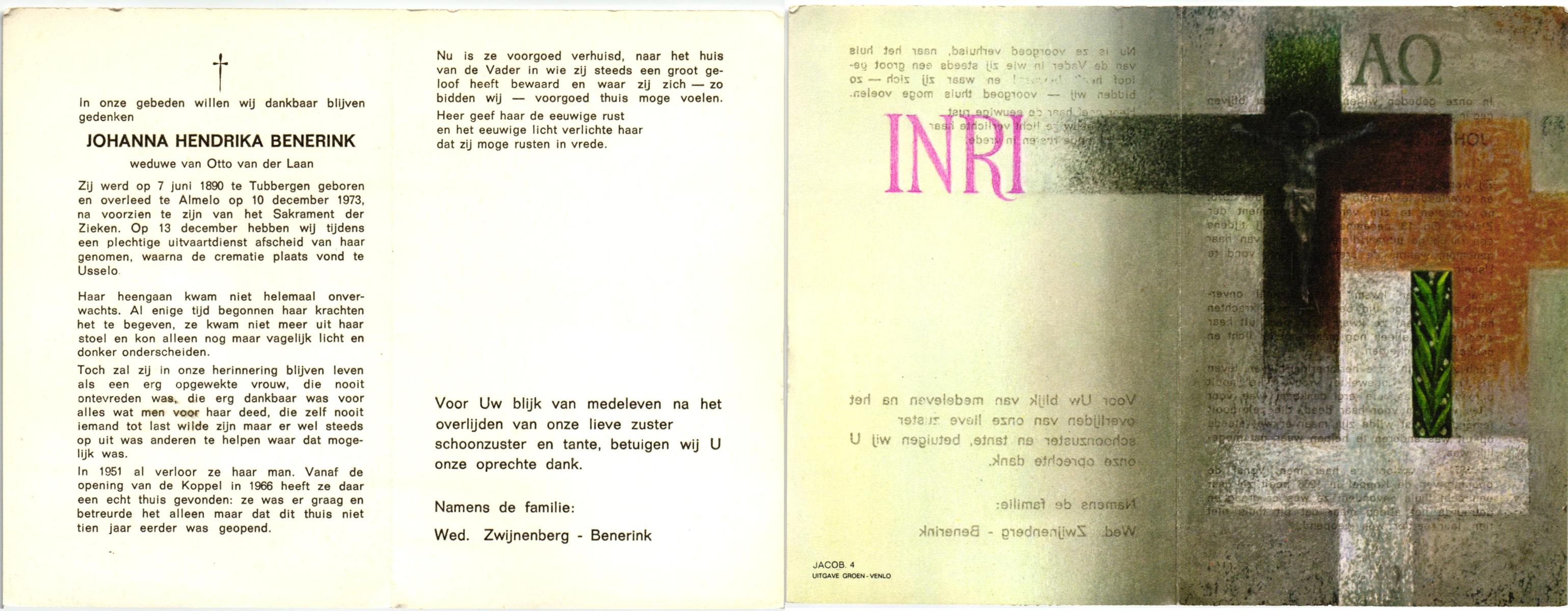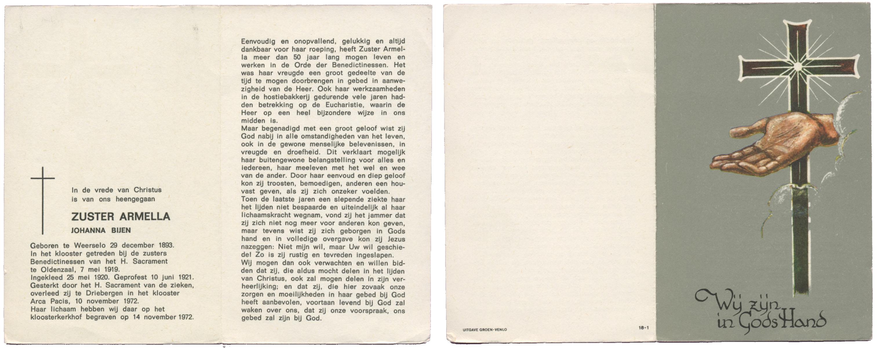 BIJEN, Johanna, geboren op 29-12-1893 te Weerselo, overleden op 10-11-1972 te Driebergen op 78-jarige leeftijd, begraven op 14-11-1972.