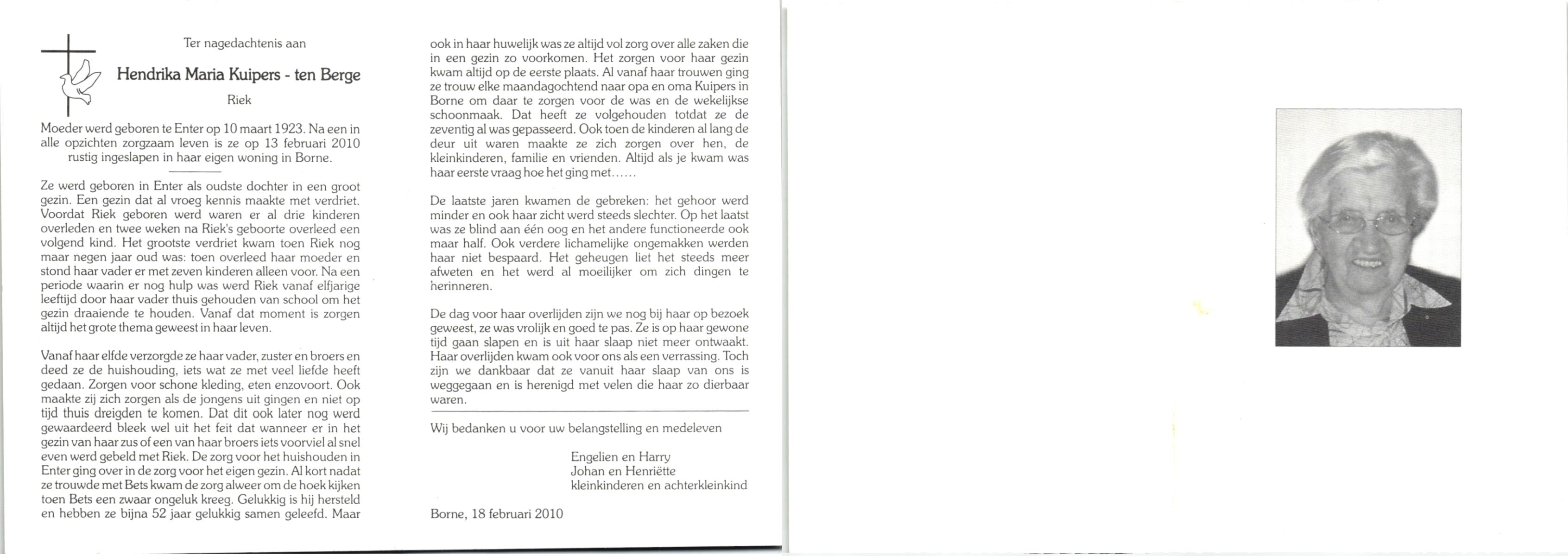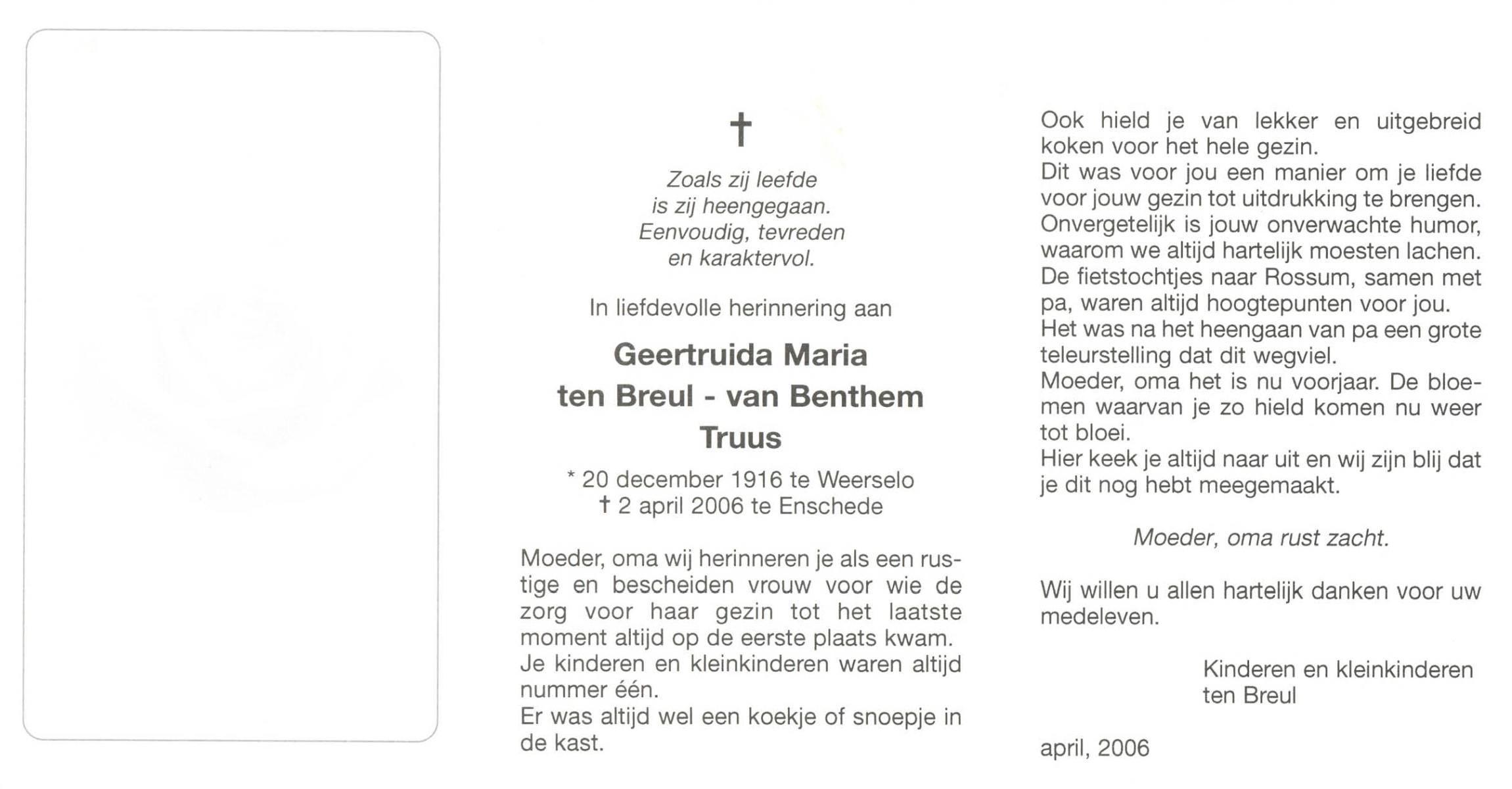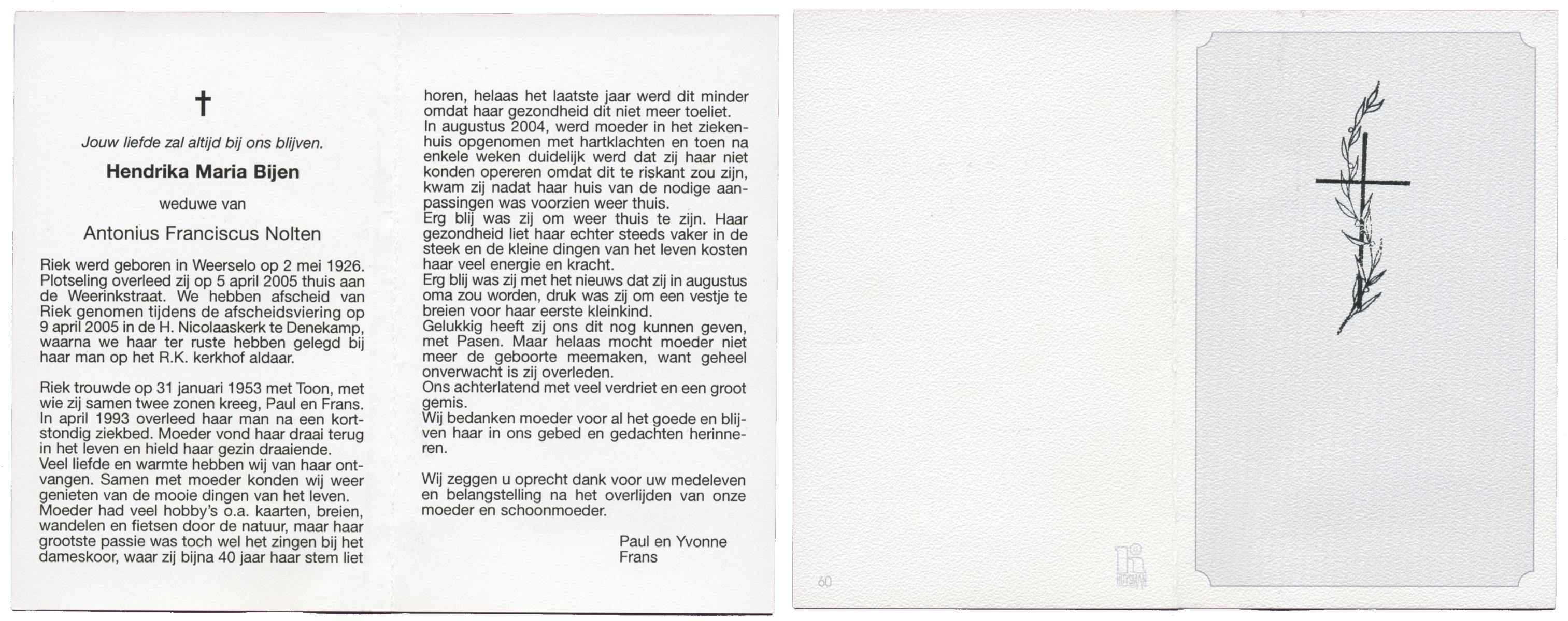 BIJEN, Hendrika Maria, geboren op 2-5-1926 te Weerselo, overleden op 5-4-2005 te Denekamp op 78-jarige leeftijd, begraven op 9-4-2005 te Denekamp.