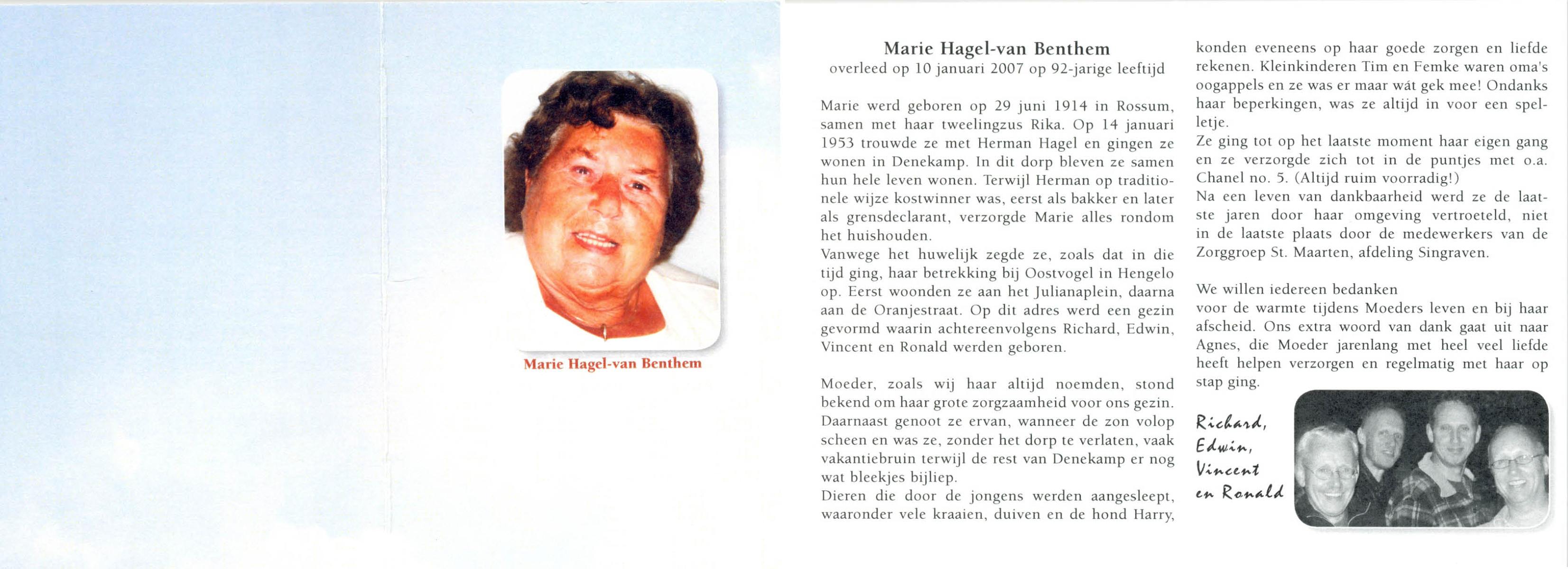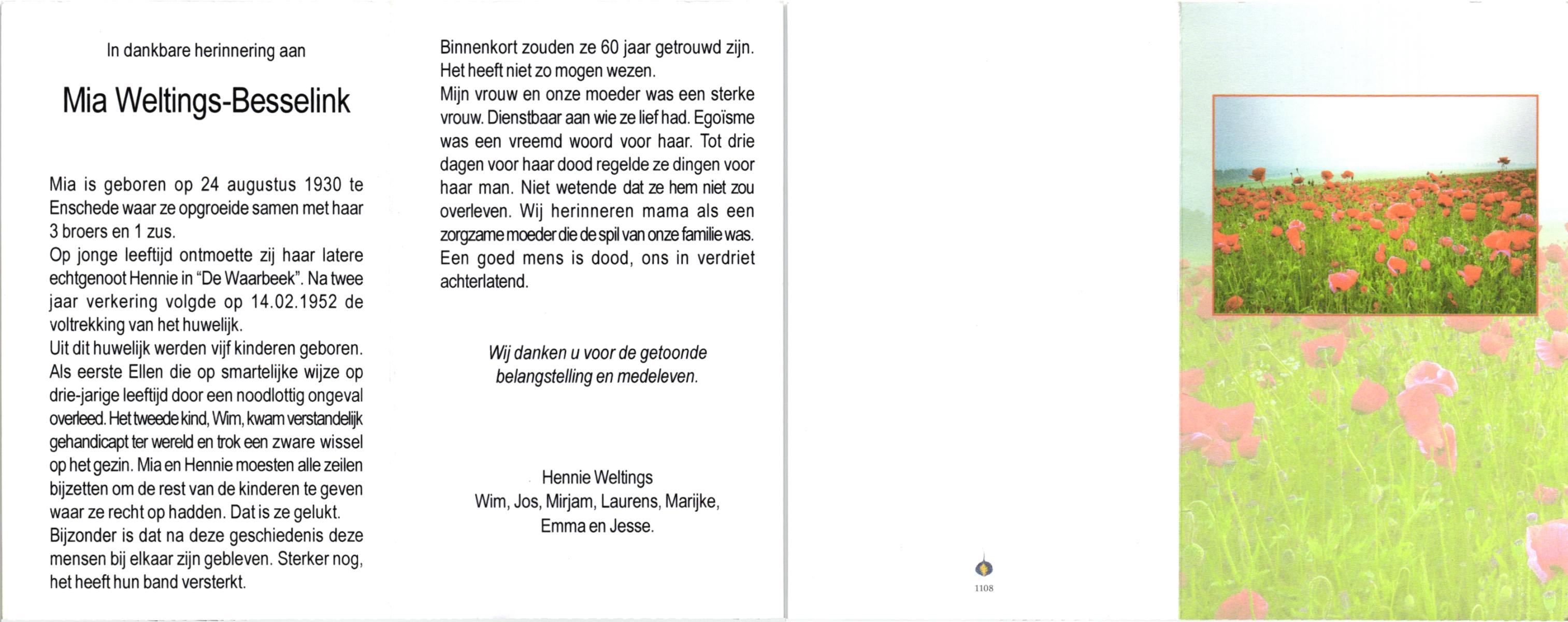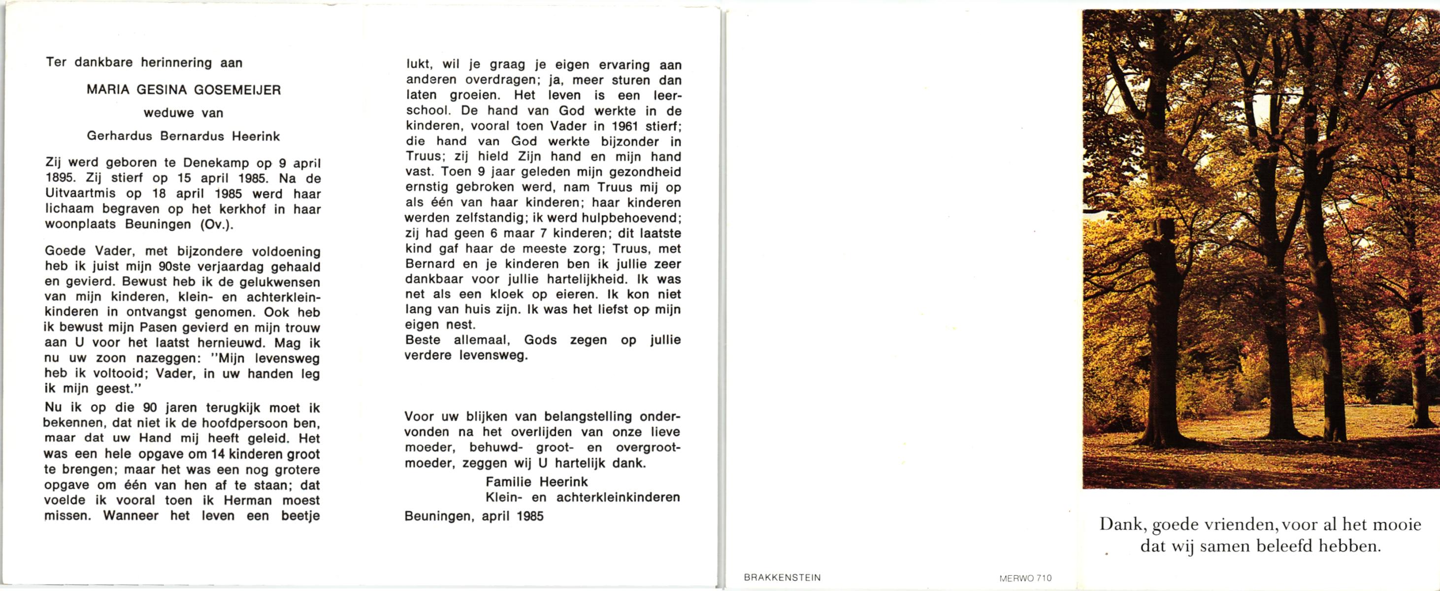 BIJEN, Hendrika Maria, geboren op 2-5-1926 te Weerselo, overleden op 5-4-2005 te Denekamp op 78-jarige leeftijd, begraven op 9-4-2005 te Denekamp.