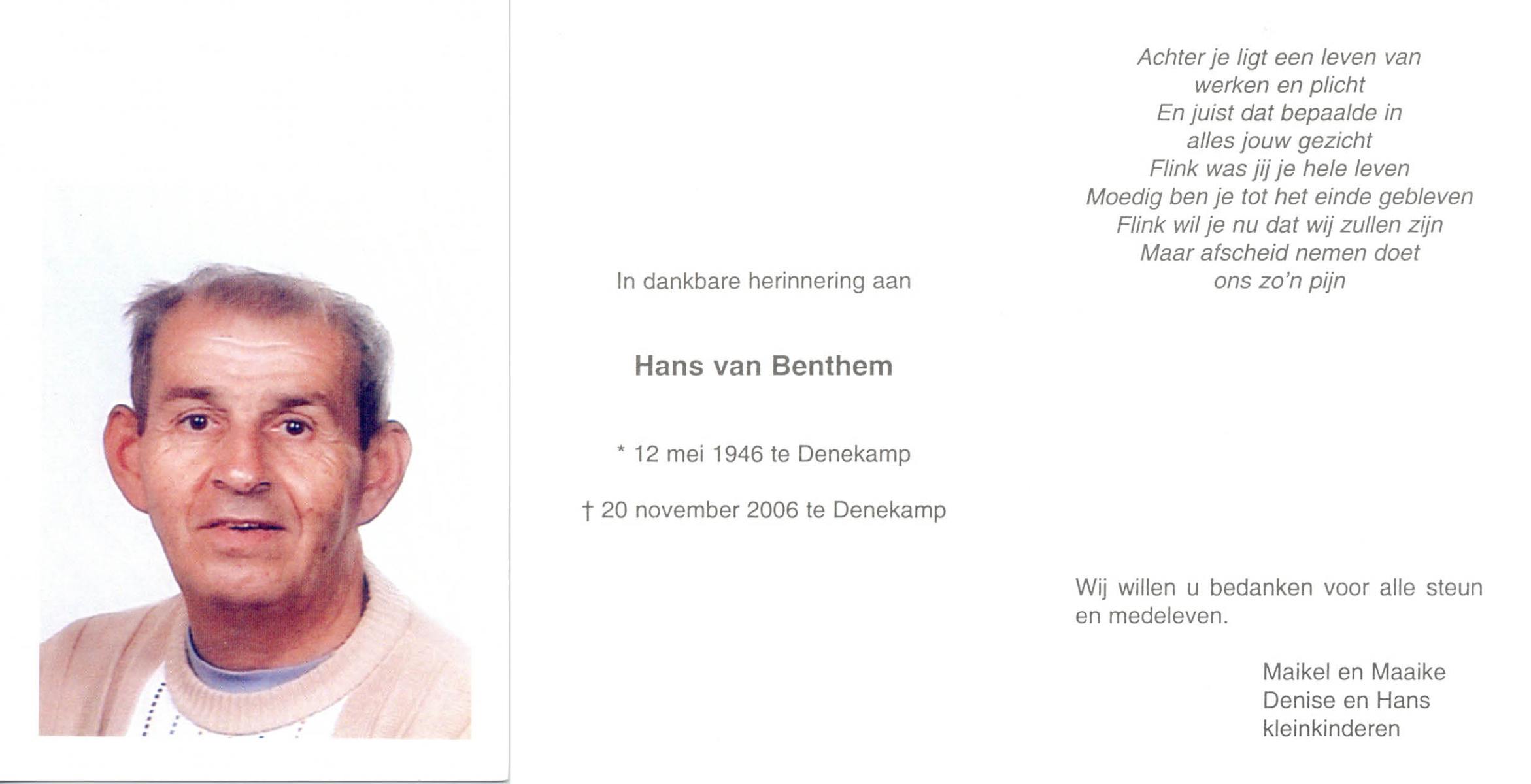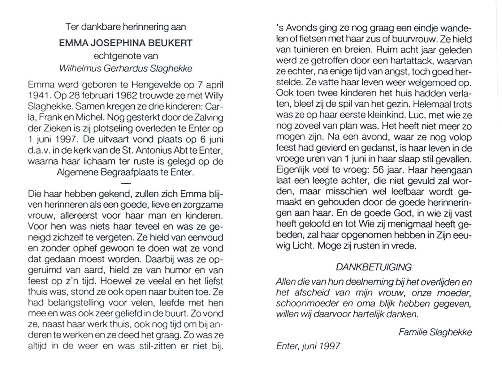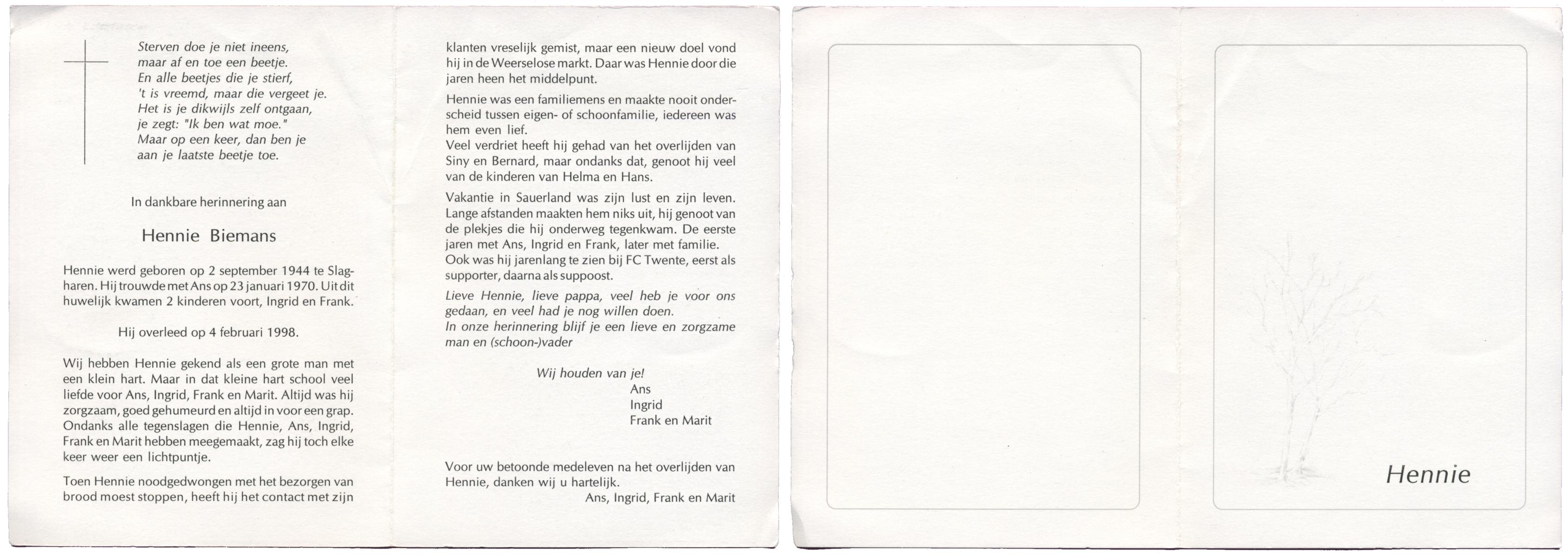BIEMANS, Hennie, geboren op 2-9-1944 te Slagharen, overleden op 4-2-1998 op 53-jarige leeftijd.
