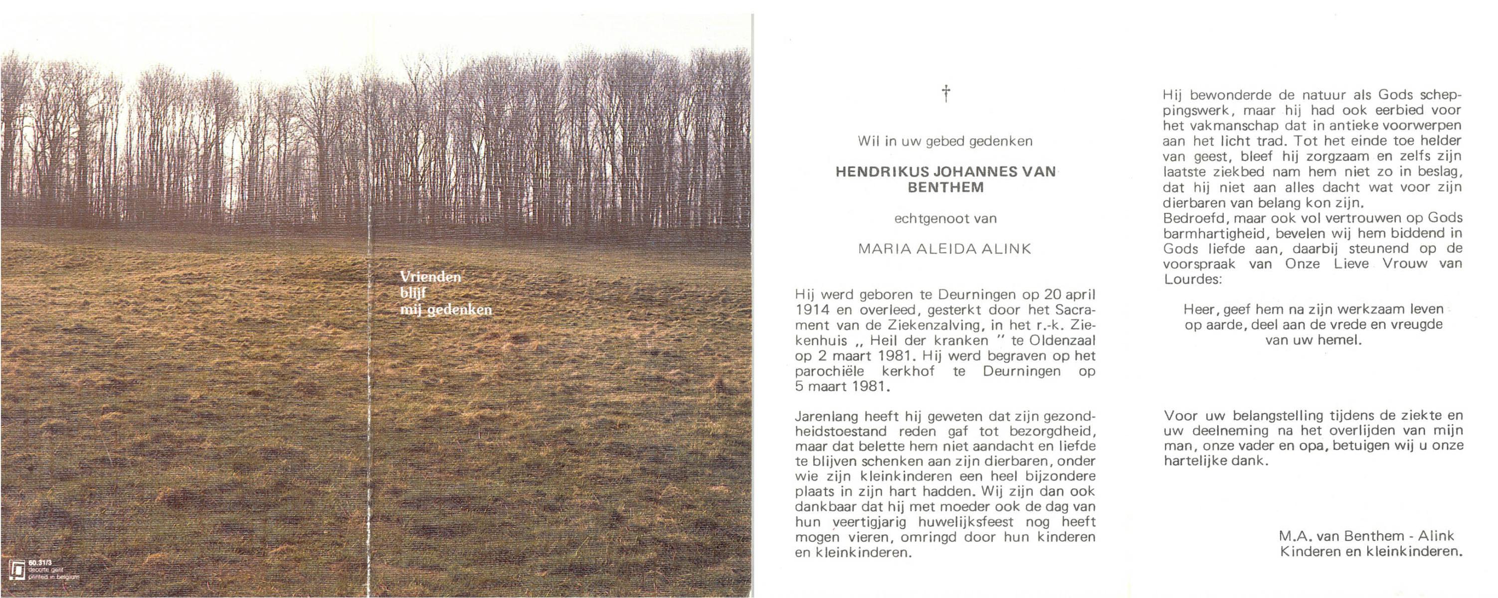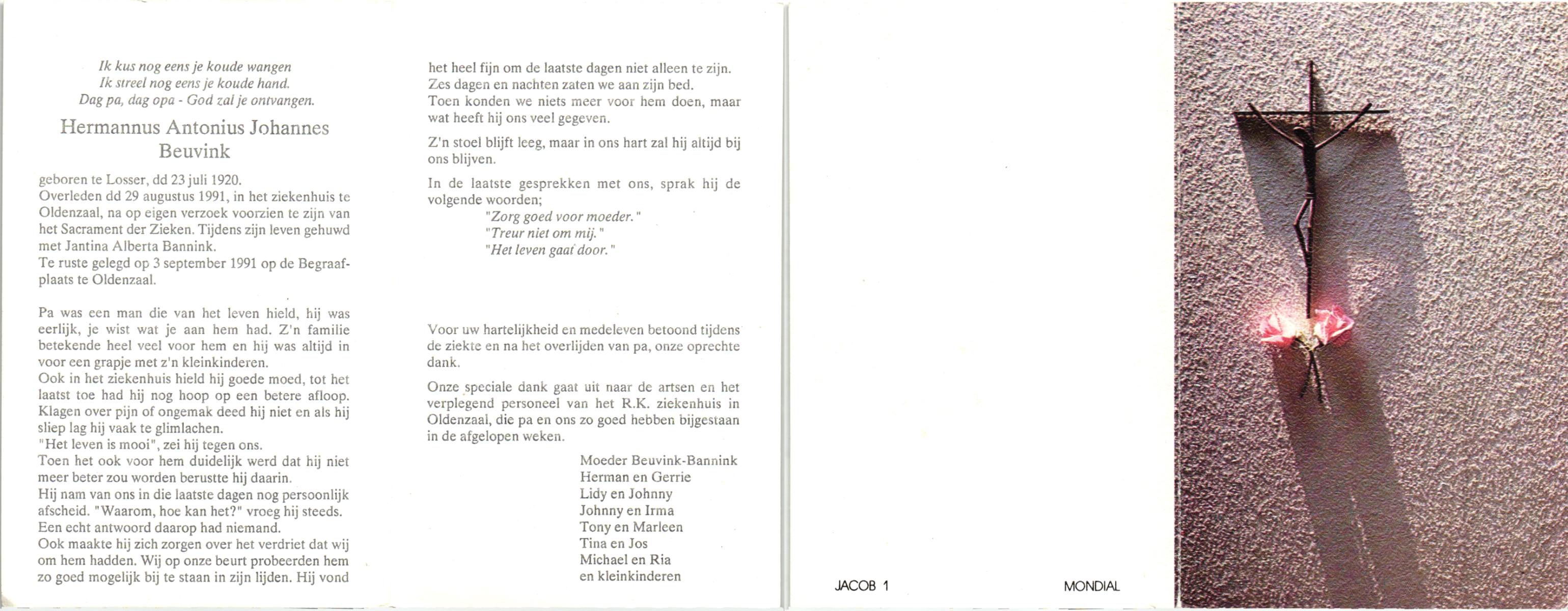 BEUVINK, , Hermannus Antonius Johannes, geboren op 23-7-1920 te Losser, overleden op 29-8-1991 te Oldenzaal op 71-jarige leeftijd, begraven op 3-9-1991 te Oldenzaal.