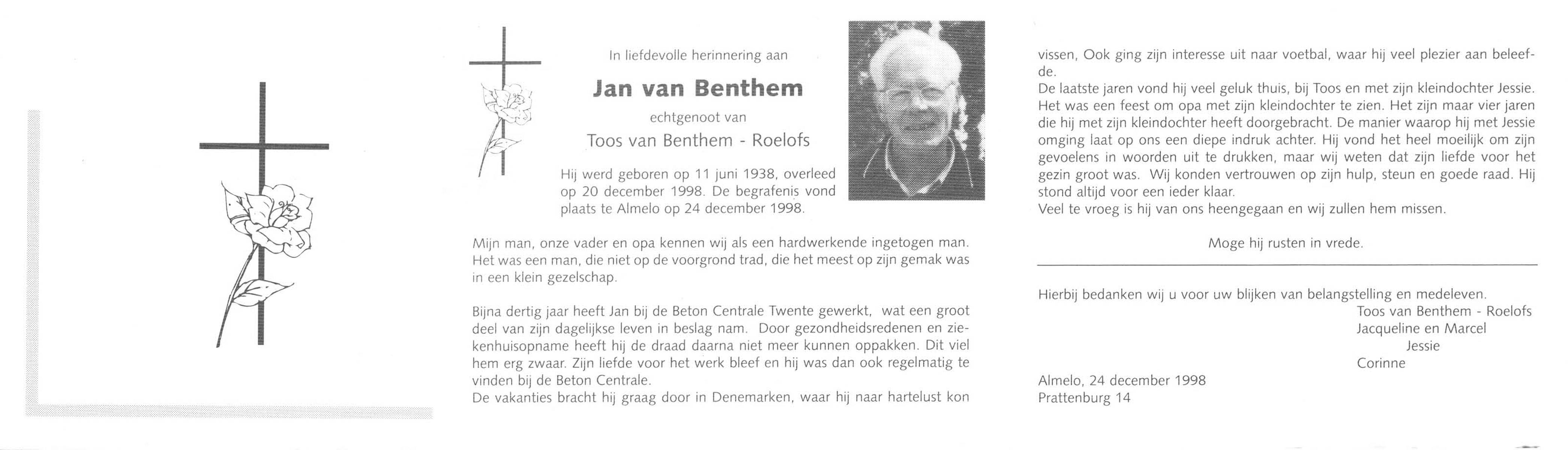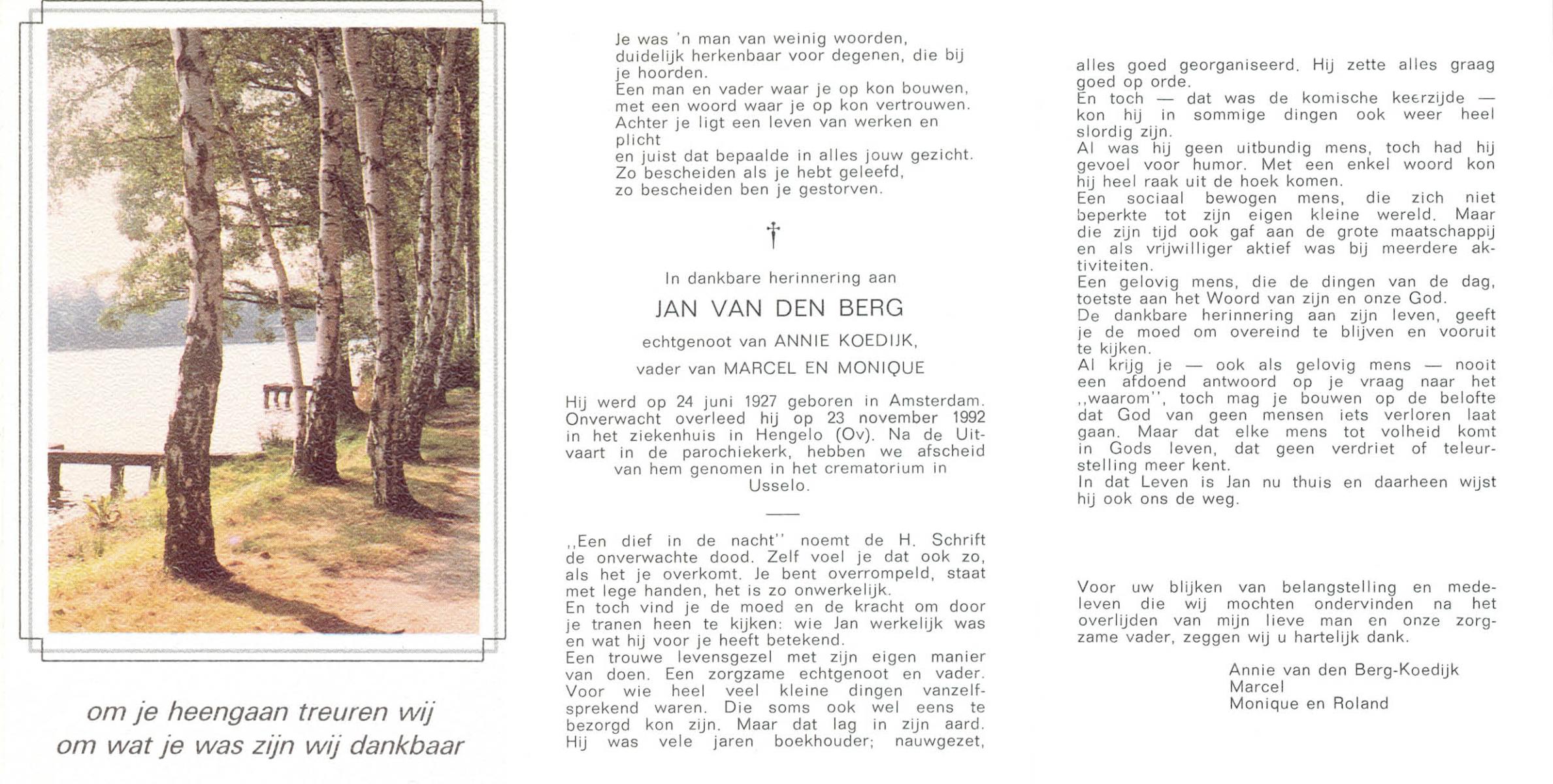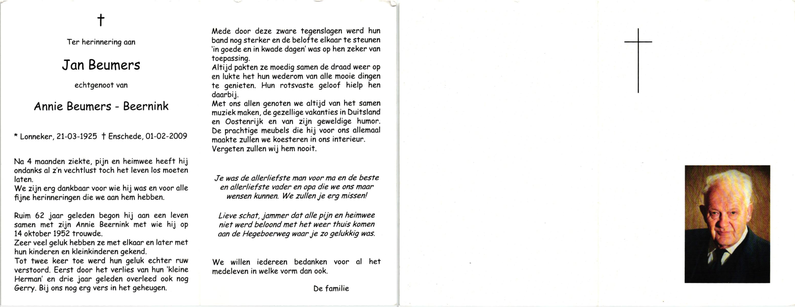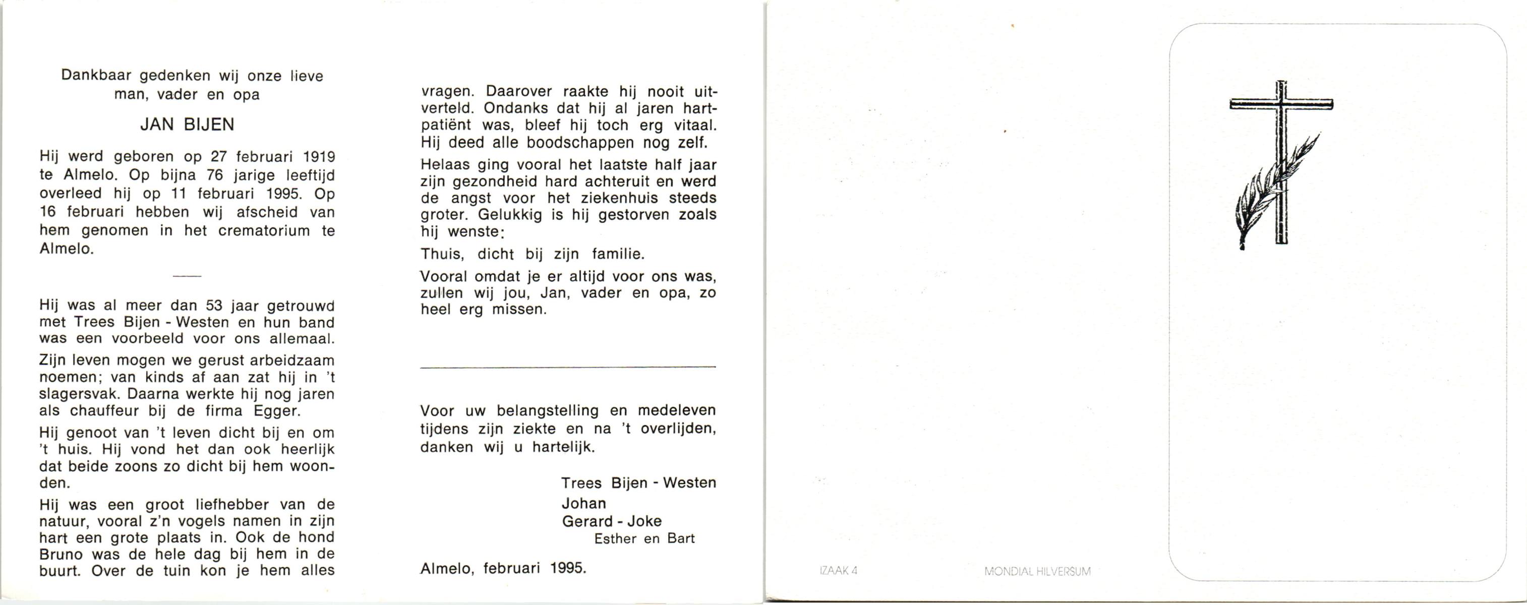 BIJEN, Jan, geboren op 27-2-1919 te Almelo, overleden op 11-2-1995 op 75-jarige leeftijd, gecremeerd op 16-2-1995 te Almelo.