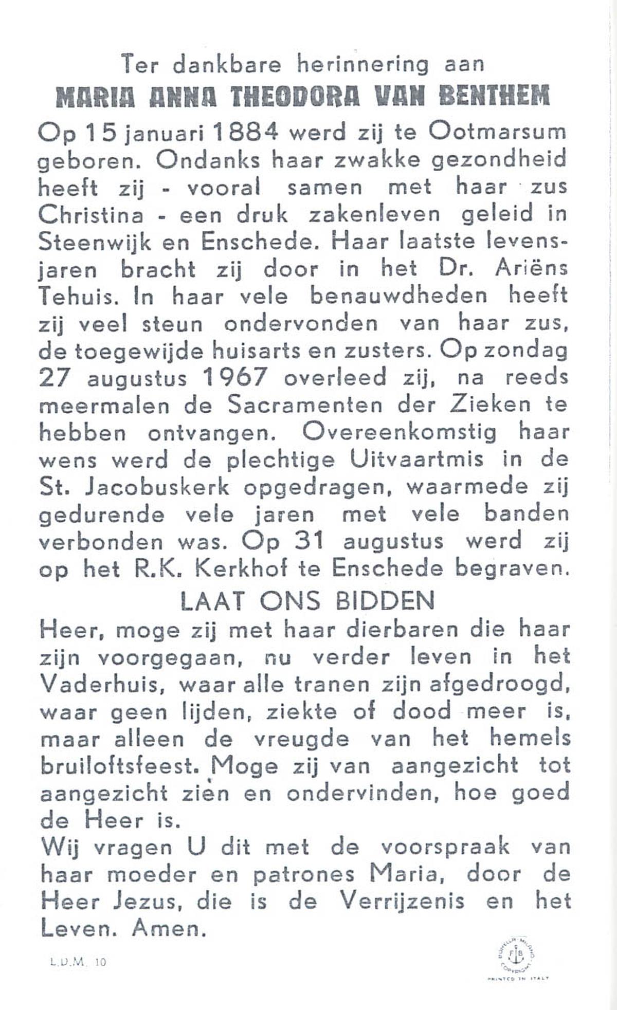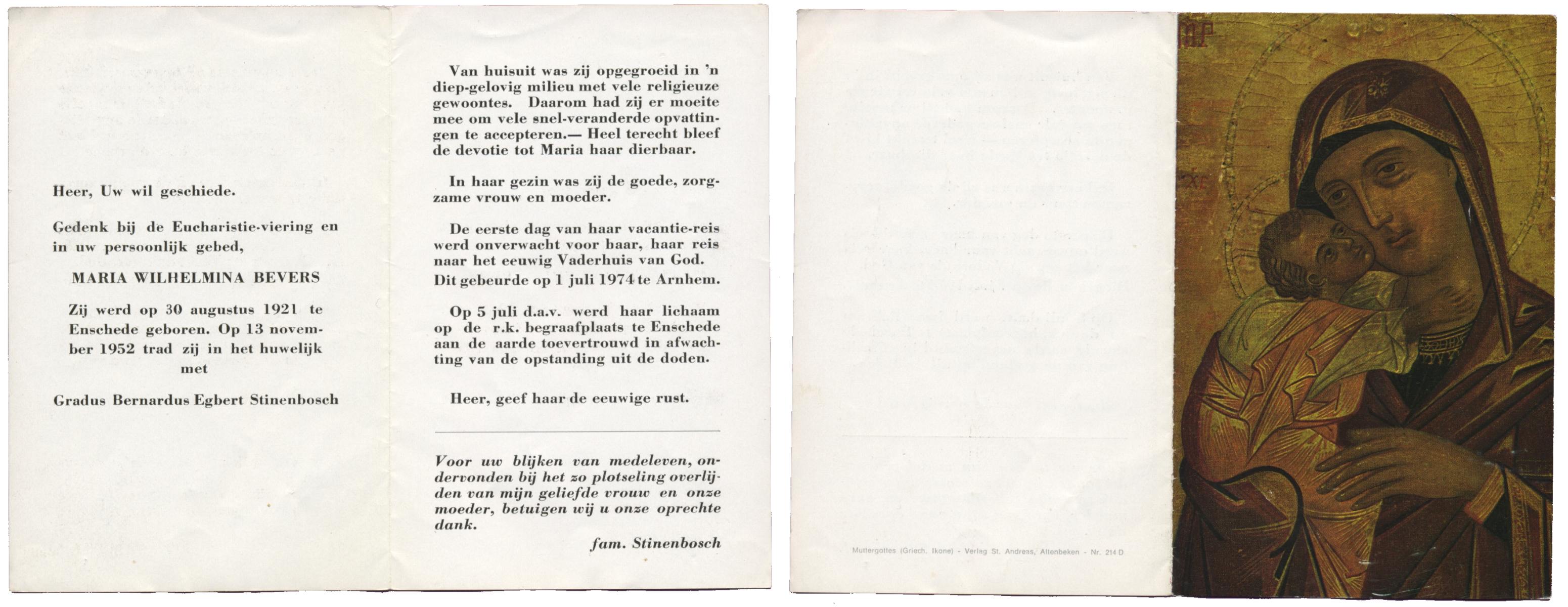 BEVERS, Maria Wilhelmina, geboren op 30-8-1921 te Enschede, overleden op 1-7-1974 te Arnhem op 52-jarige leeftijd, begraven op 5-7-1974 te Enschede.