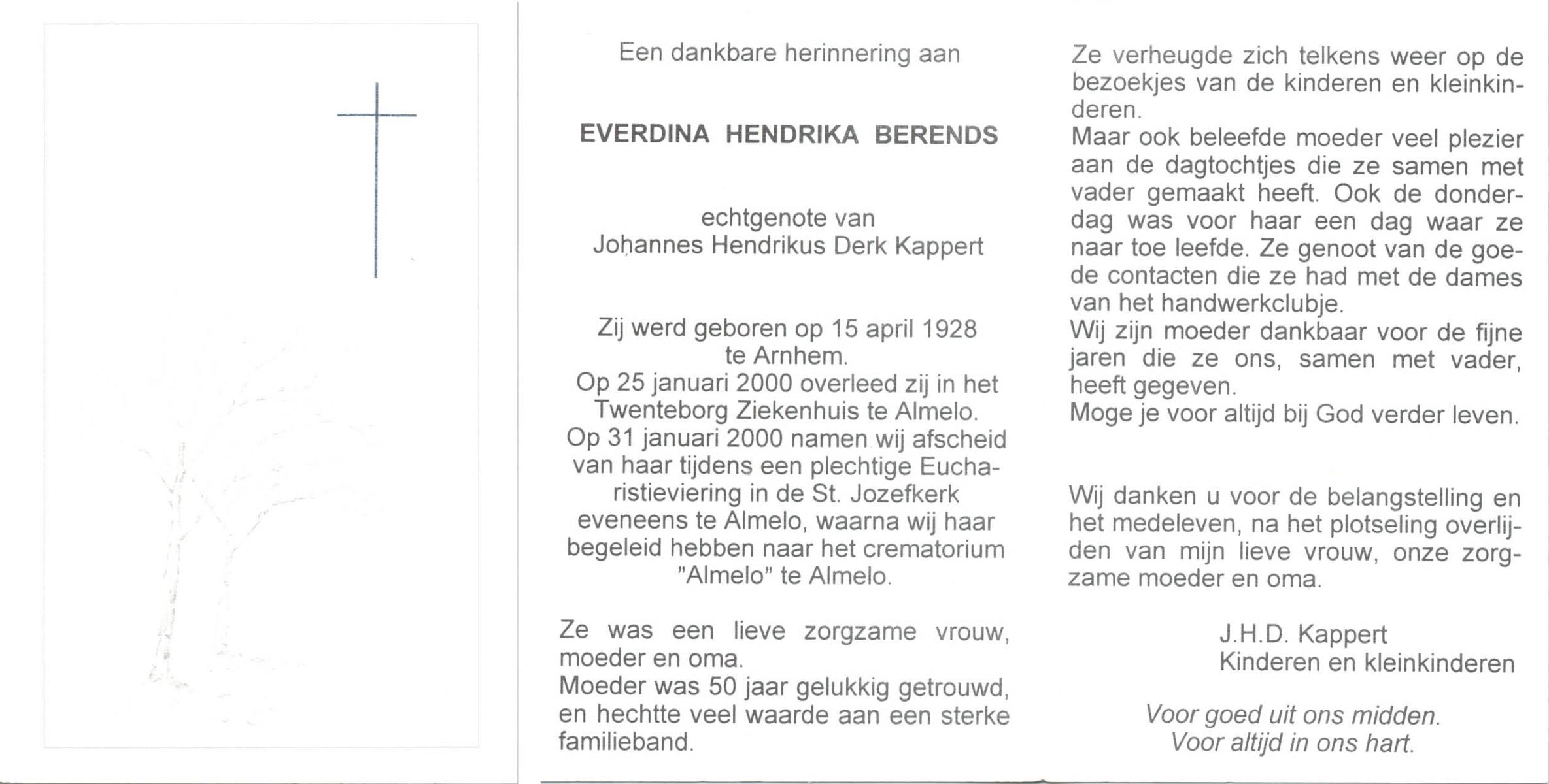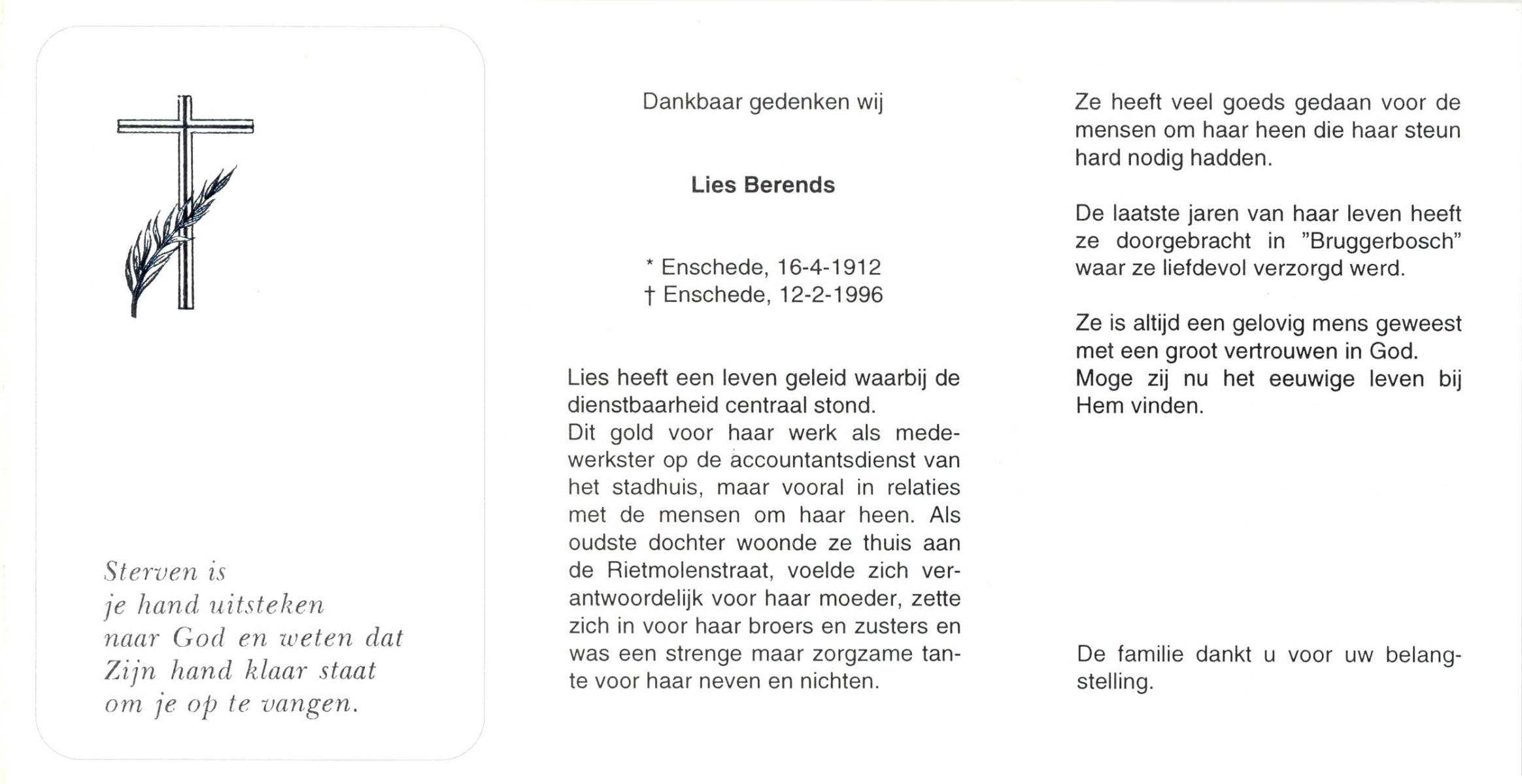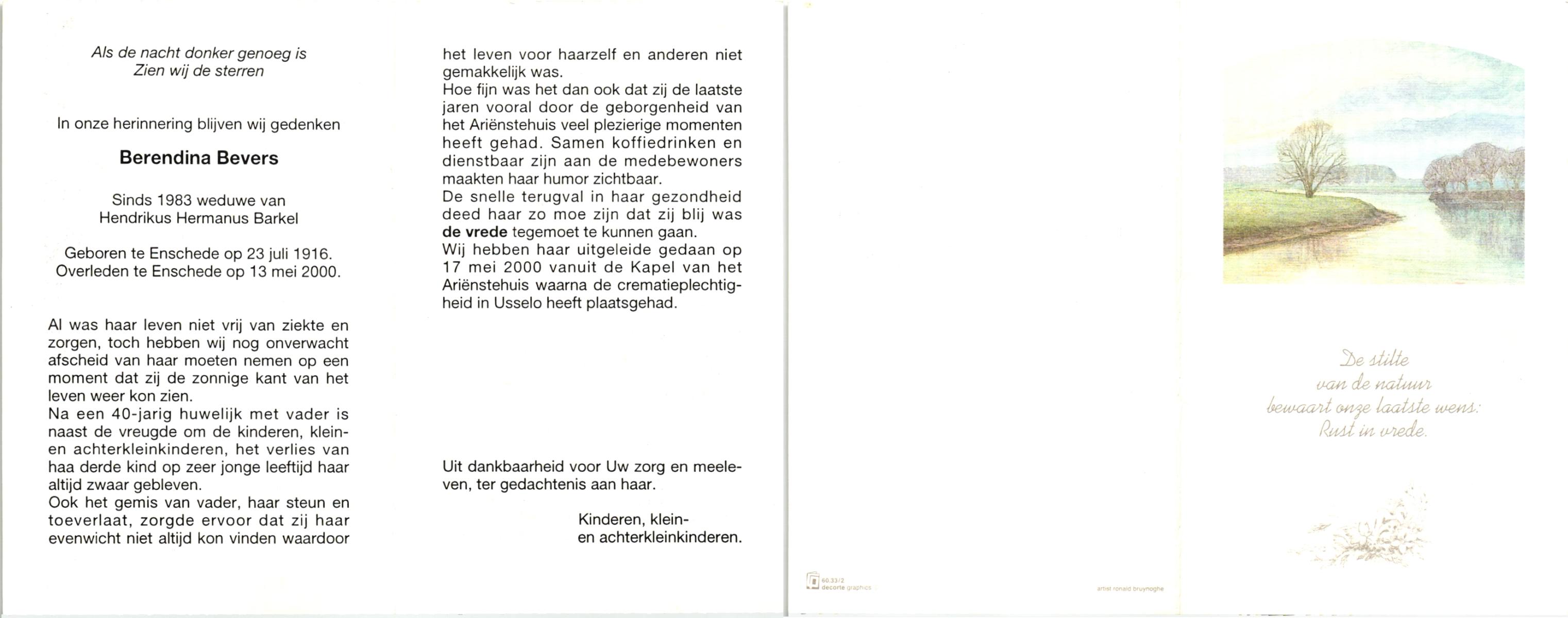 BEVERS, , Berendina, geboren op 23-7-1916 te Enschede, overleden op 13-5-2000 te Enschede op 83-jarige leeftijd.