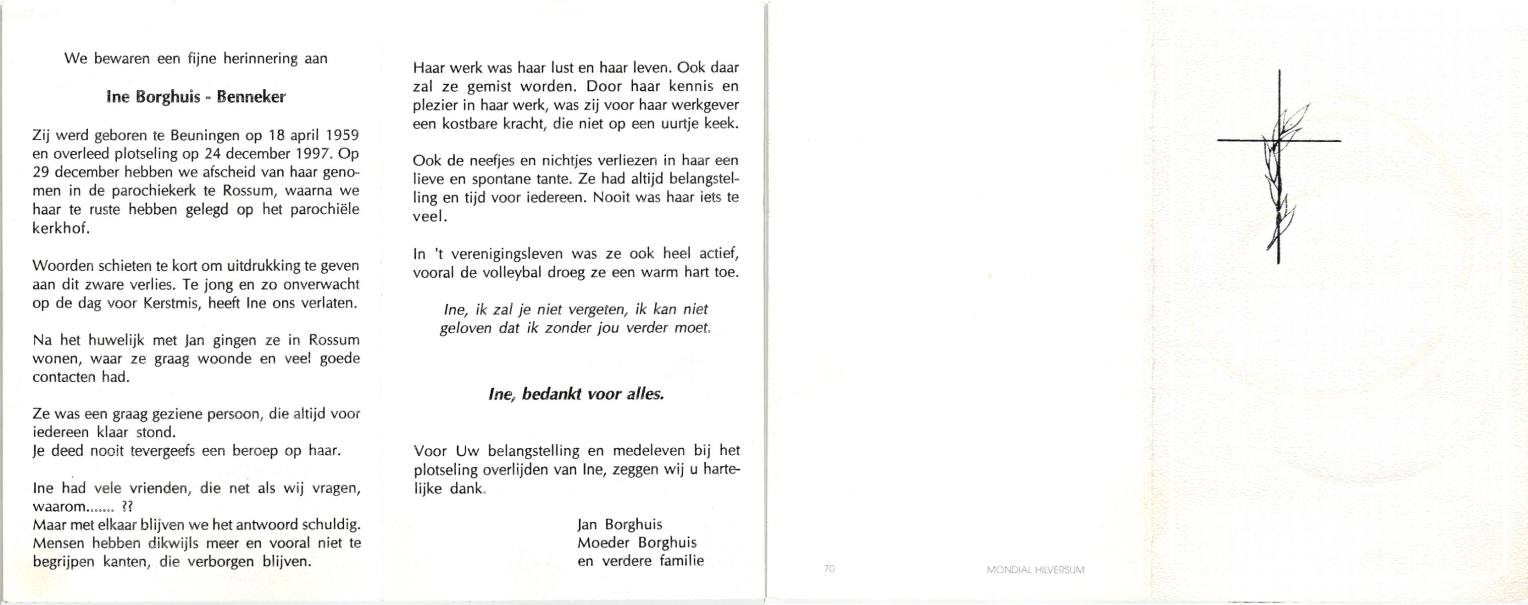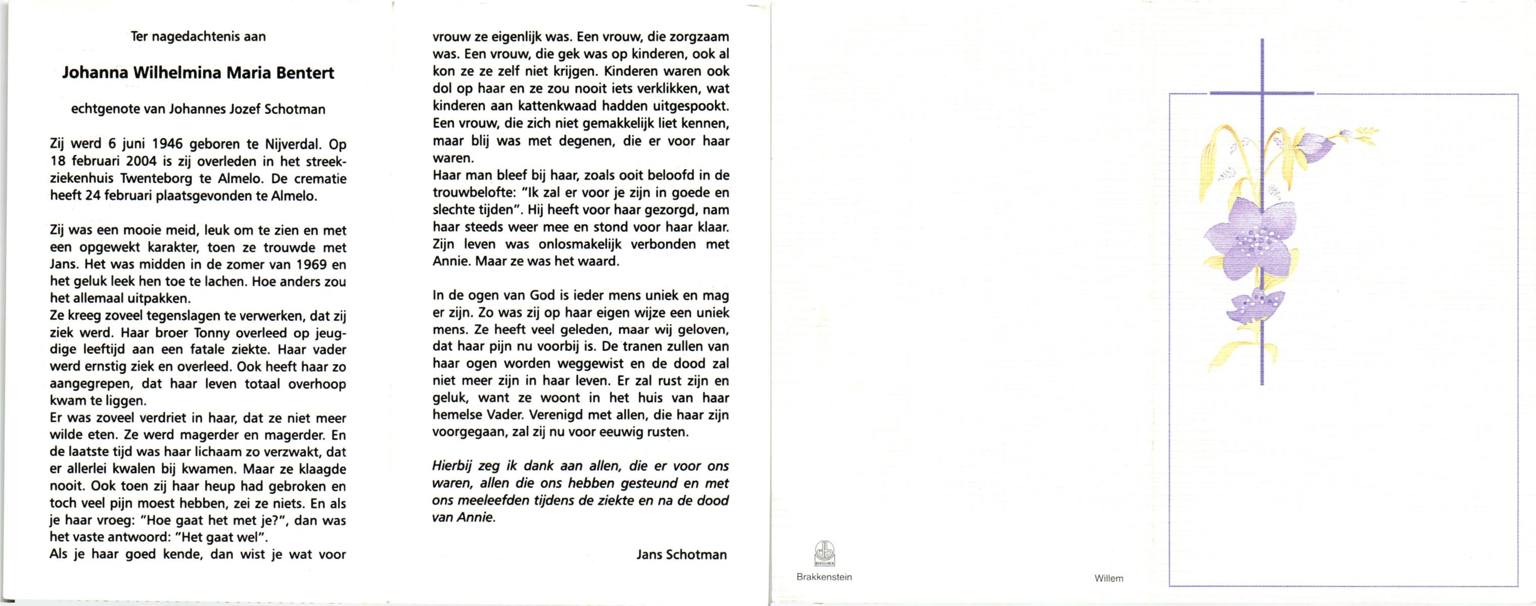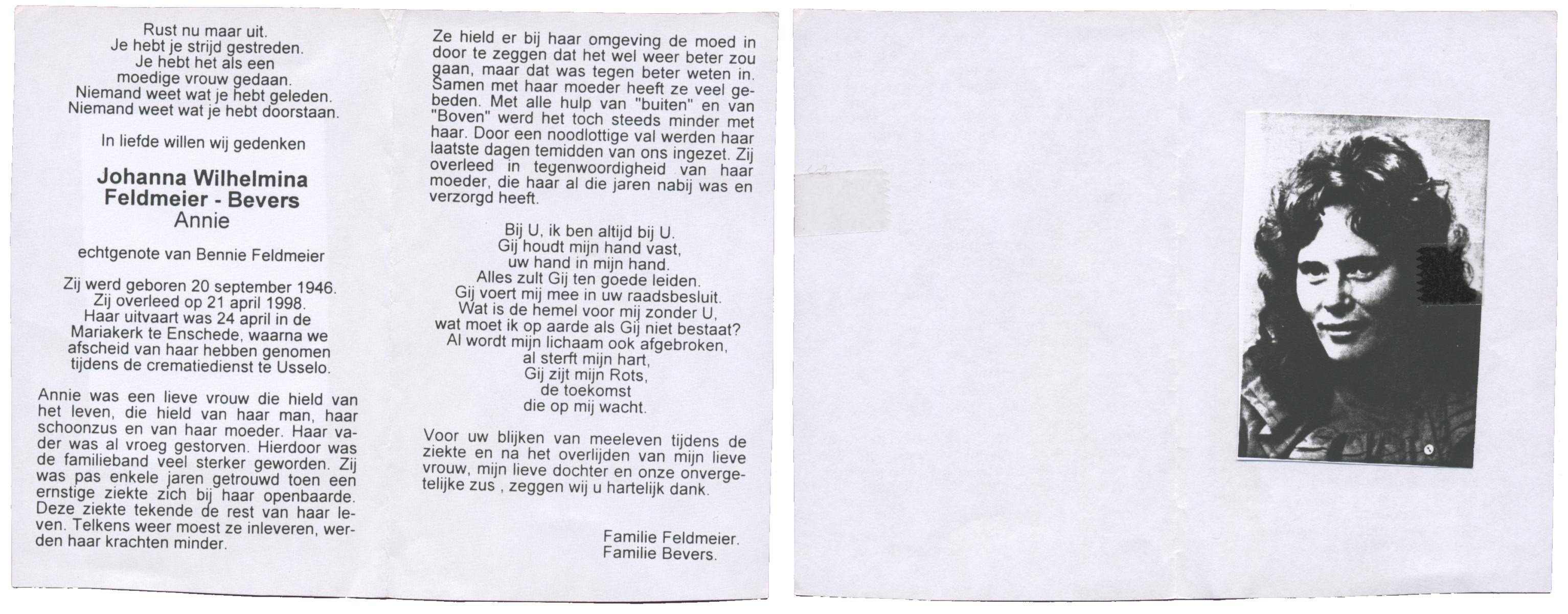 BEVERS, Johanna Wilhelmina (Annie), geboren op 20-9-1946, overleden op 21-4-1998 op 51-jarige leeftijd, gecremeerd op 24-4-1998 te Usselo.