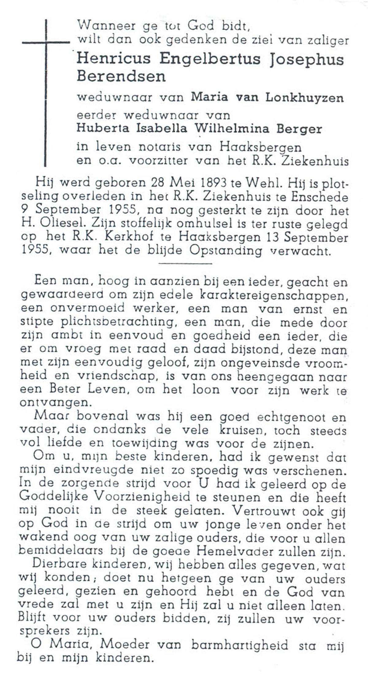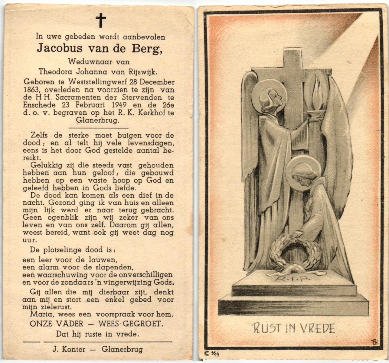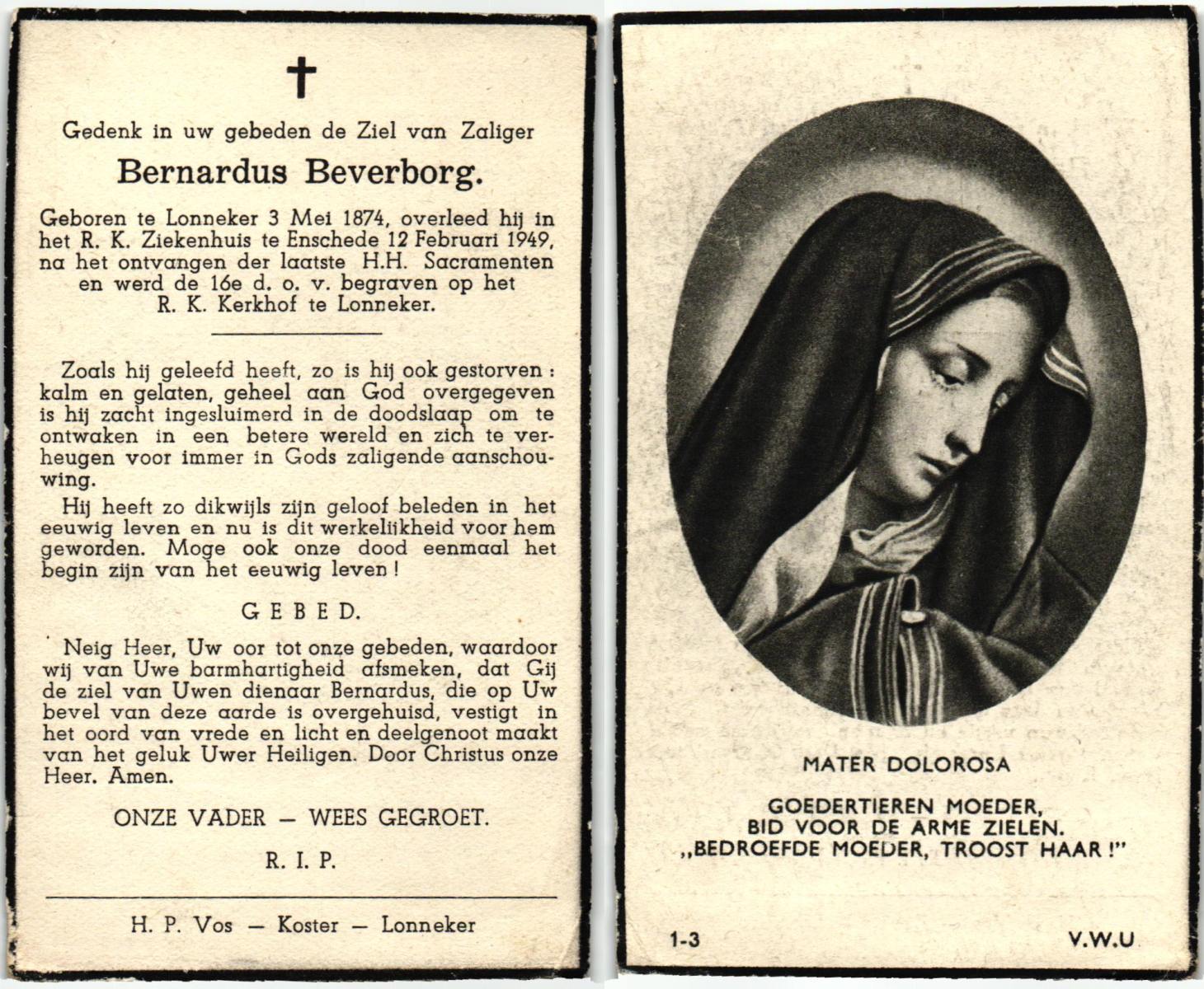 BEVERBORG, Bernardus, geboren op 03-05-1874 te Lonneker, overleden op 12-2-1949 te Enschede, ziekenhuis op 74-jarige leeftijd, begraven op 16-2-1949 te Lonneker.