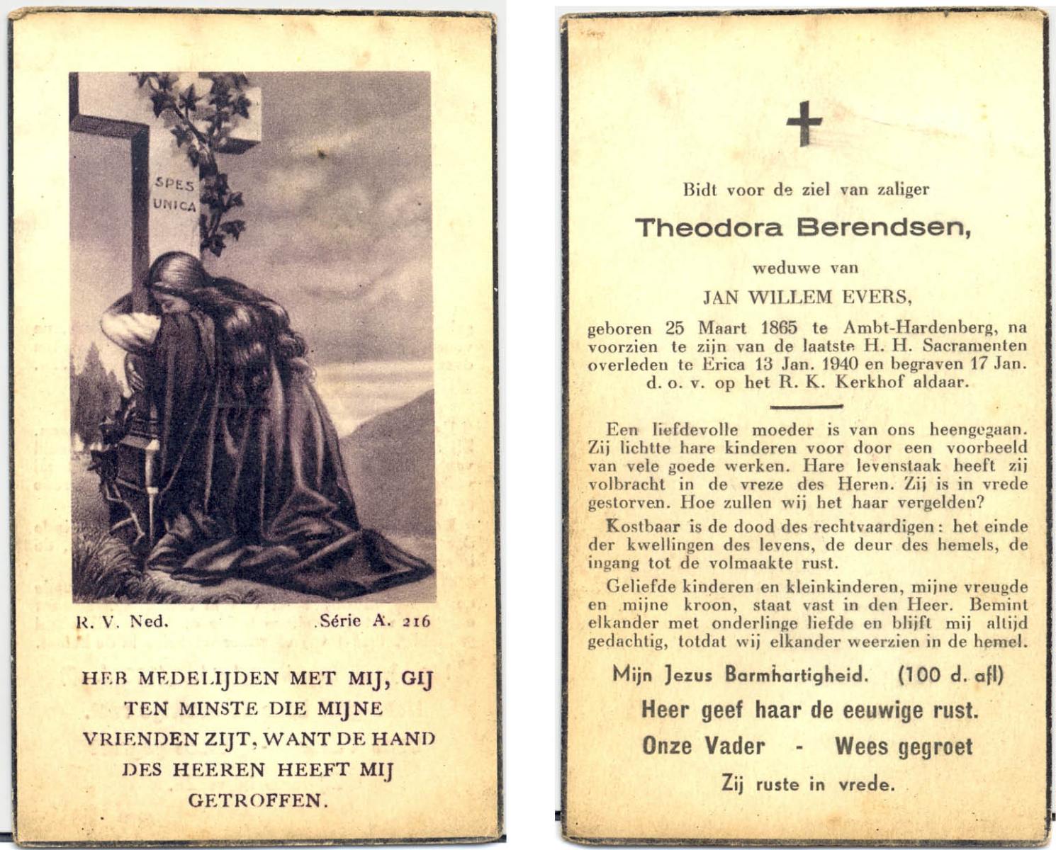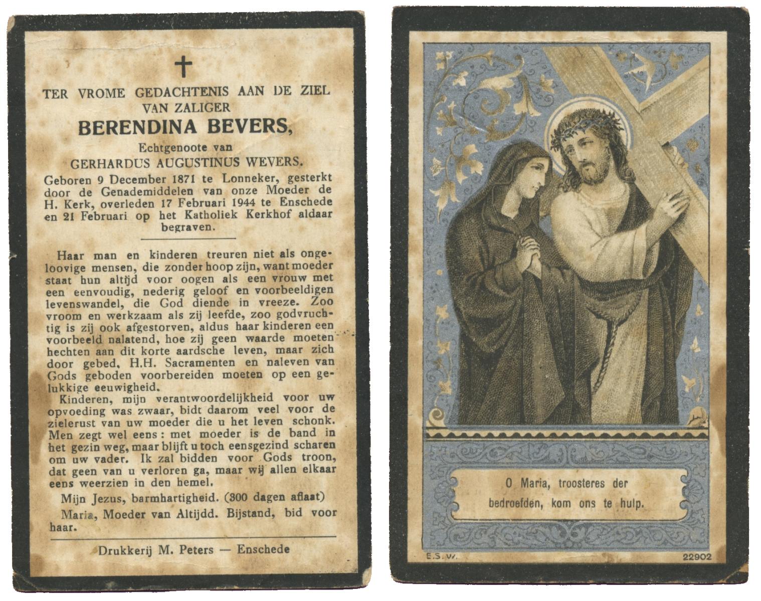 BEVERS, Berendina, geboren op 09-12-1871 te Lonneker, overleden op 17-2-1944 te Enschede op 72-jarige leeftijd, begraven op 21-2-1944 te Enschede.
