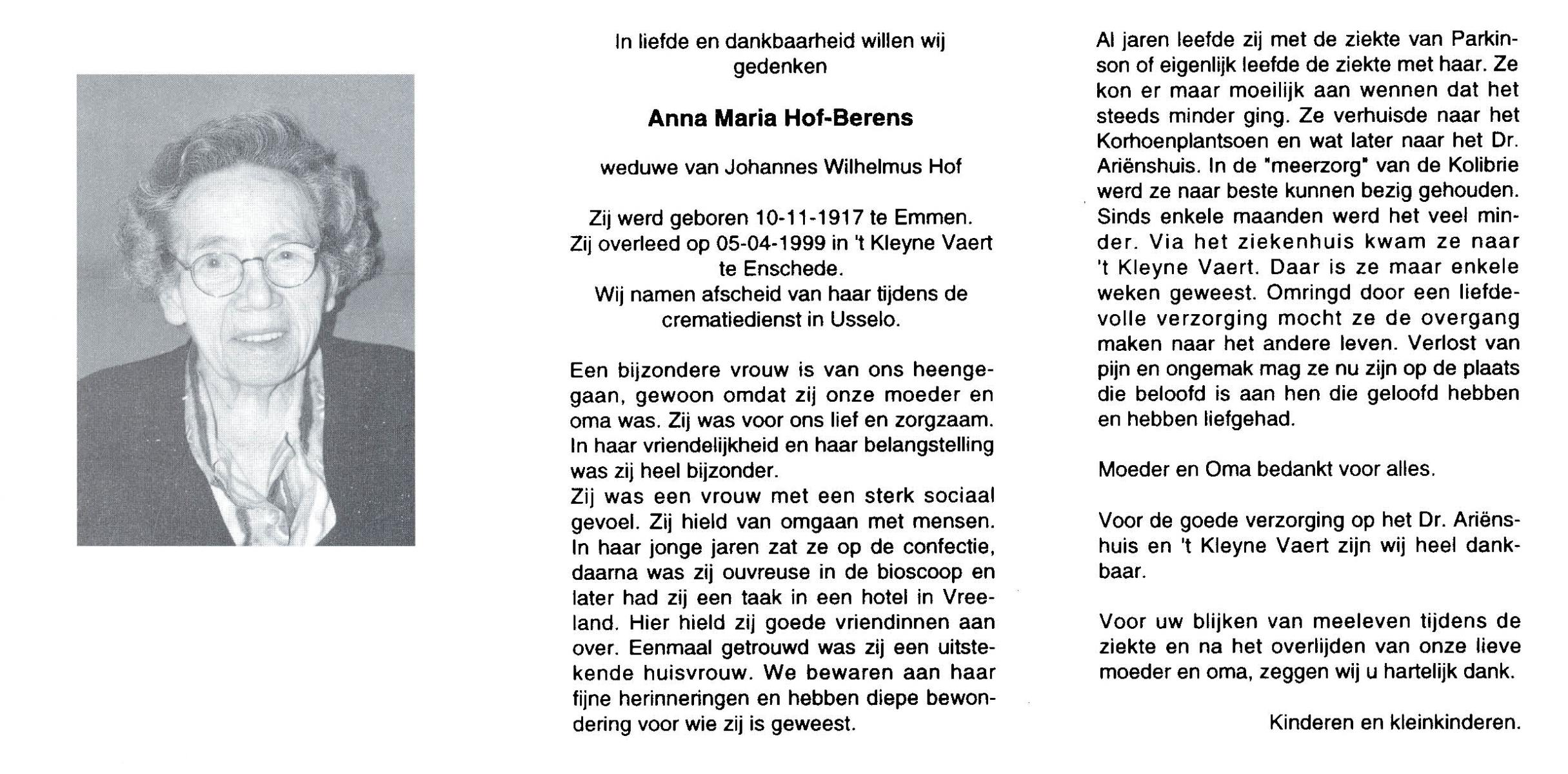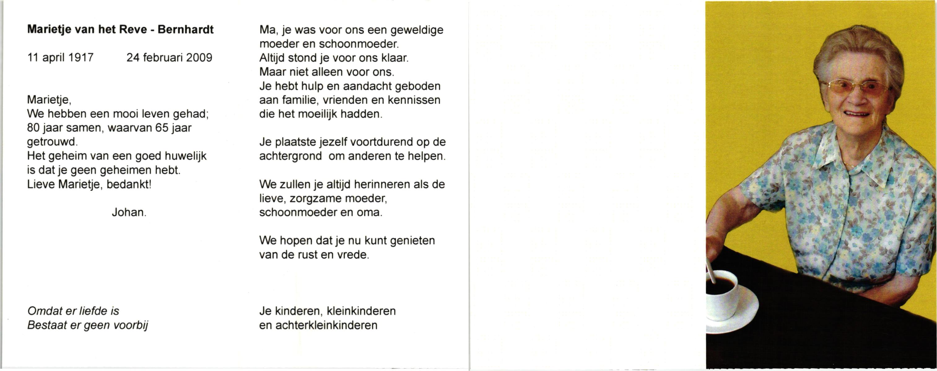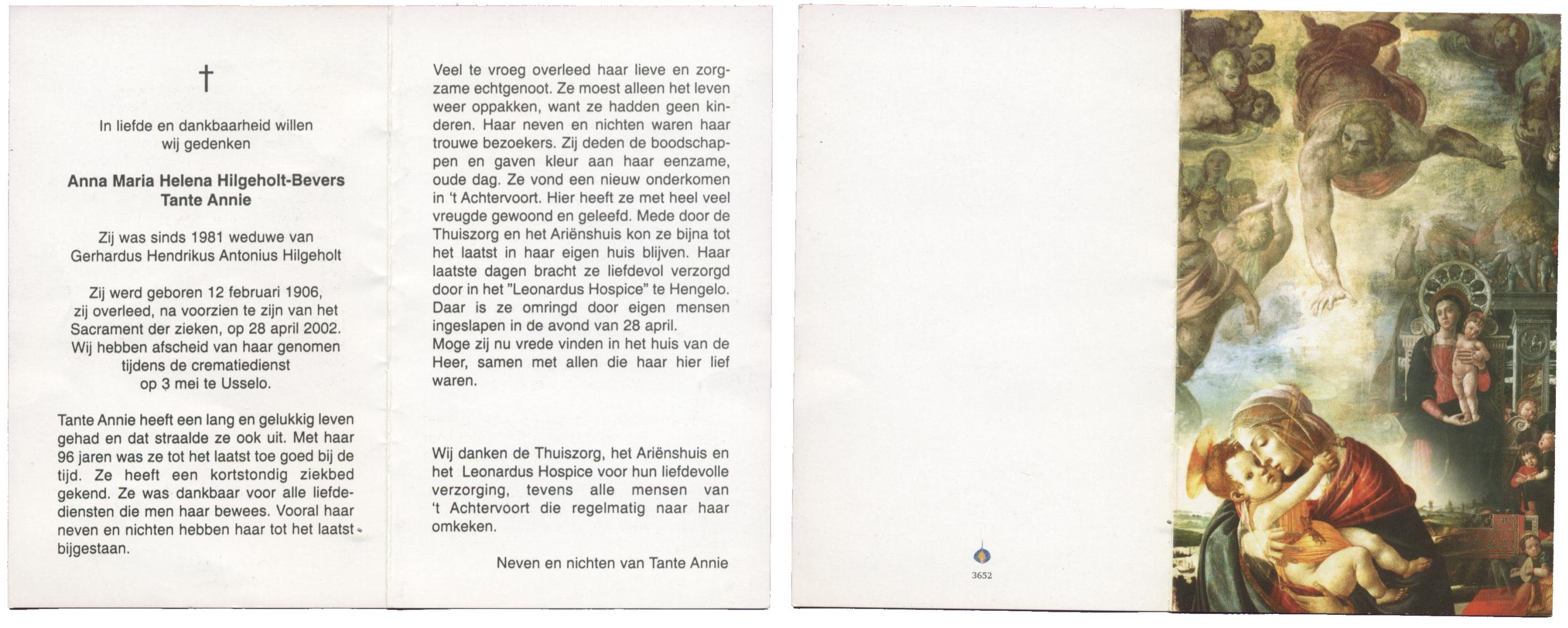 BEVERS, Anna Maria Helena, geboren op 12-2-1906, overleden op 28-4-2002 te Hengelo (Ov.) op 96-jarige leeftijd, gecremeerd op 3-5-2002 te Usselo.