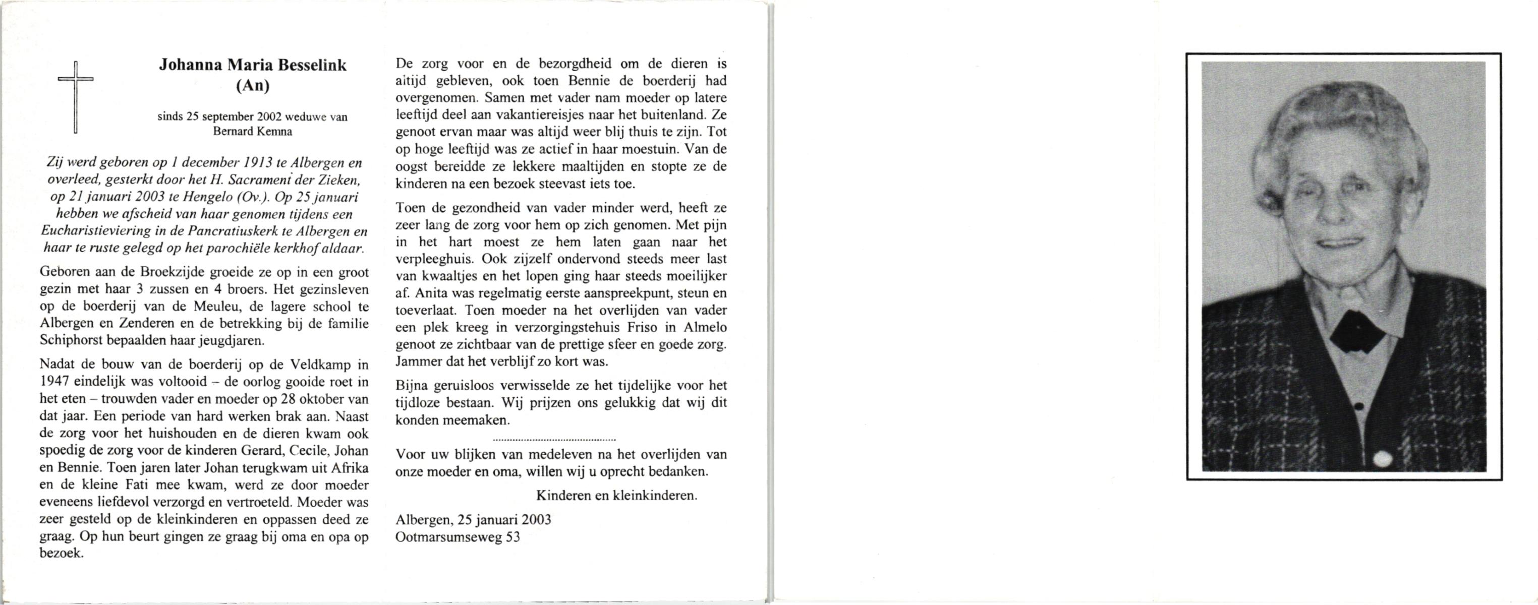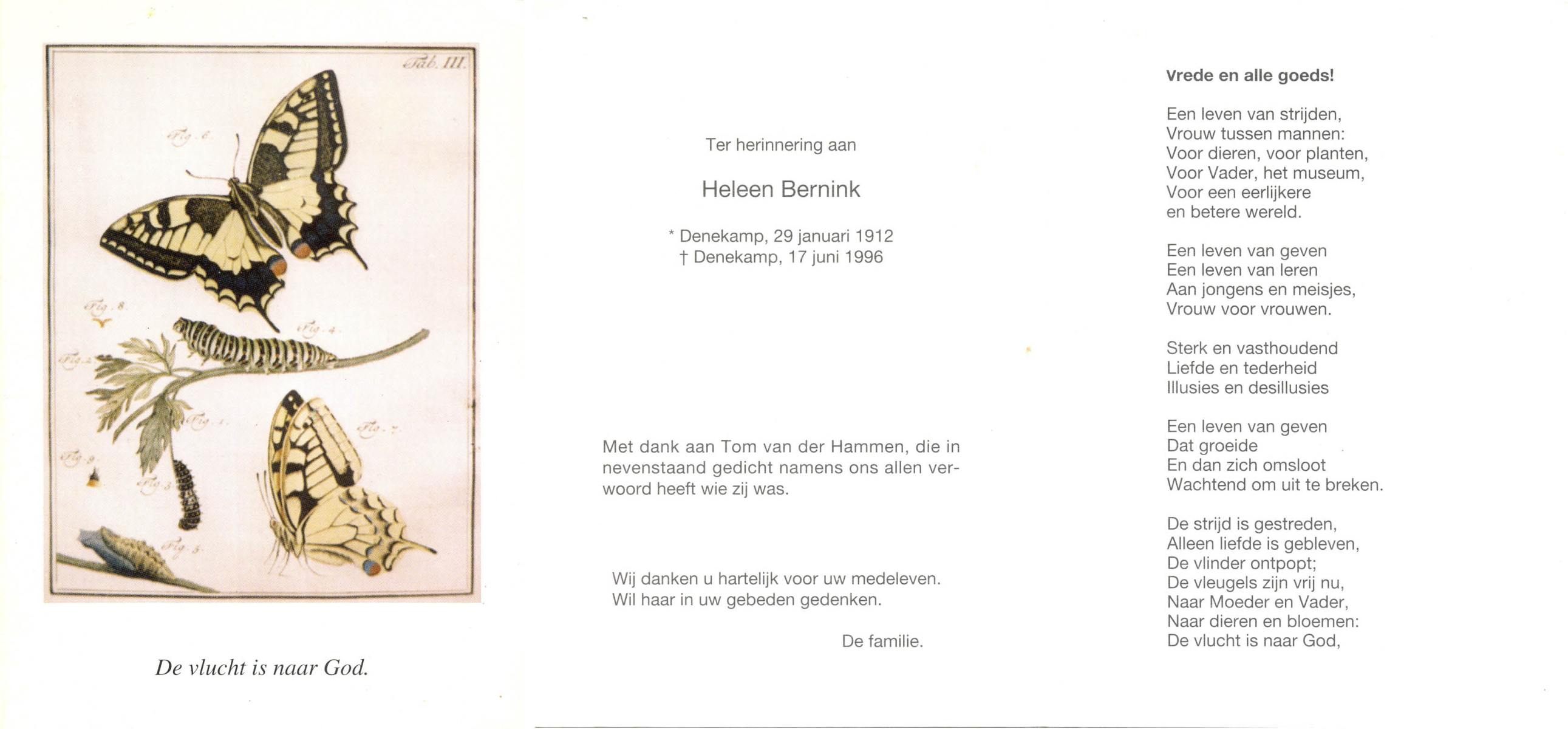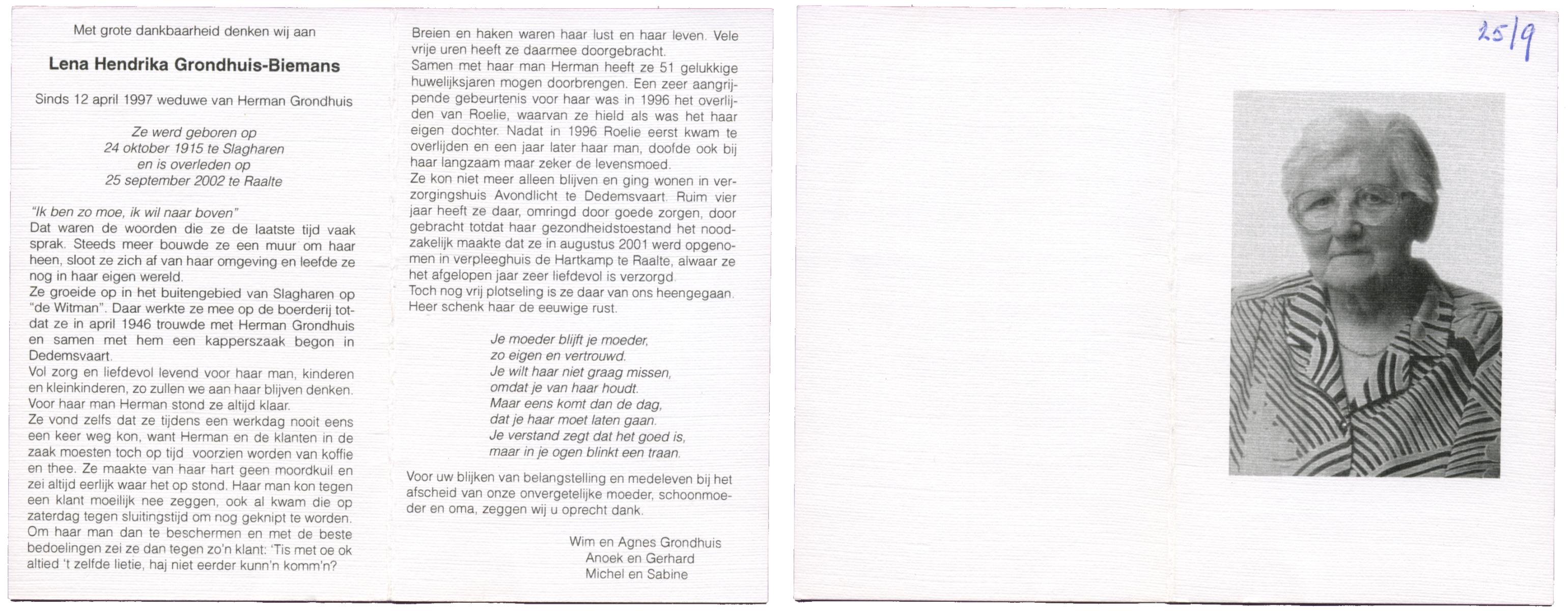 BIEMANS, Lena Hendrika, geboren op 24-10-1915 te Slagharen, overleden op 25-9-2002 te Raalte op 86-jarige leeftijd.