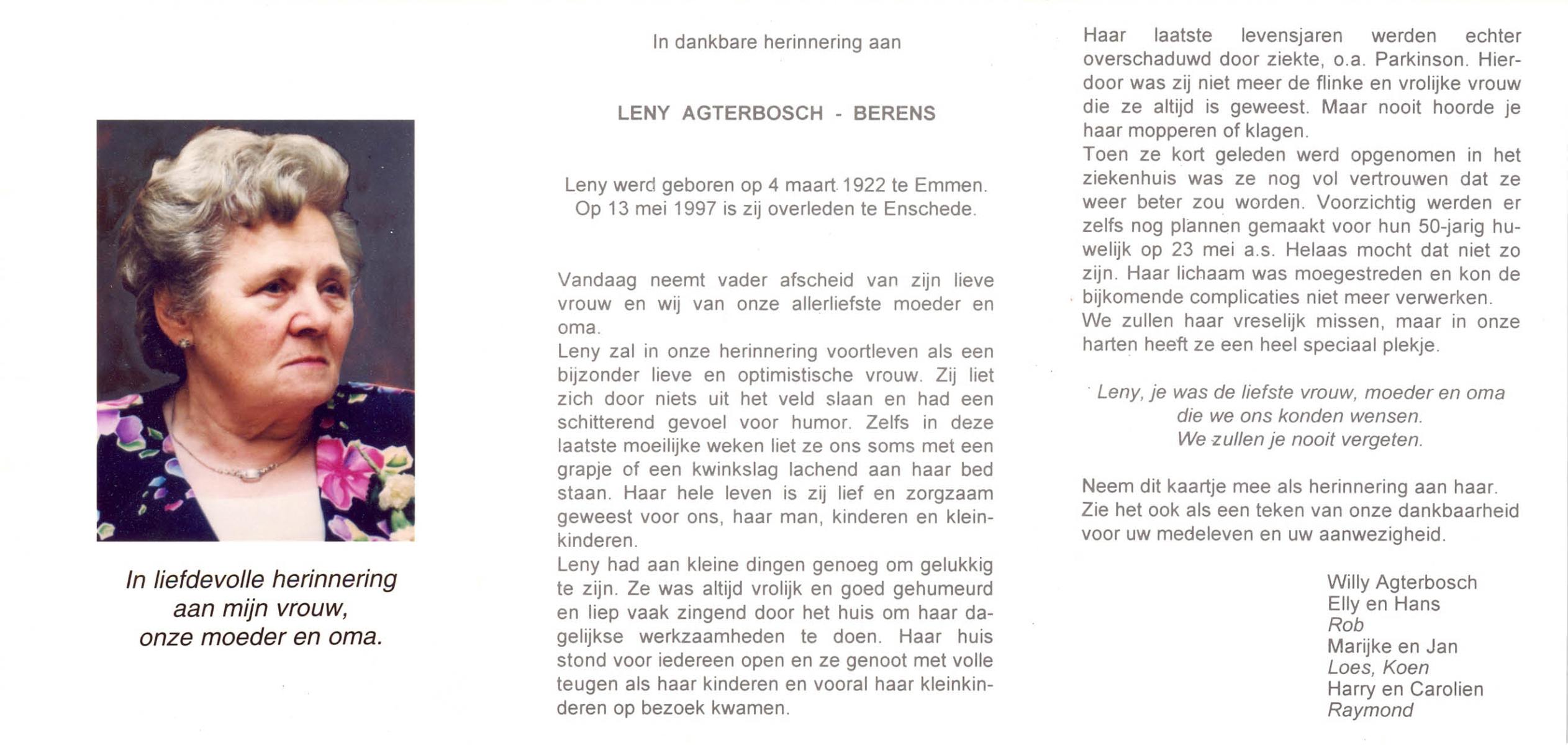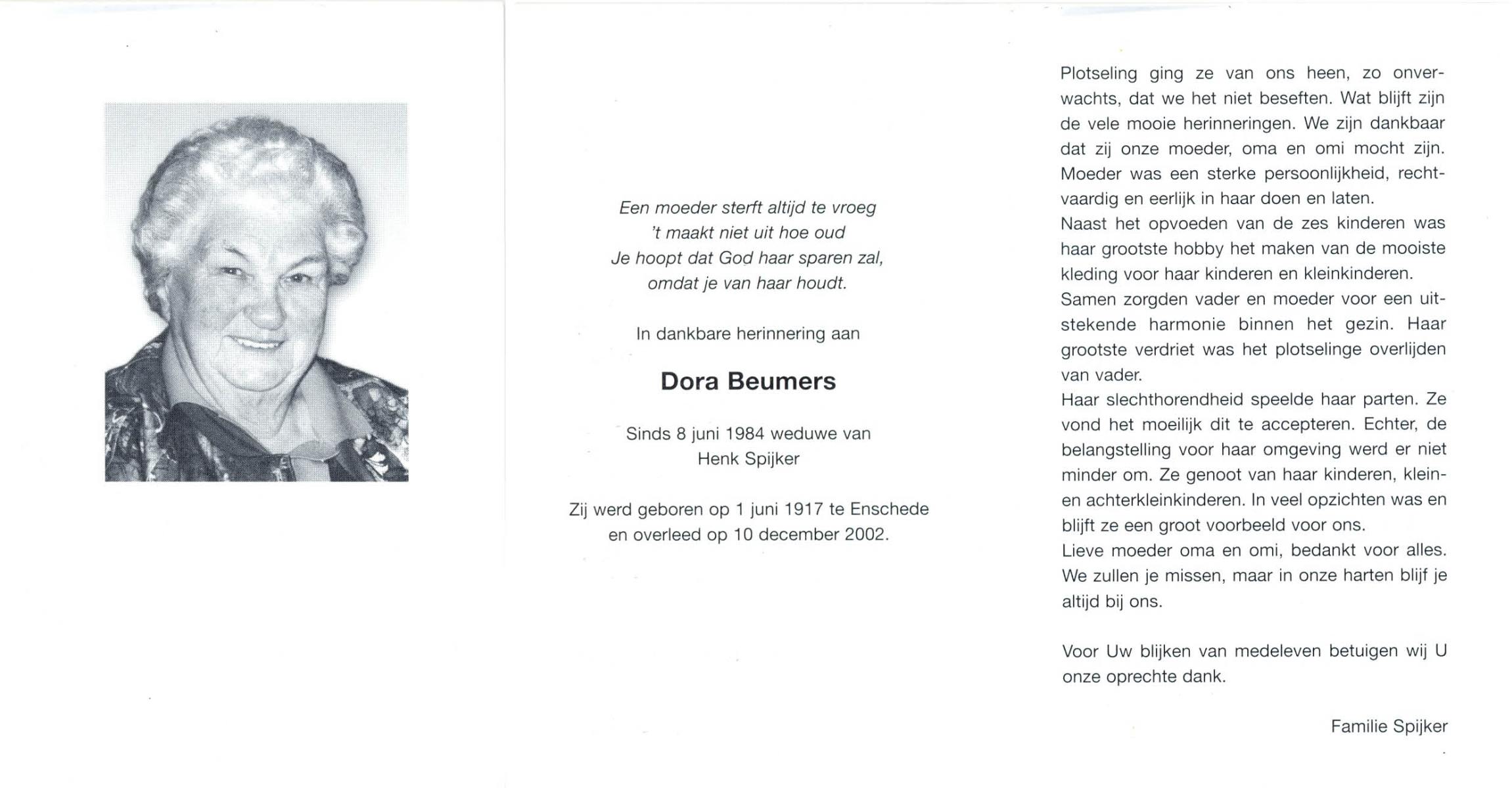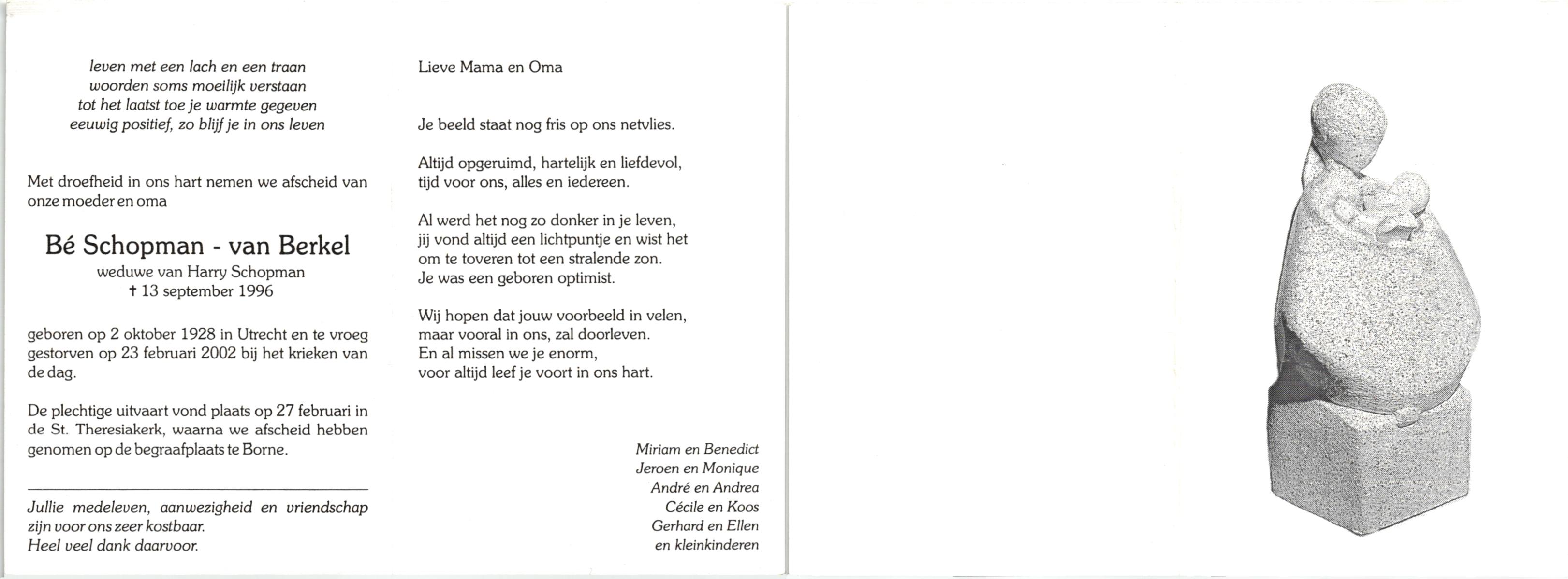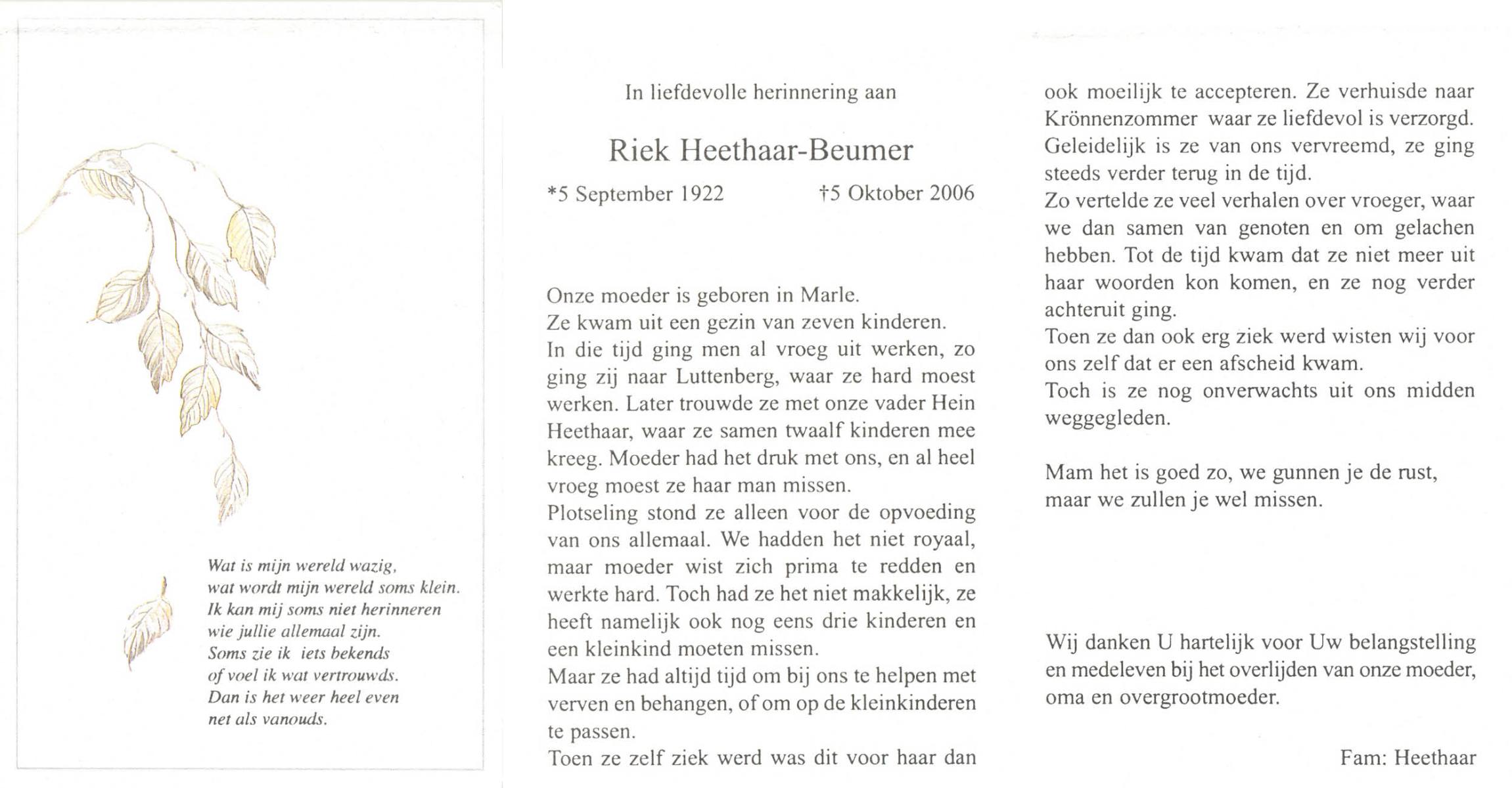 BIEMANS, Lena Hendrika, geboren op 24-10-1915 te Slagharen, overleden op 25-9-2002 te Raalte op 86-jarige leeftijd.