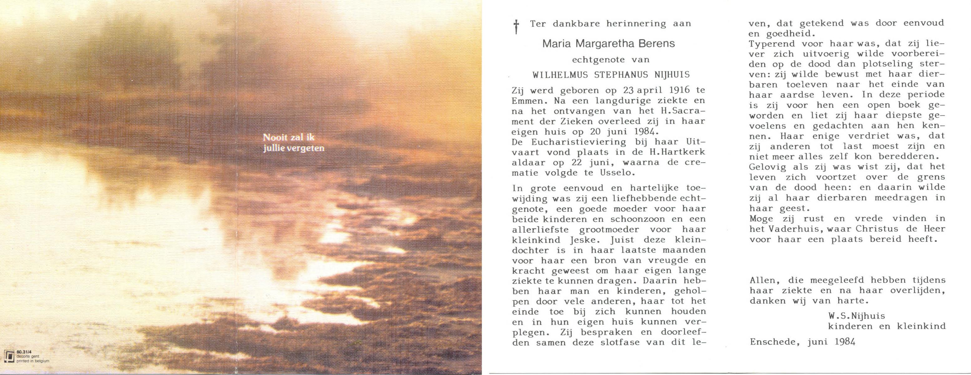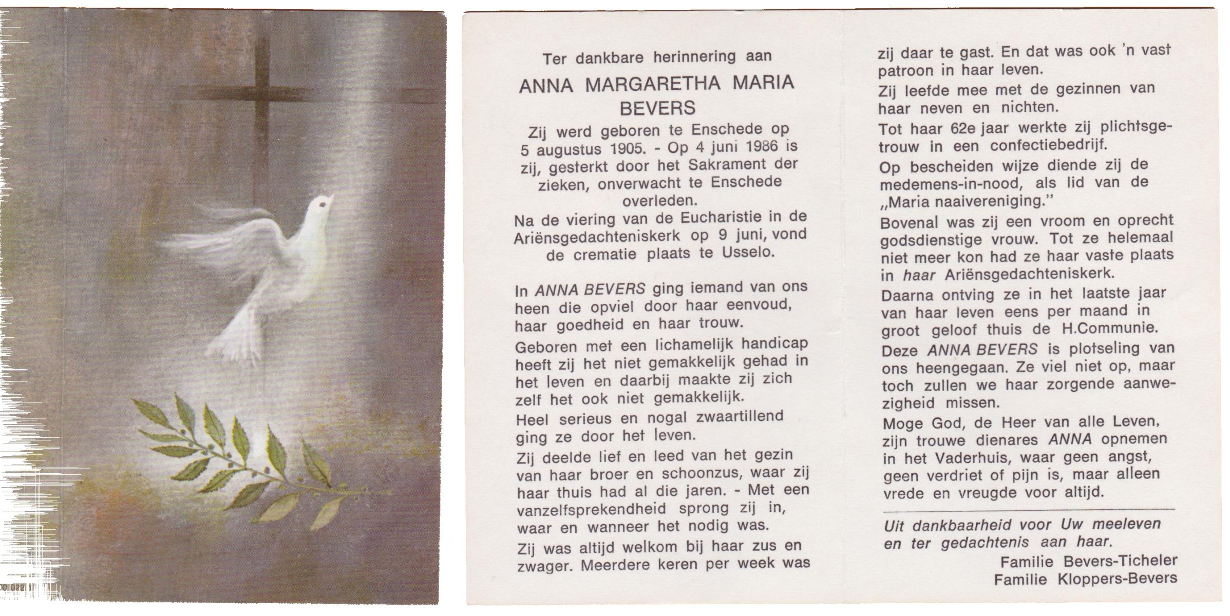 BEVERS, Anna Margaretha Maria, geboren op 5-8-1905 te Enschede, overleden op 4-6-1986 te Enschede op 80-jarige leeftijd, gecremeerd op 9-6-1986 te Usselo.