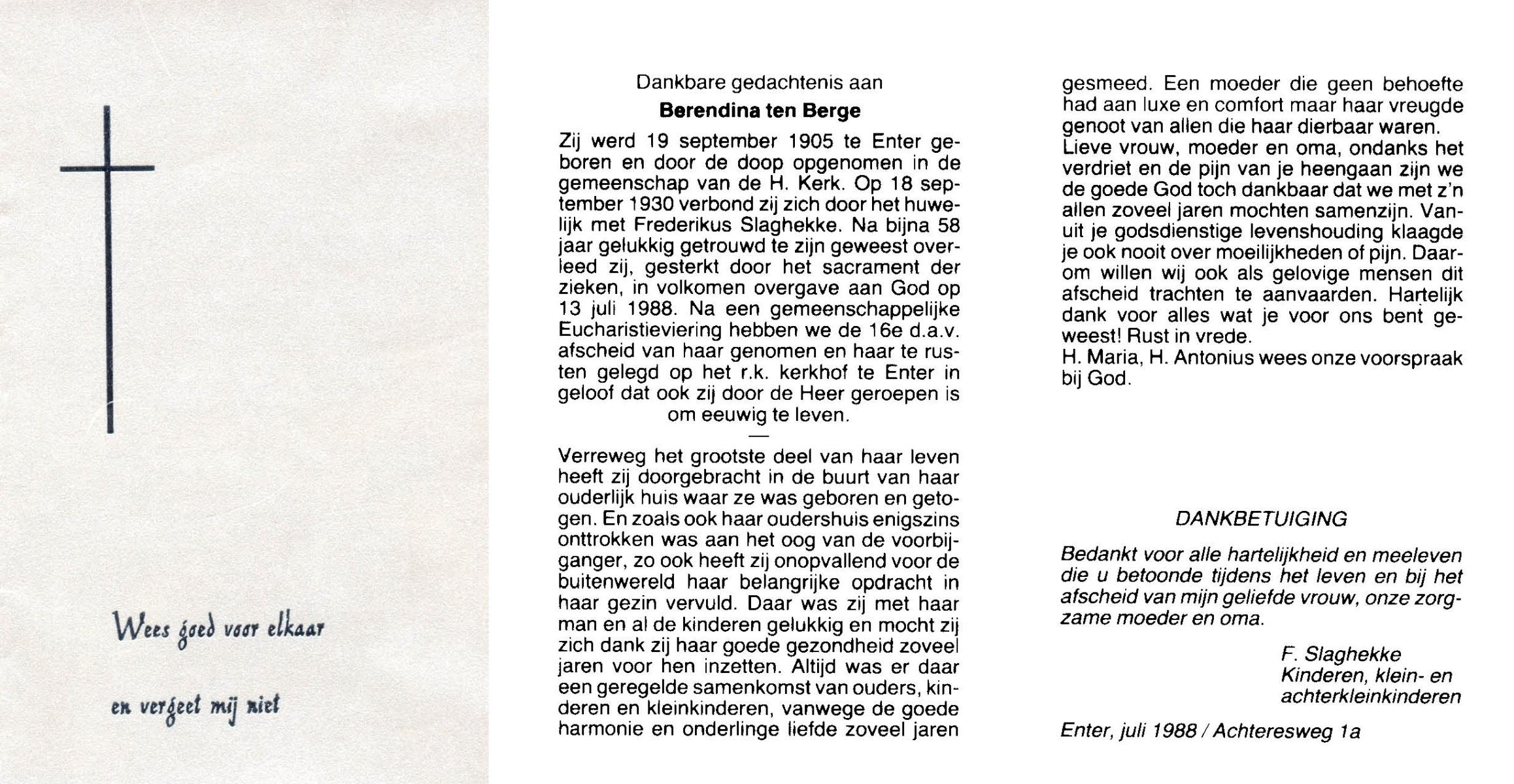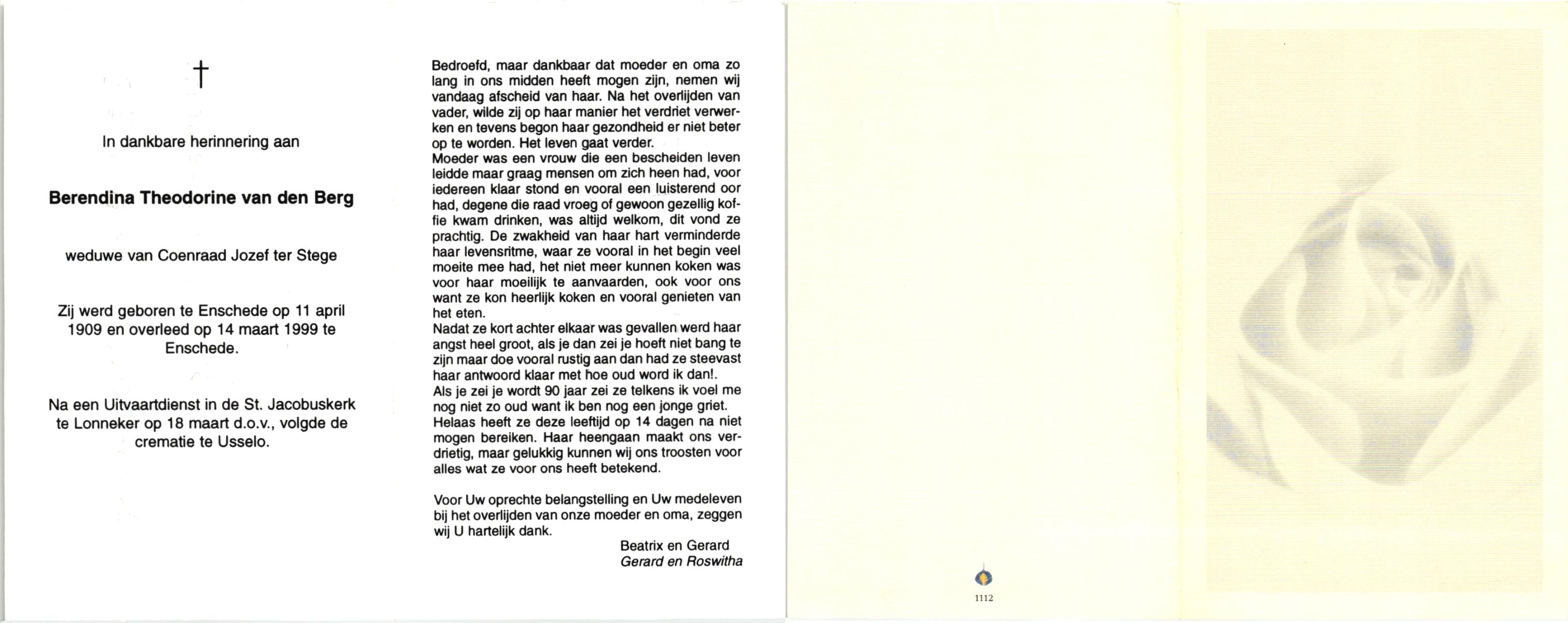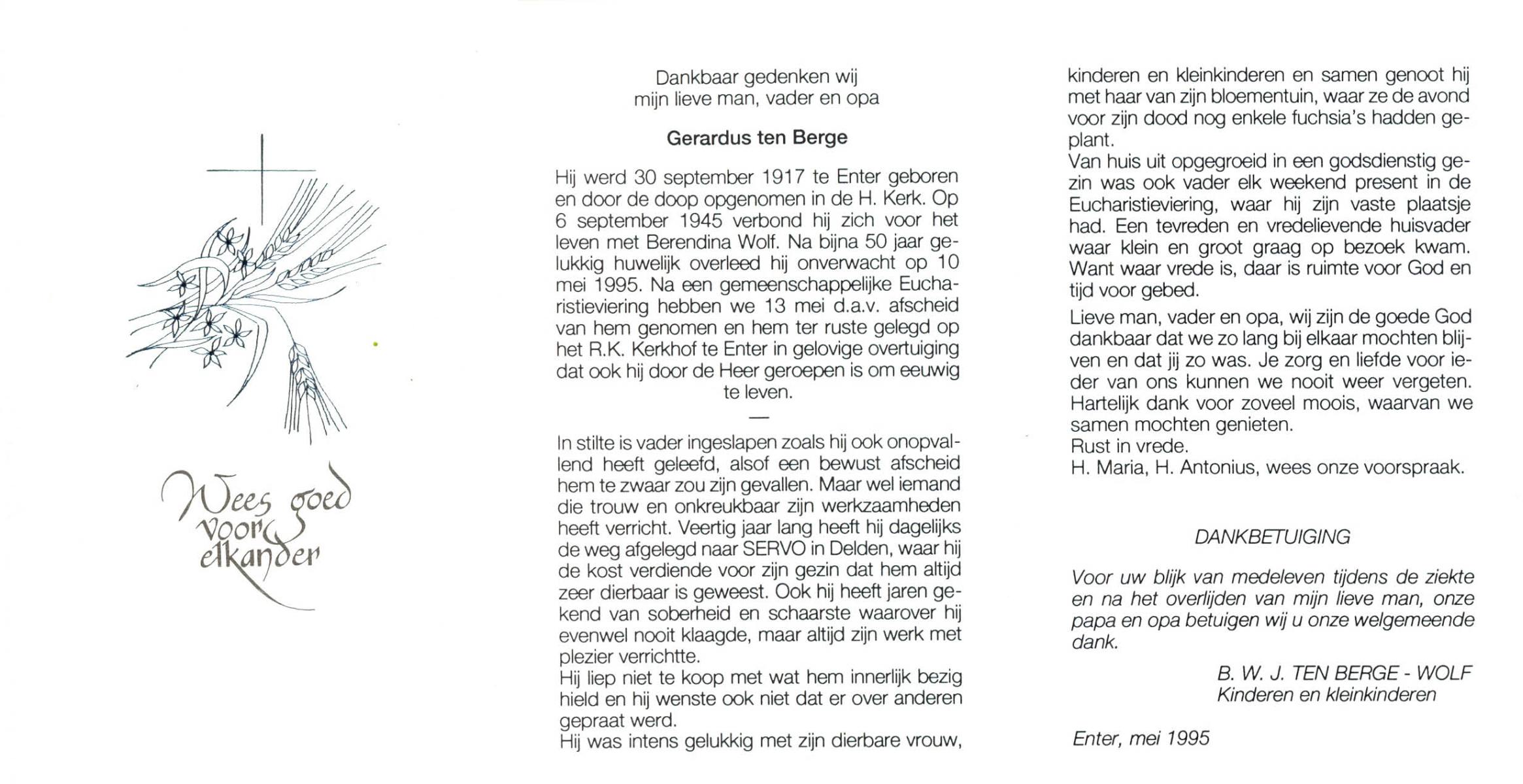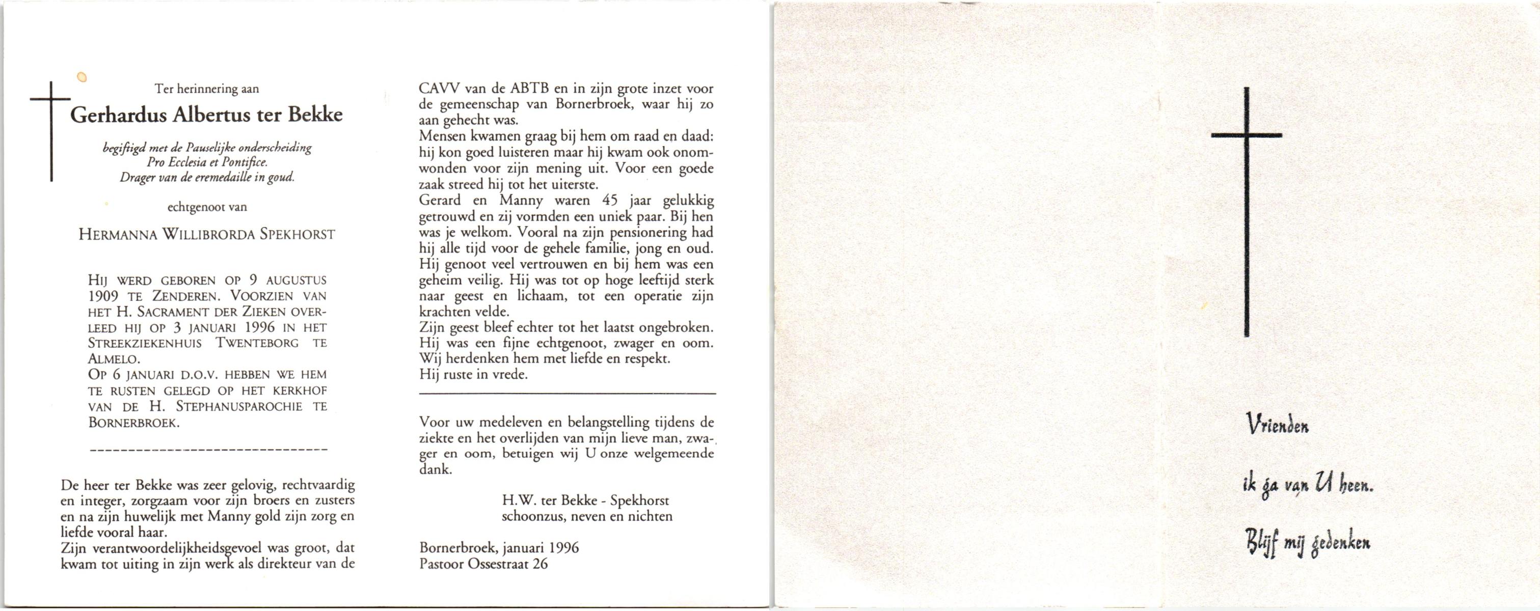 BEKKE, ter, Gerhardus Albertus, geboren op 9-8-1909 te Zenderen, overleden op 3-1-1996 te Almelo, ziekenhuis op 86-jarige leeftijd, begraven op 6-1-1996 te Bornebroek.