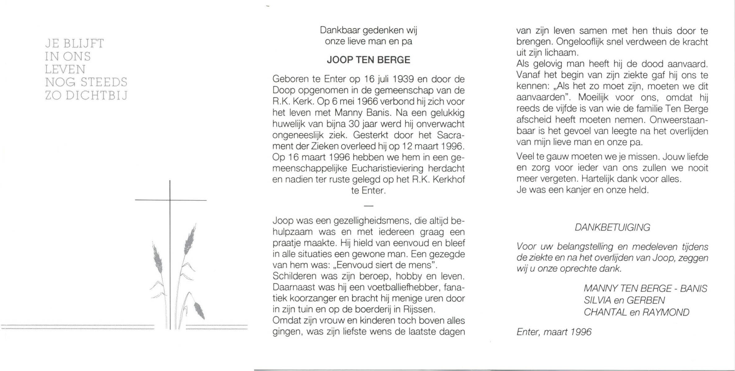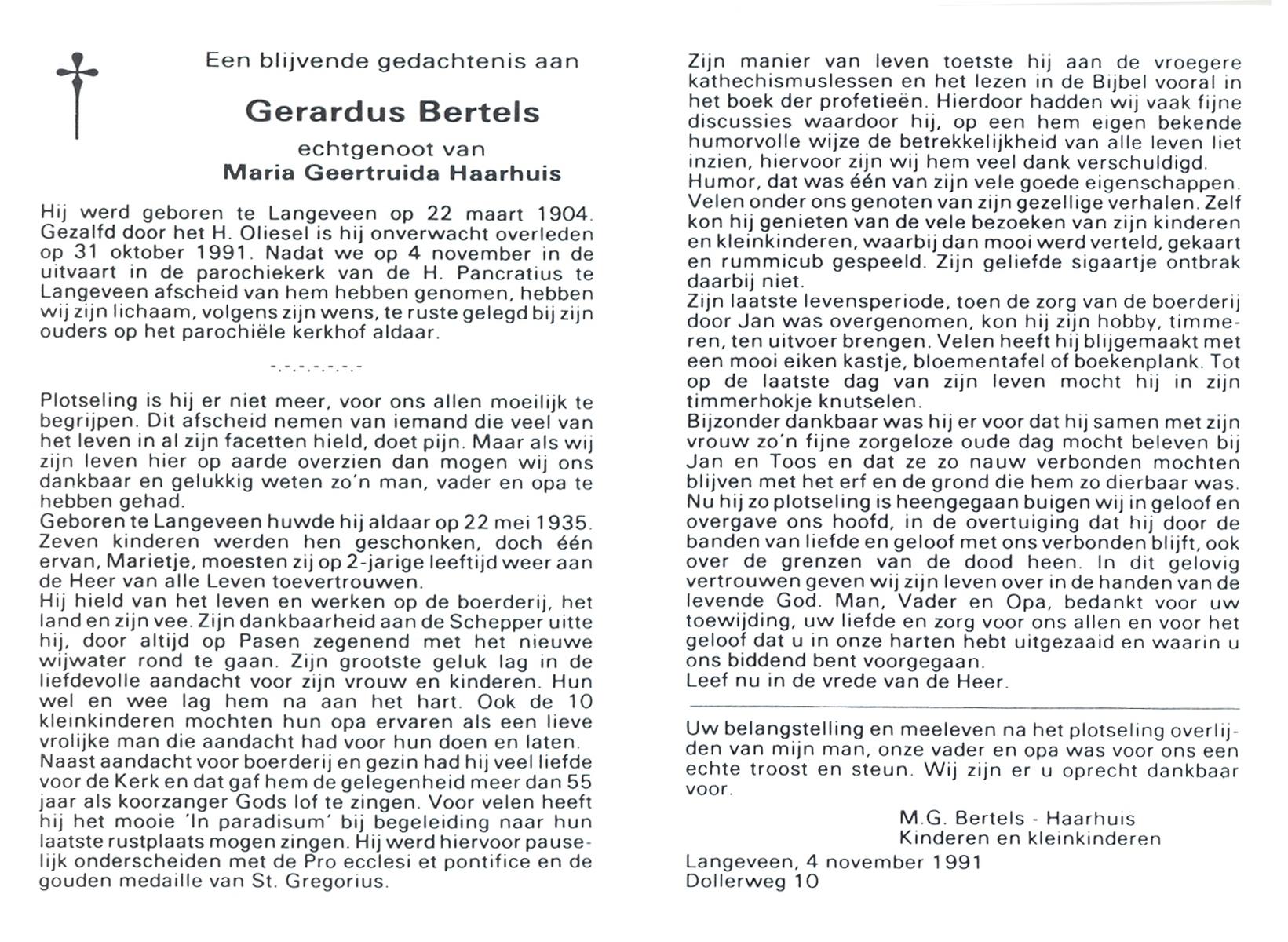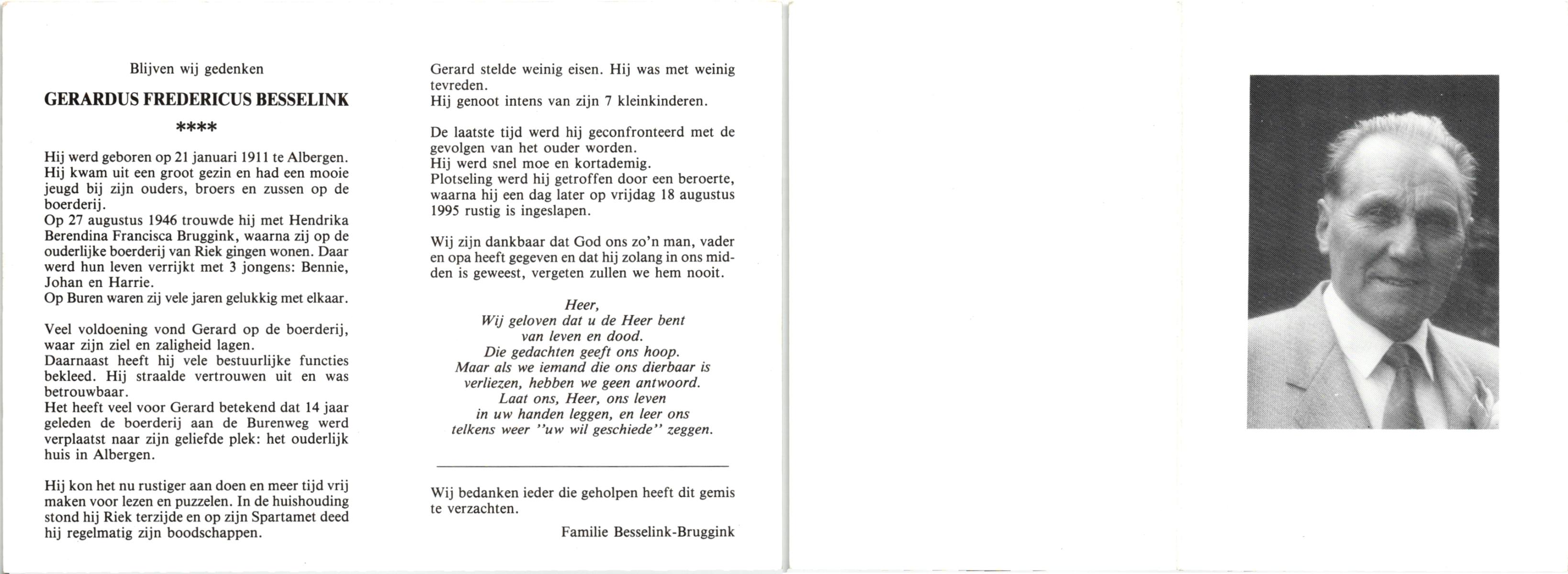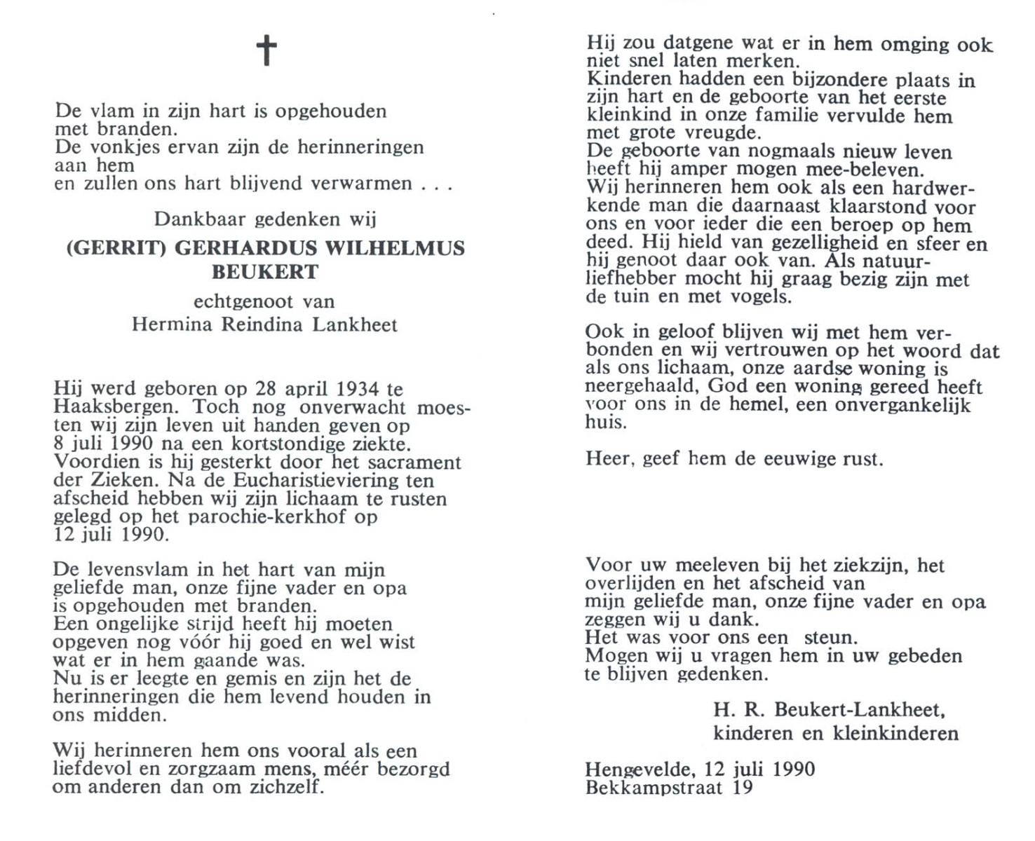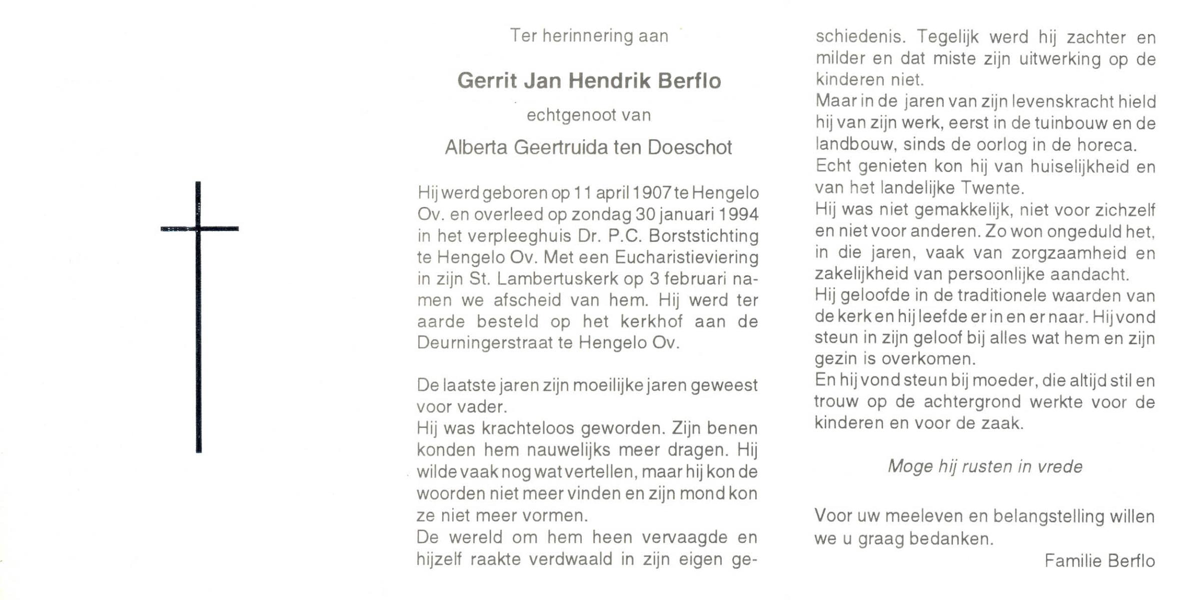 BEKKE, ter, Gerhardus Albertus, geboren op 9-8-1909 te Zenderen, overleden op 3-1-1996 te Almelo, ziekenhuis op 86-jarige leeftijd, begraven op 6-1-1996 te Bornebroek.