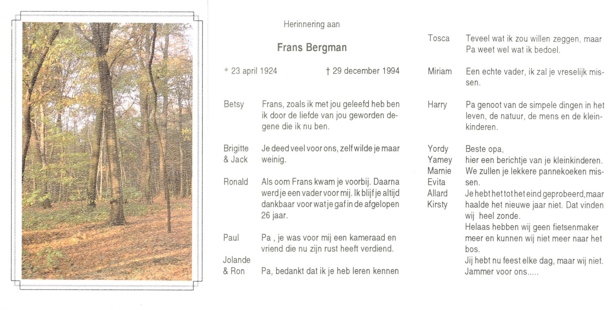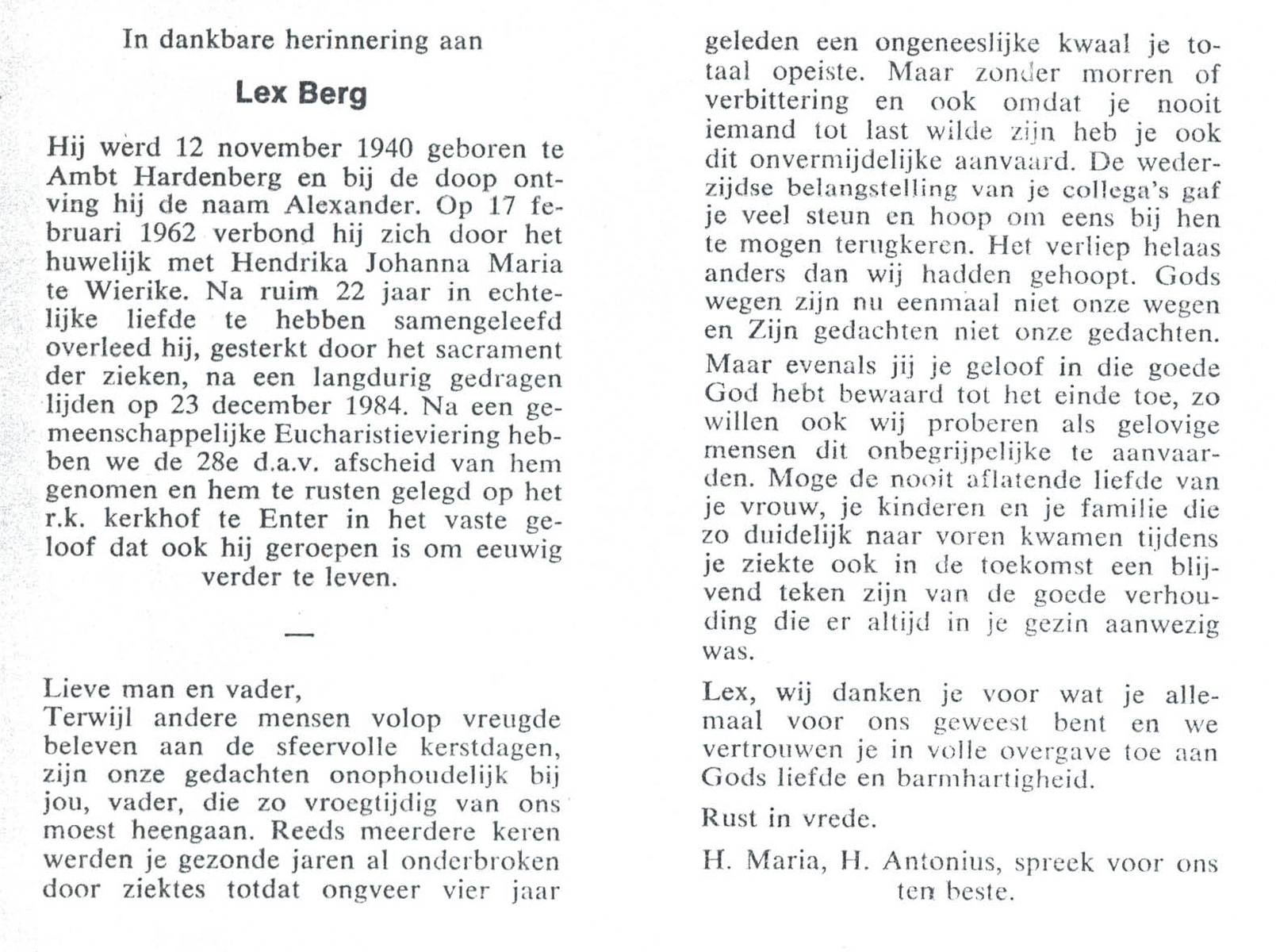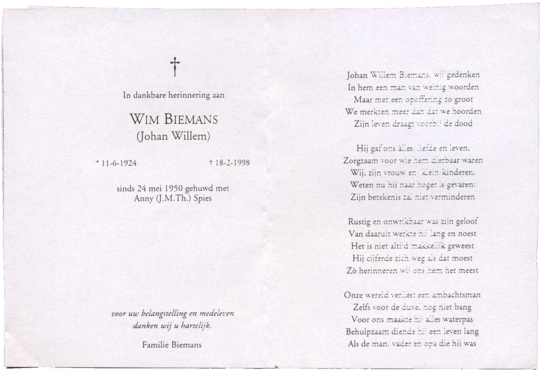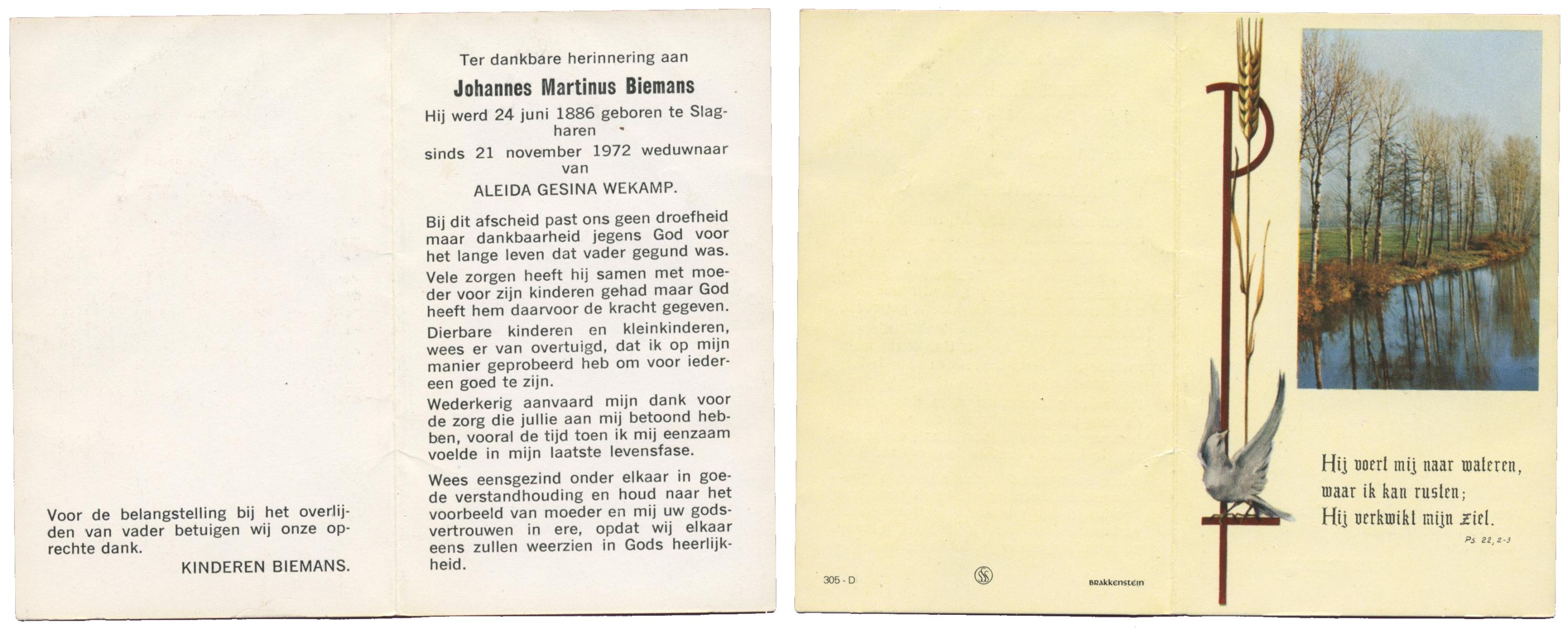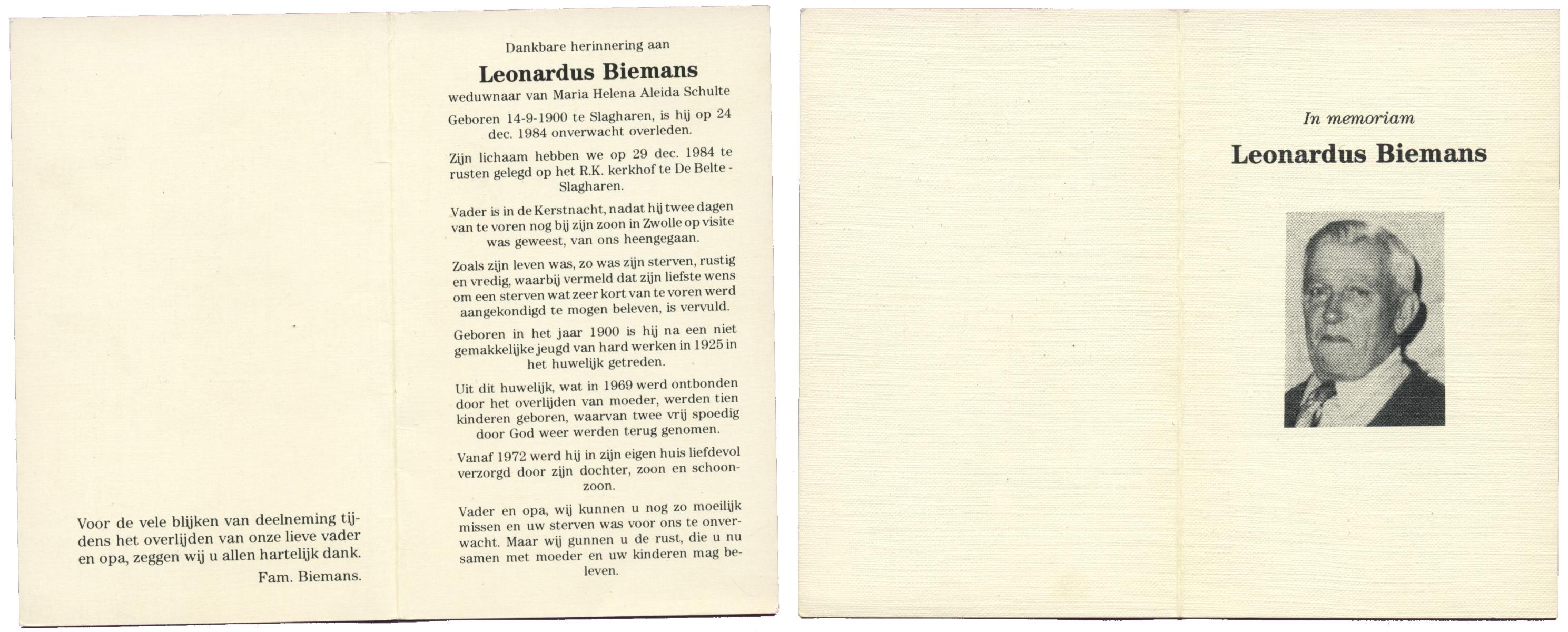 BIEMANS, Leonardus, geboren op 14-9-1900 te Slagharen, overleden op 24-12-1984 op 84-jarige leeftijd, begraven op 29-12-1984 te Slagharen kerkhof de Belte.