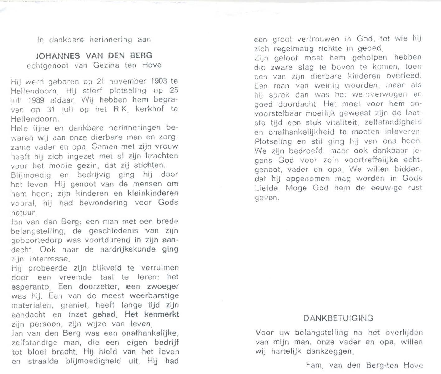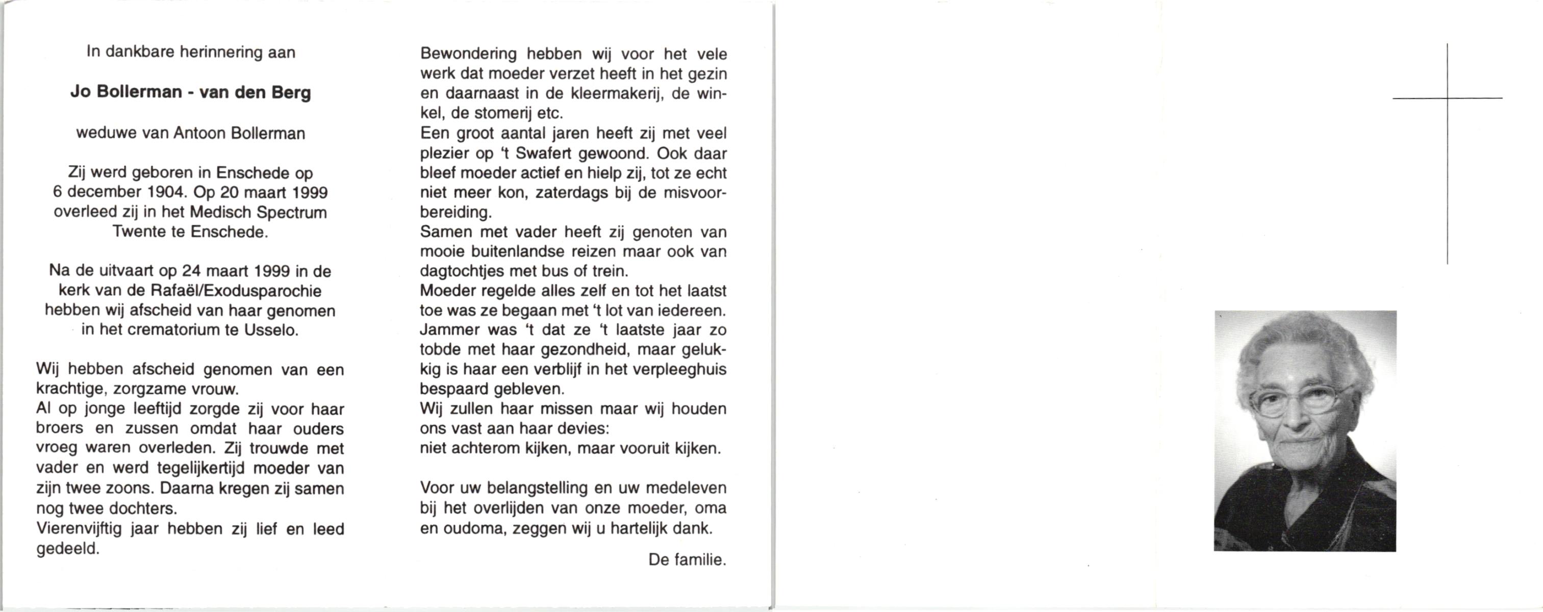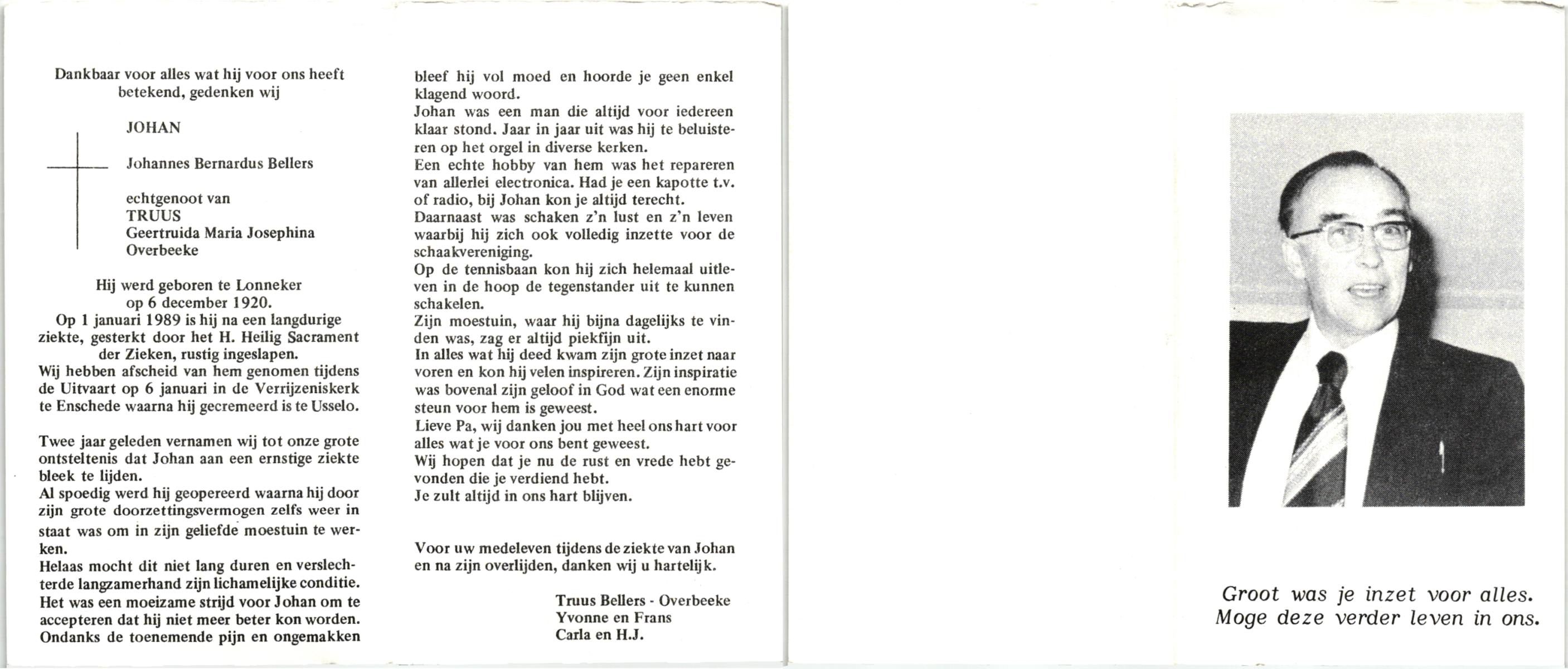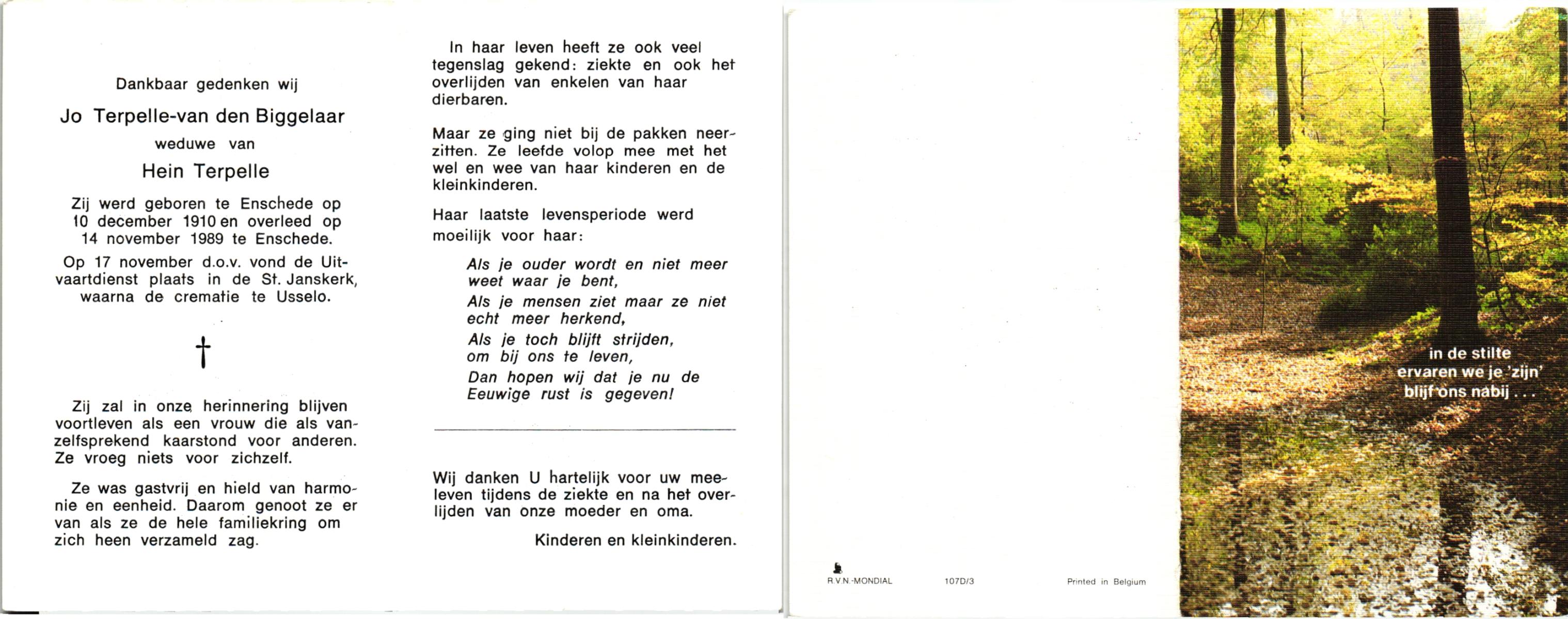 BIGGELAAR, van, Jo, geboren op 10-12-1910 te Enschede, overleden op 14-11-1989 te Enschede op 79-jarige leeftijd, begraven op 17-11-1989 te Usselo.