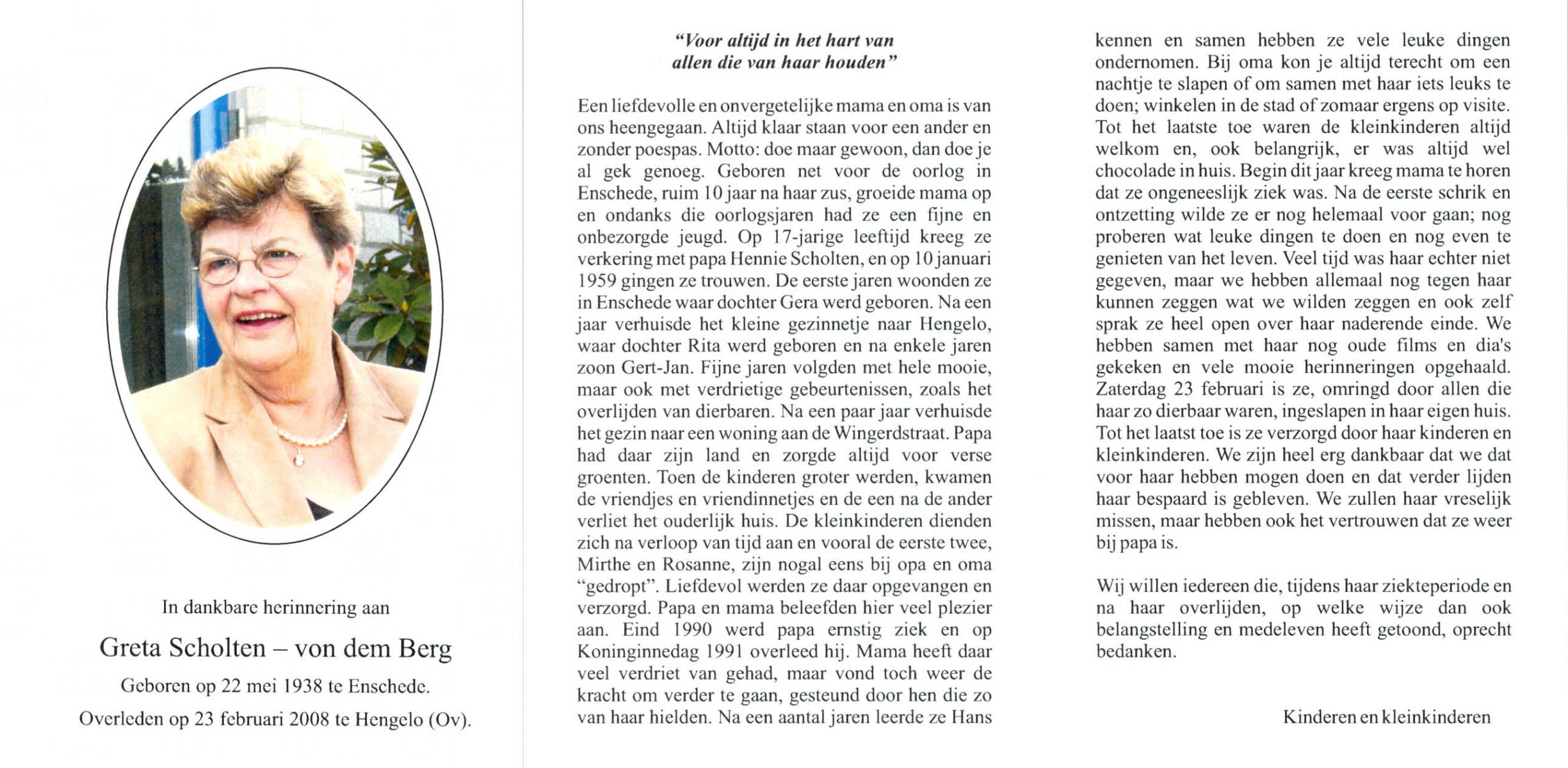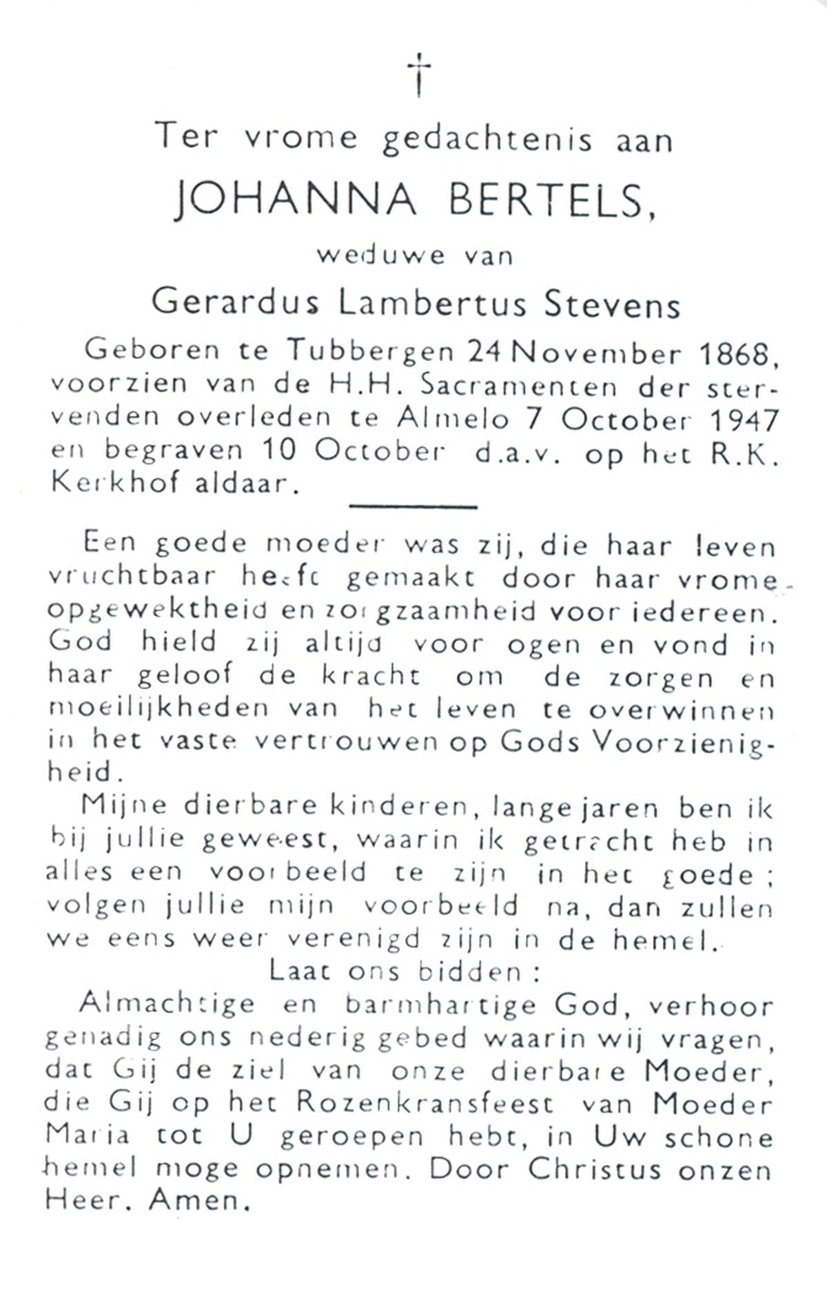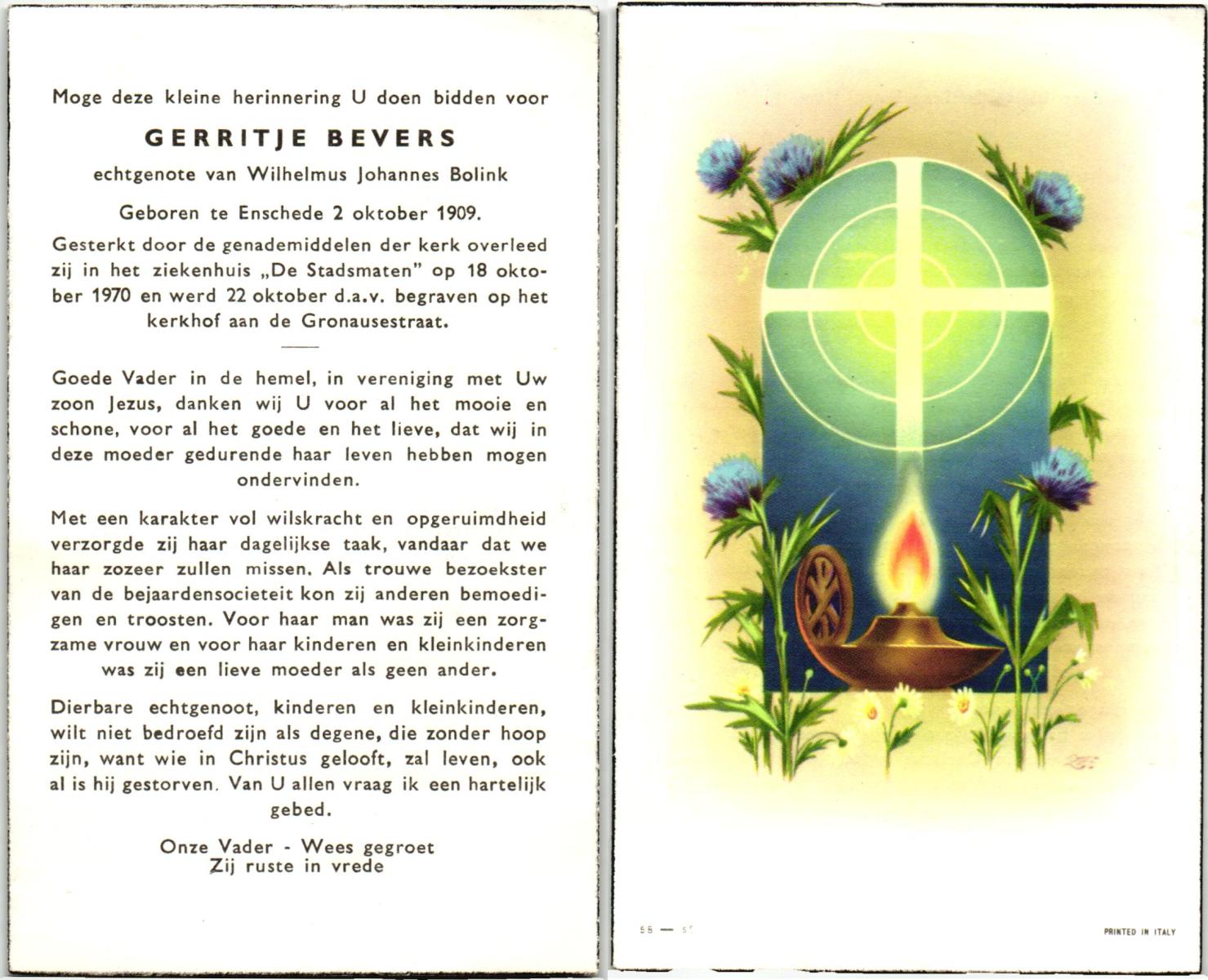 BEVERS, Gerritje, geboren op 2-10-1909 te Enschede, overleden op 18-10-1970 te Enschede, ziekenhuis op 61-jarige leeftijd, begraven op 22-10-1970 te Enschede.