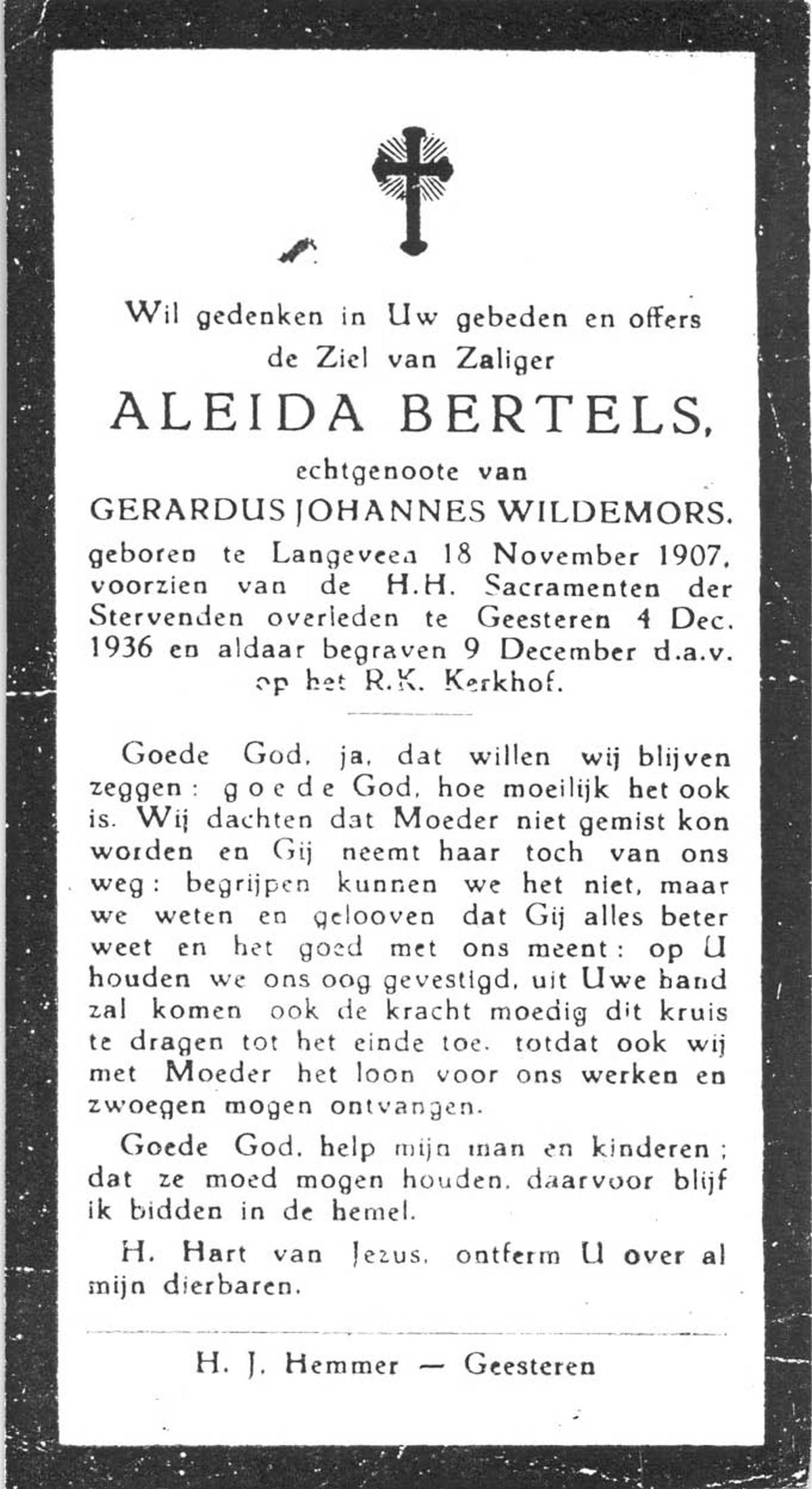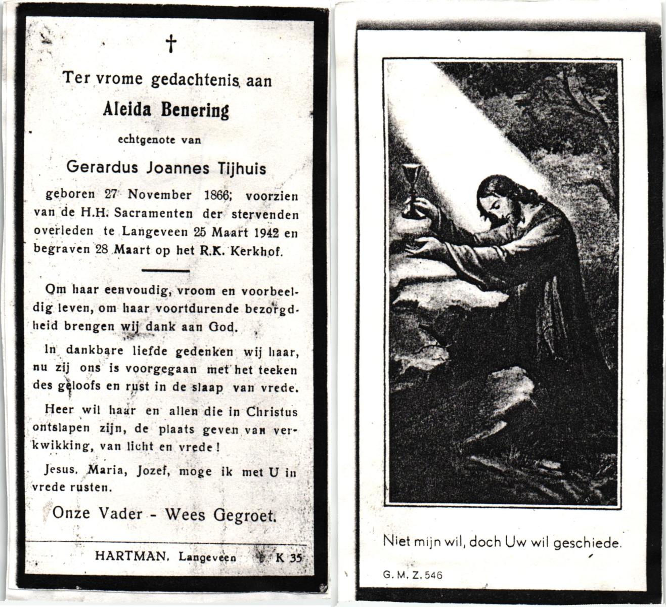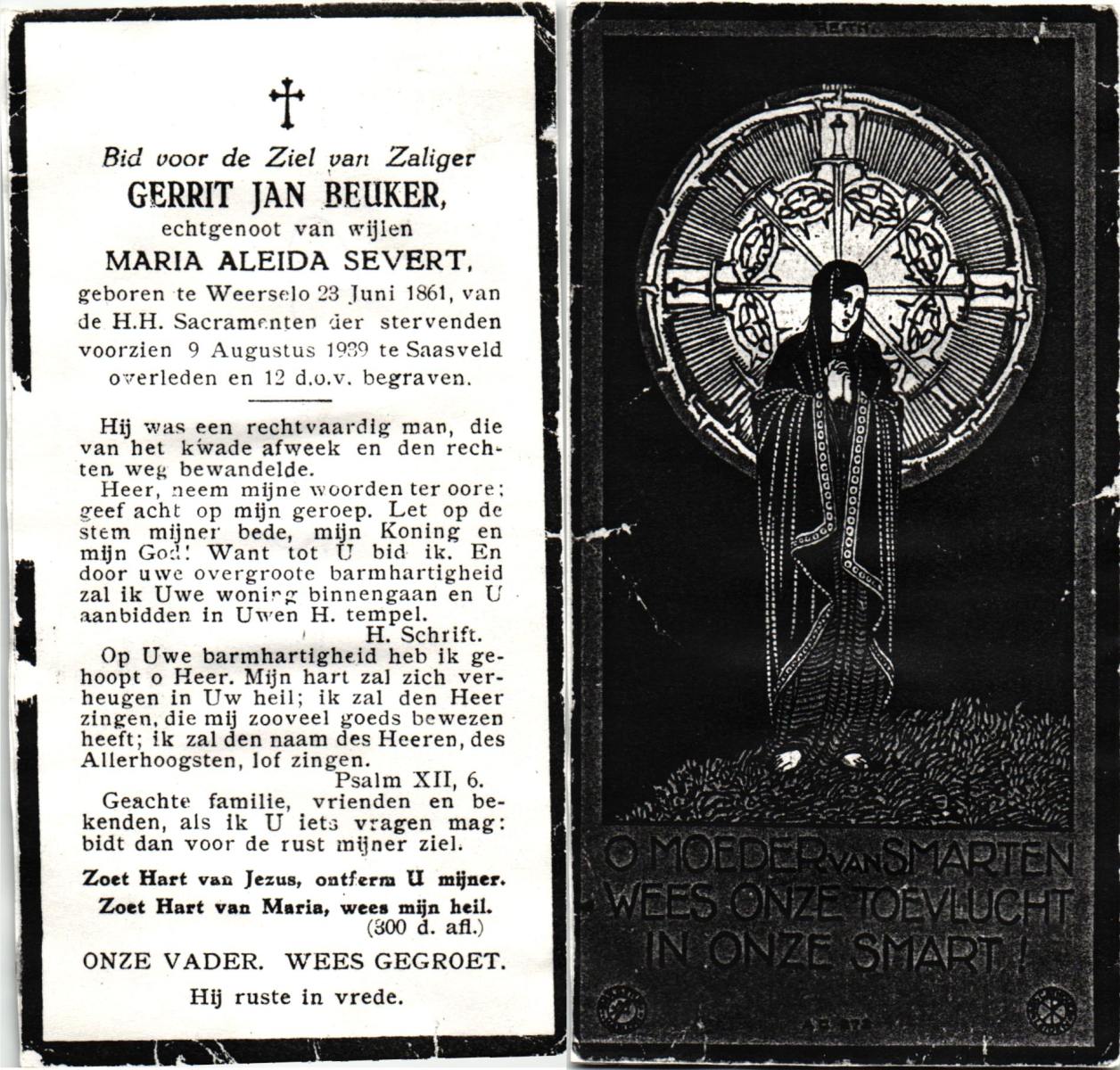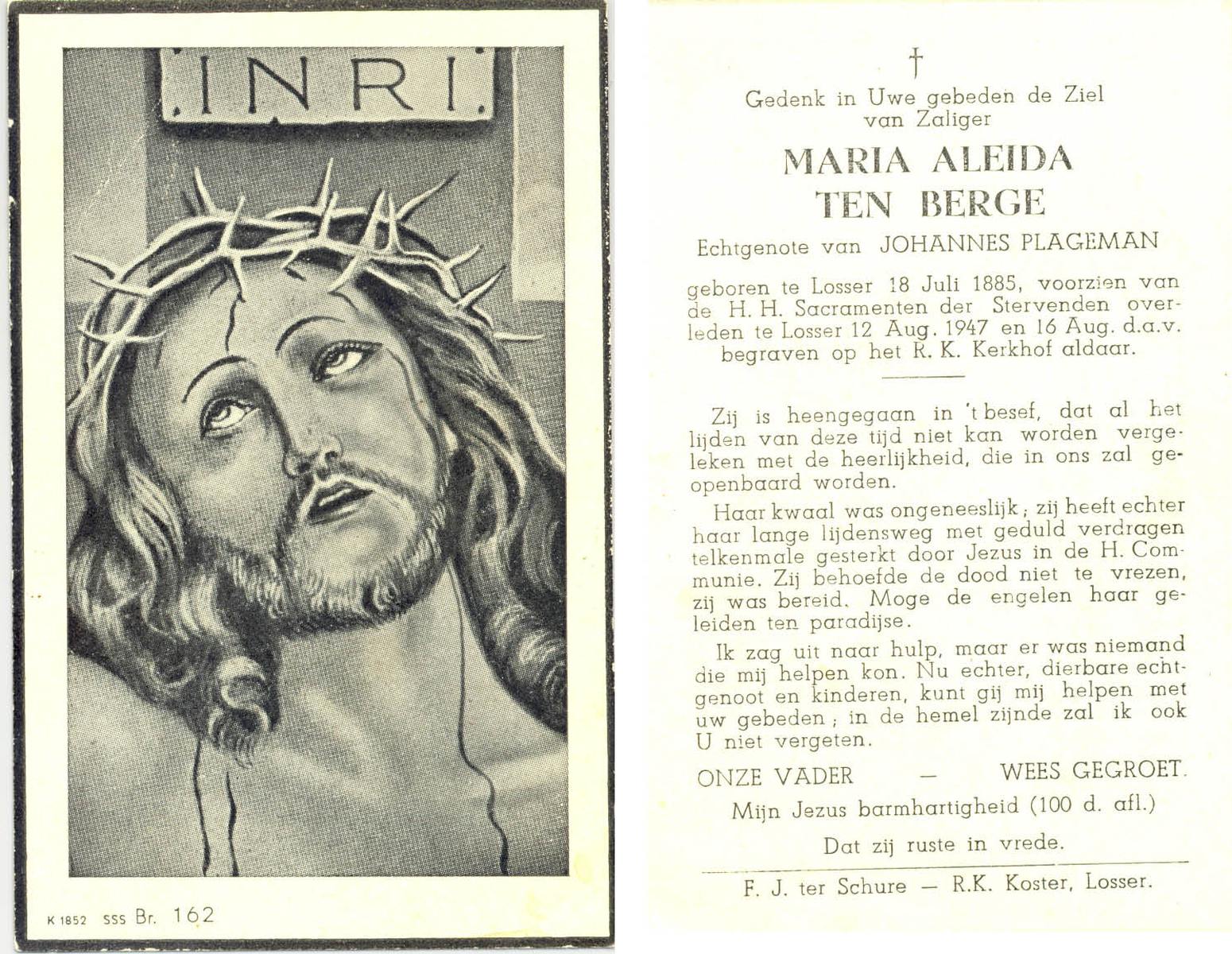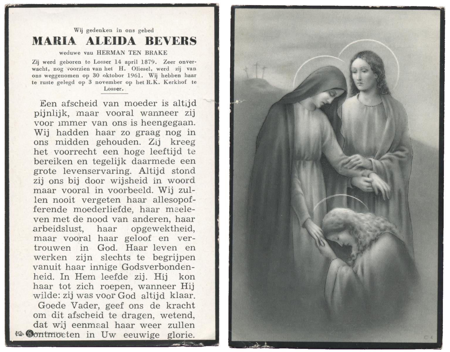BEVERS, Maria Aleida, geboren op 14-04-1879 te Losser, overleden op 30-10-1961 op 82-jarige leeftijd, begraven op 3-11-1961 te Losser.