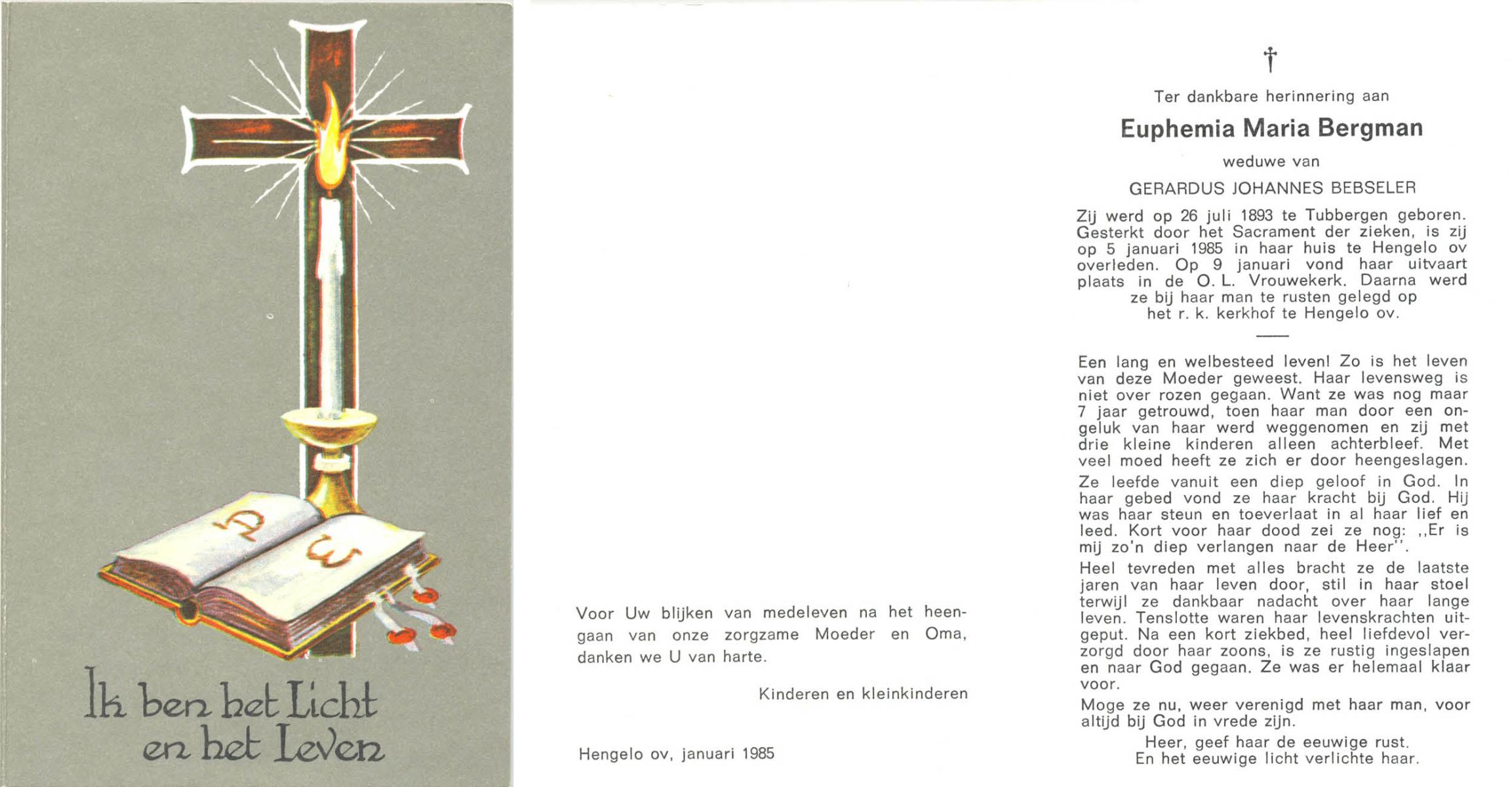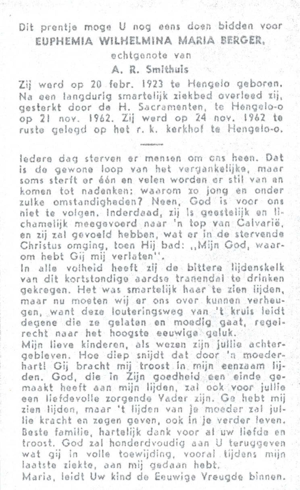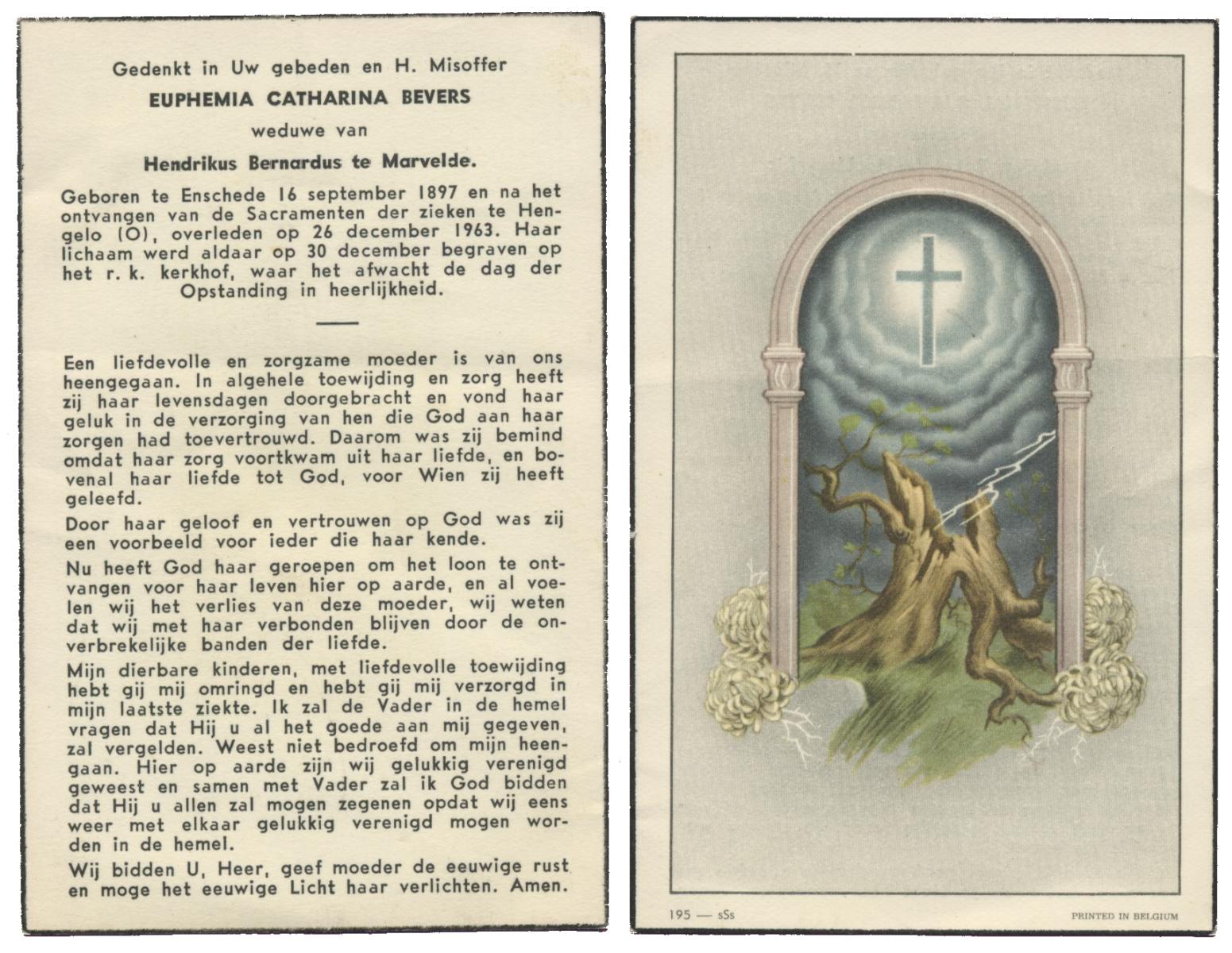 BEVERS, Euphemia Catharina, geboren op 16-09-1897 te Enschede, overleden op 26-12-1963 te Hengelo (Ov.) op 66-jarige leeftijd, begraven op 30-12-1963 te Hengelo (Ov.).