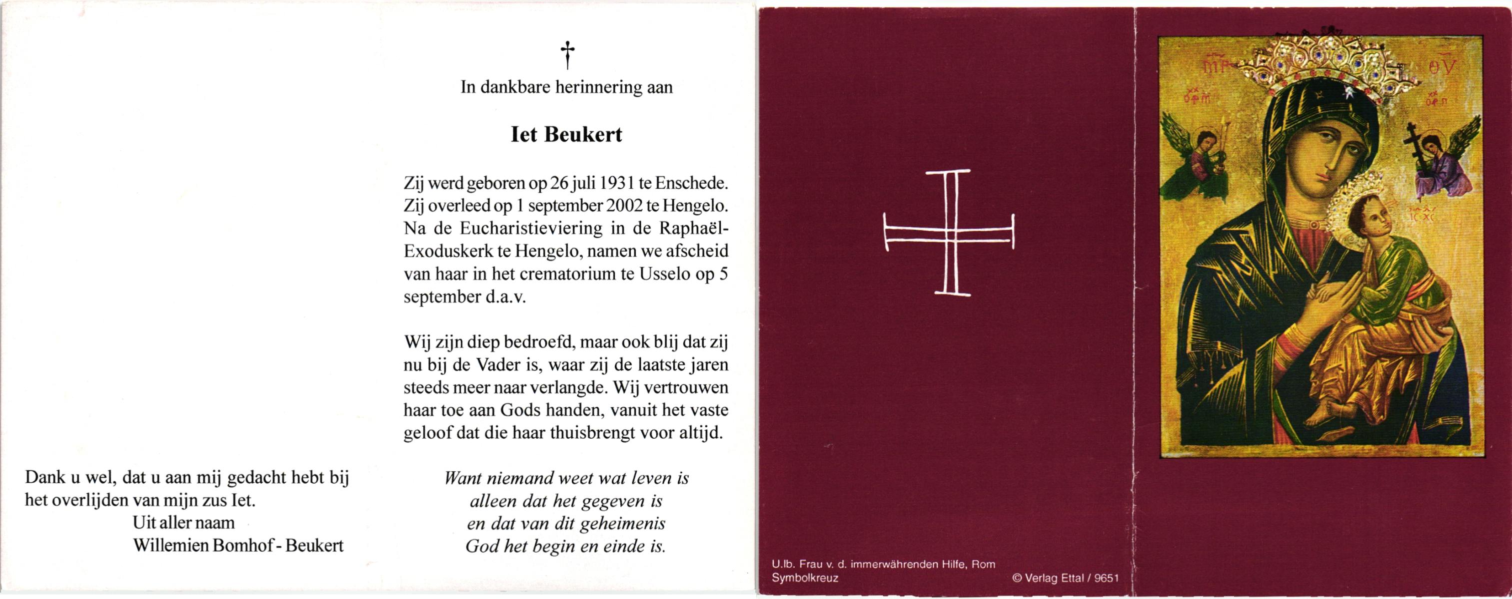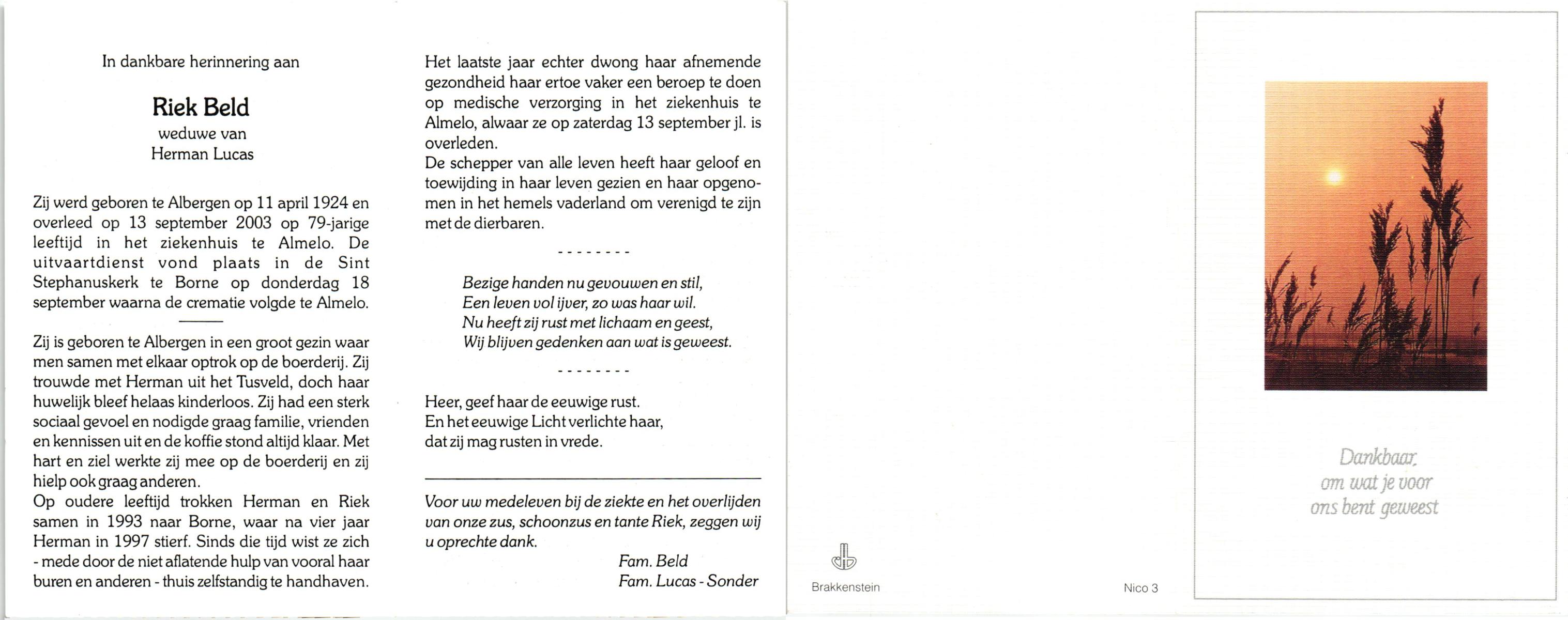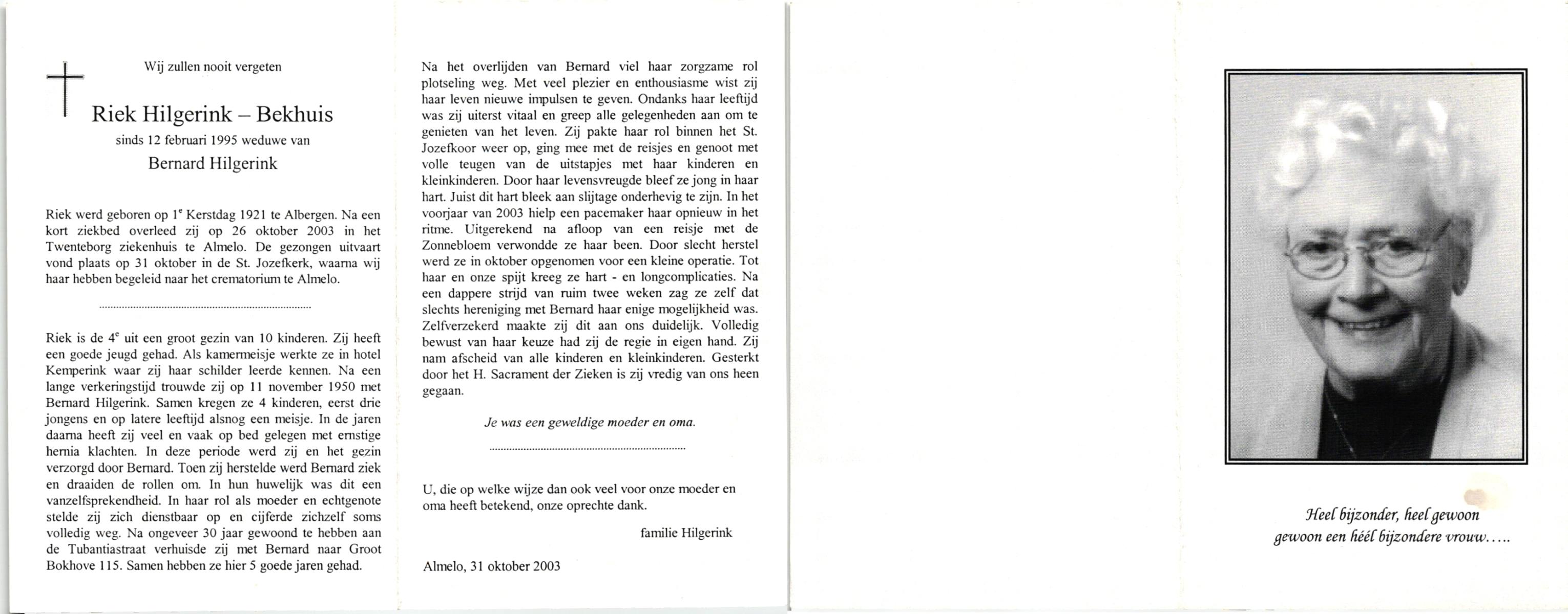BEKHUIS, , Riek, geboren op 25-12-1921 te Albergen, overleden op 26-10-2003 te Almelo op 81-jarige leeftijd, gecremeerd op 31-10-2003 te Almelo.
