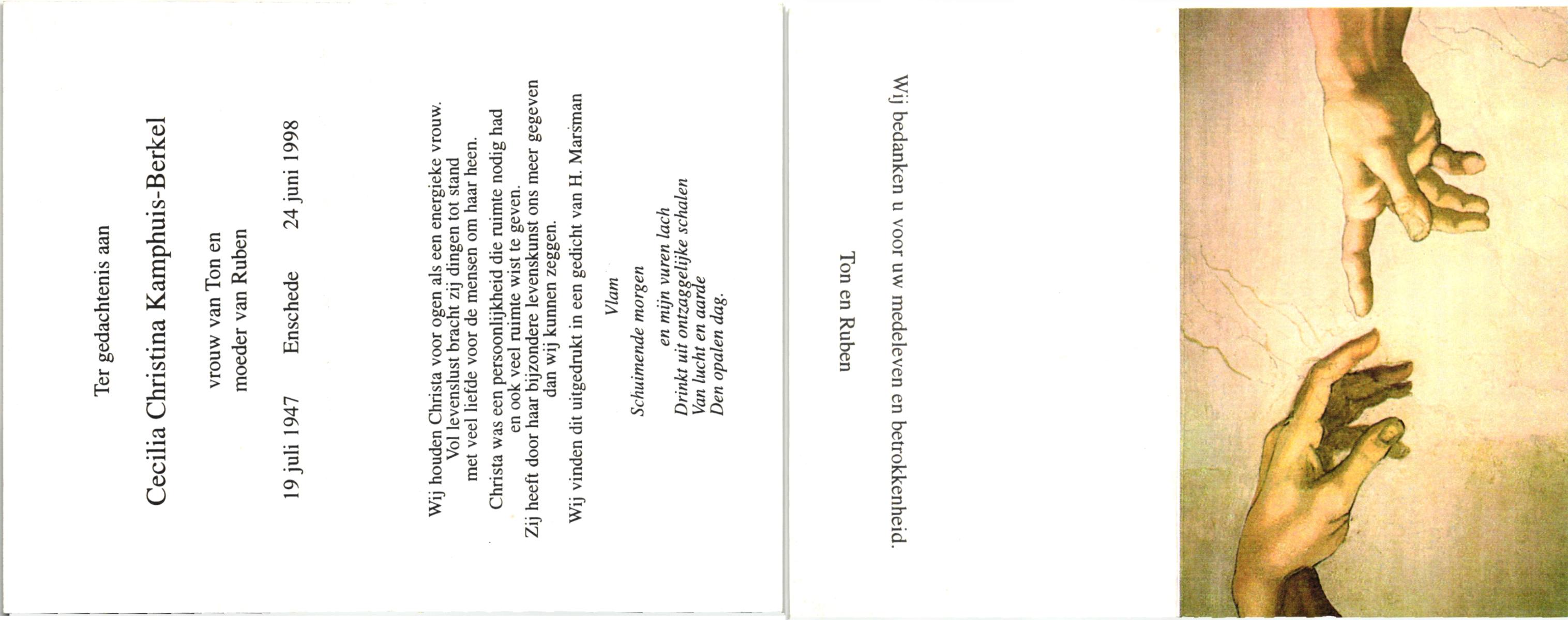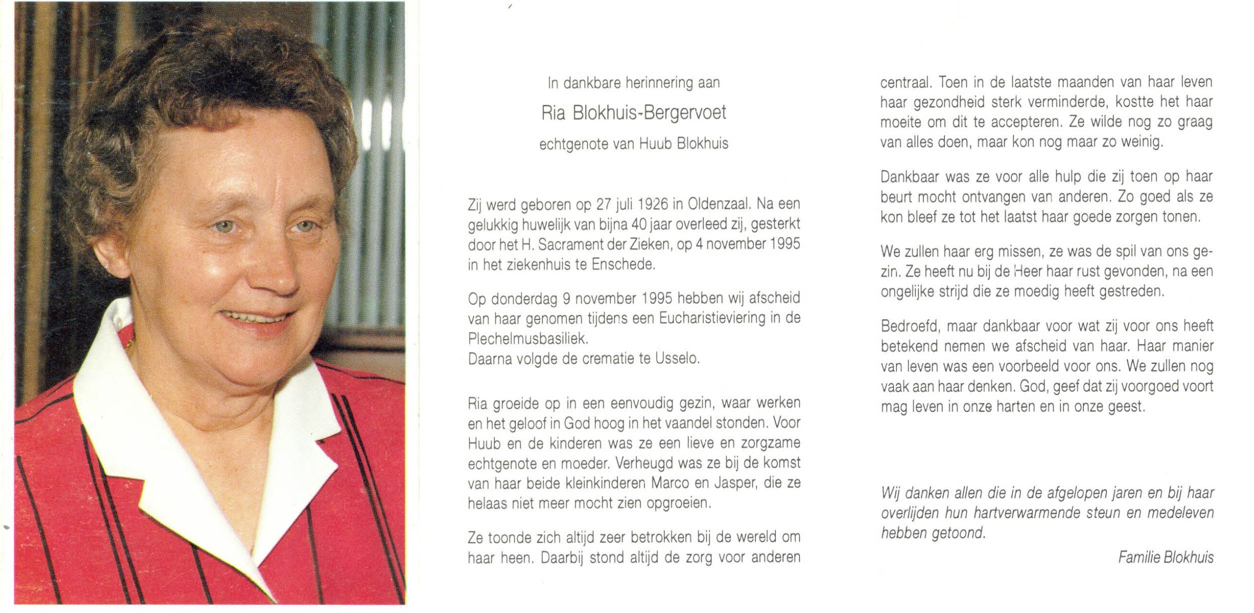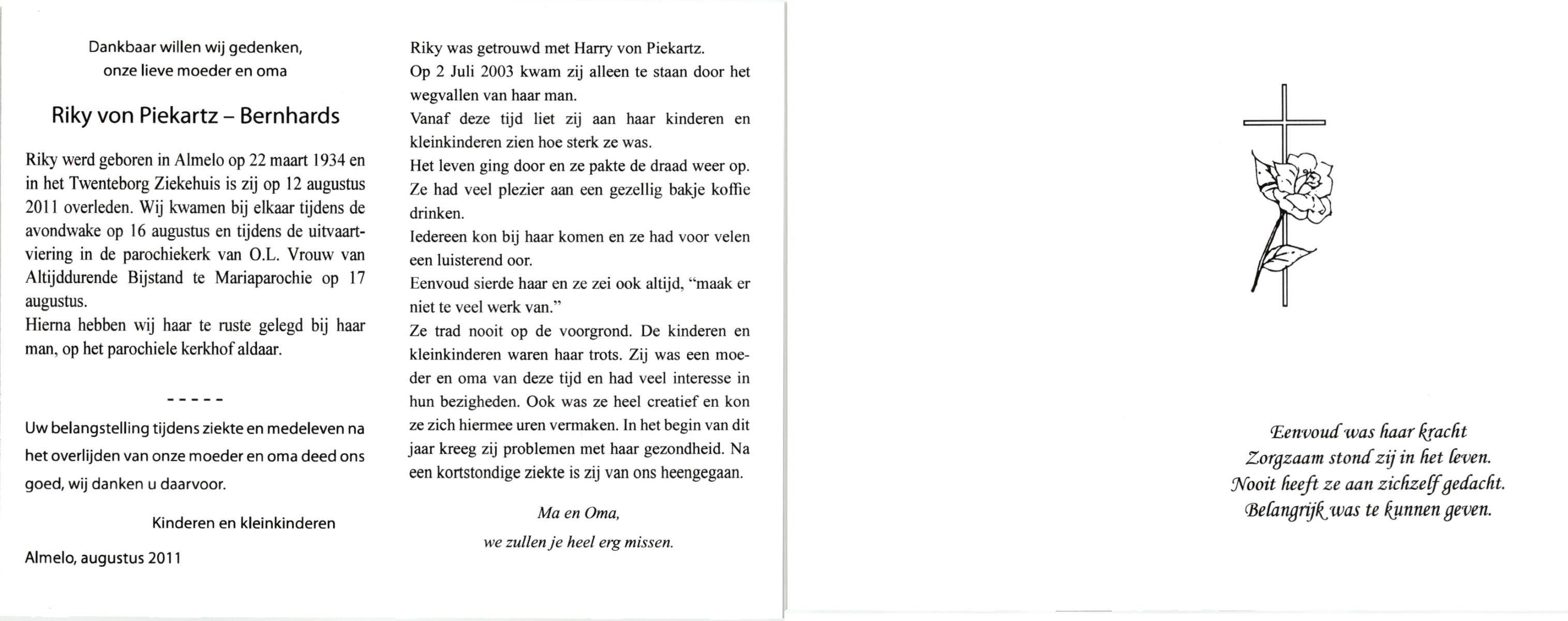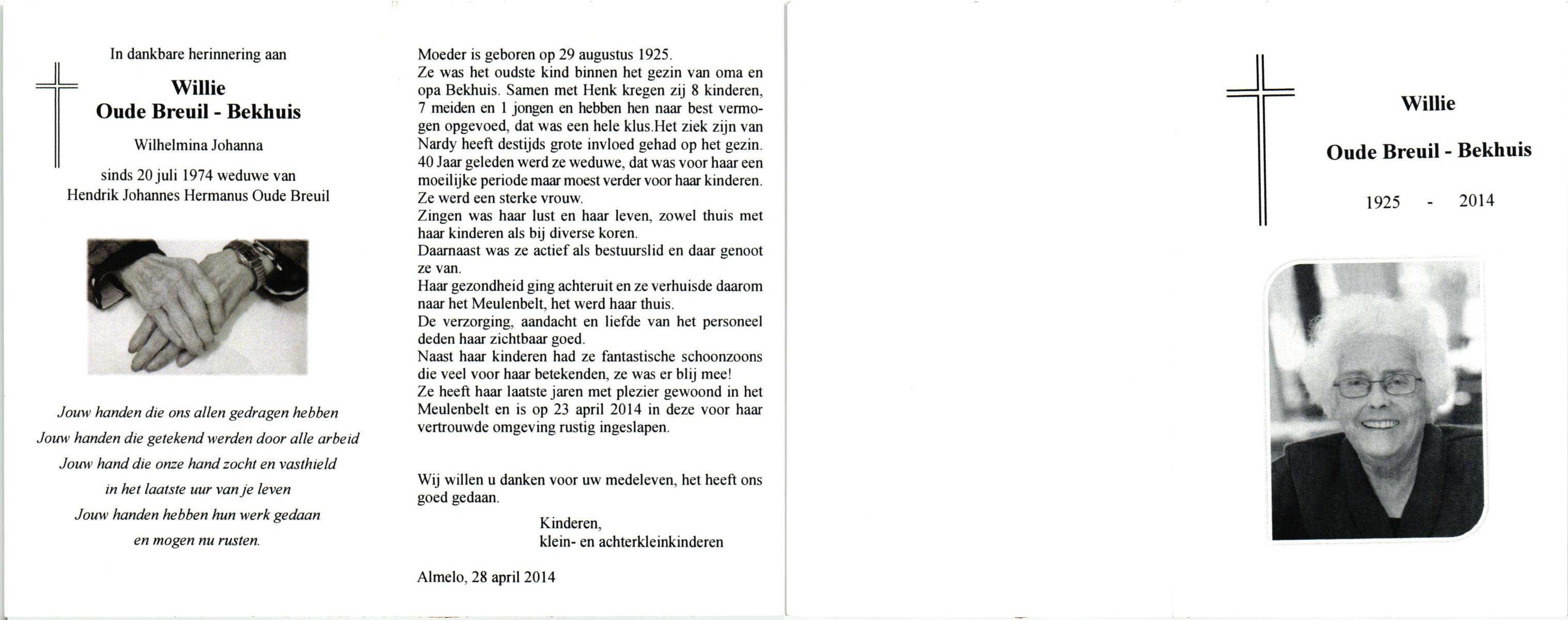 BEKHUIS, , Riek, geboren op 25-12-1921 te Albergen, overleden op 26-10-2003 te Almelo op 81-jarige leeftijd, gecremeerd op 31-10-2003 te Almelo.