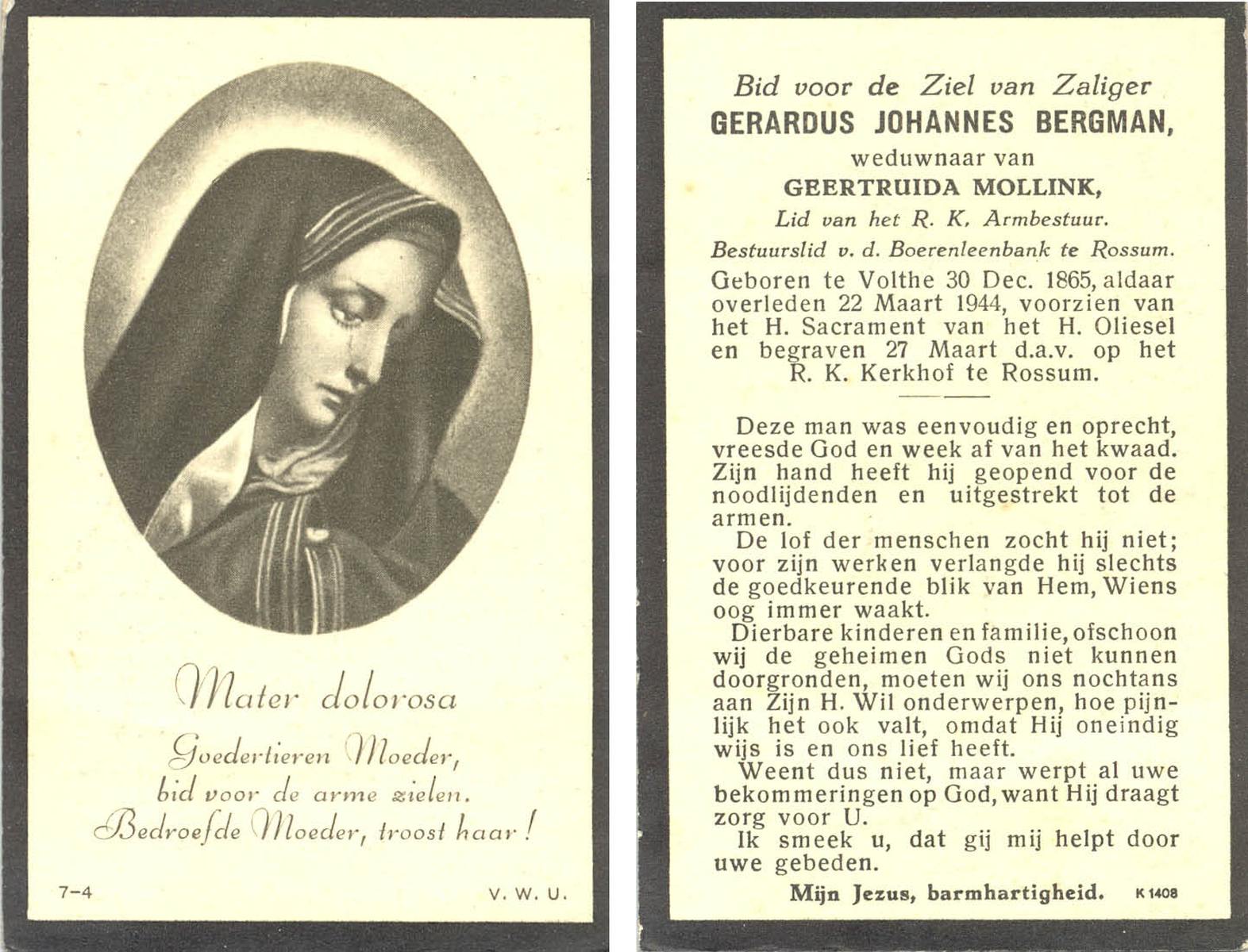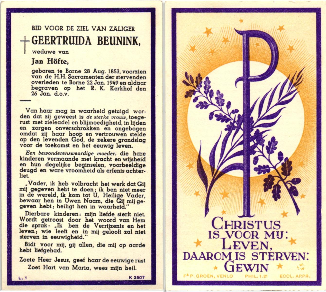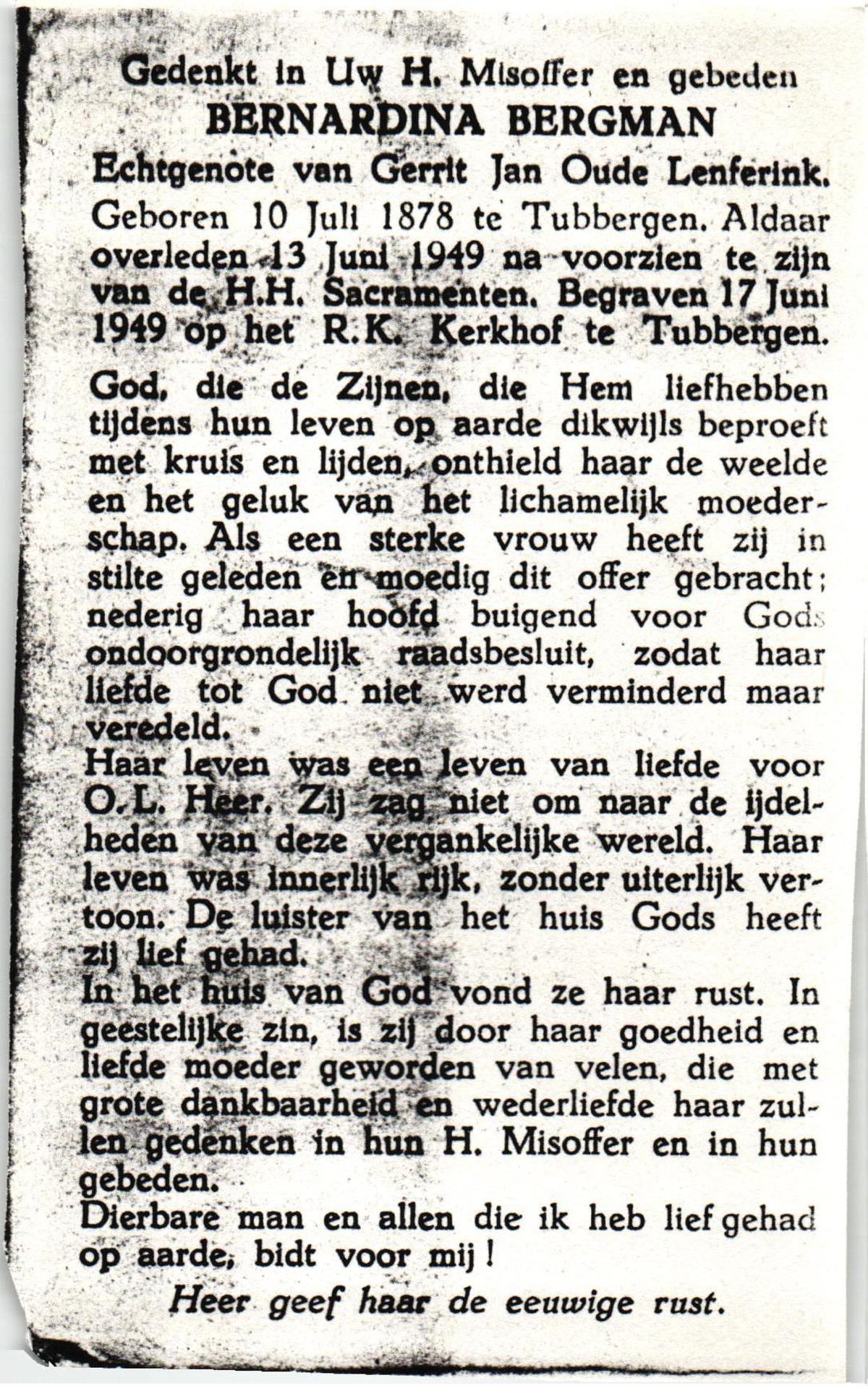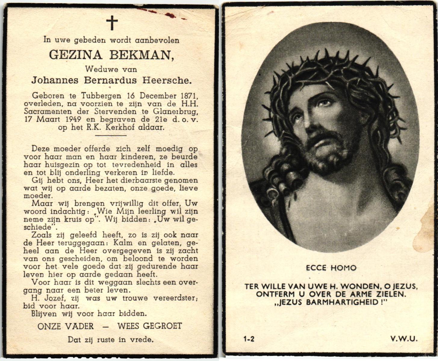 BEKMAN, Gezina, geboren op 16-12-1871 te Tubbergen, overleden op 17-3-1949 te Glanerbrug op 77-jarige leeftijd, begraven op 21-3-1949 te Glanerbrug.
