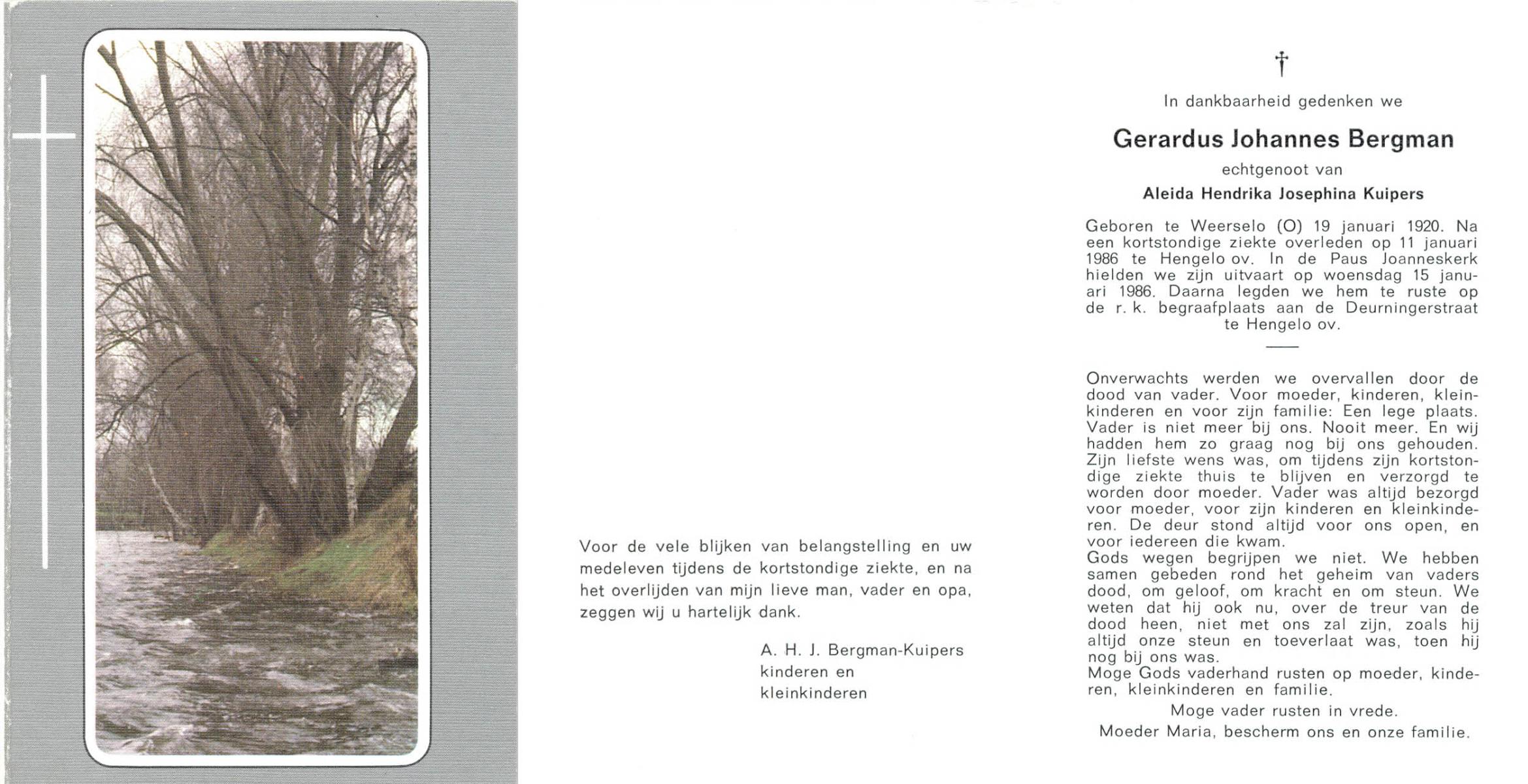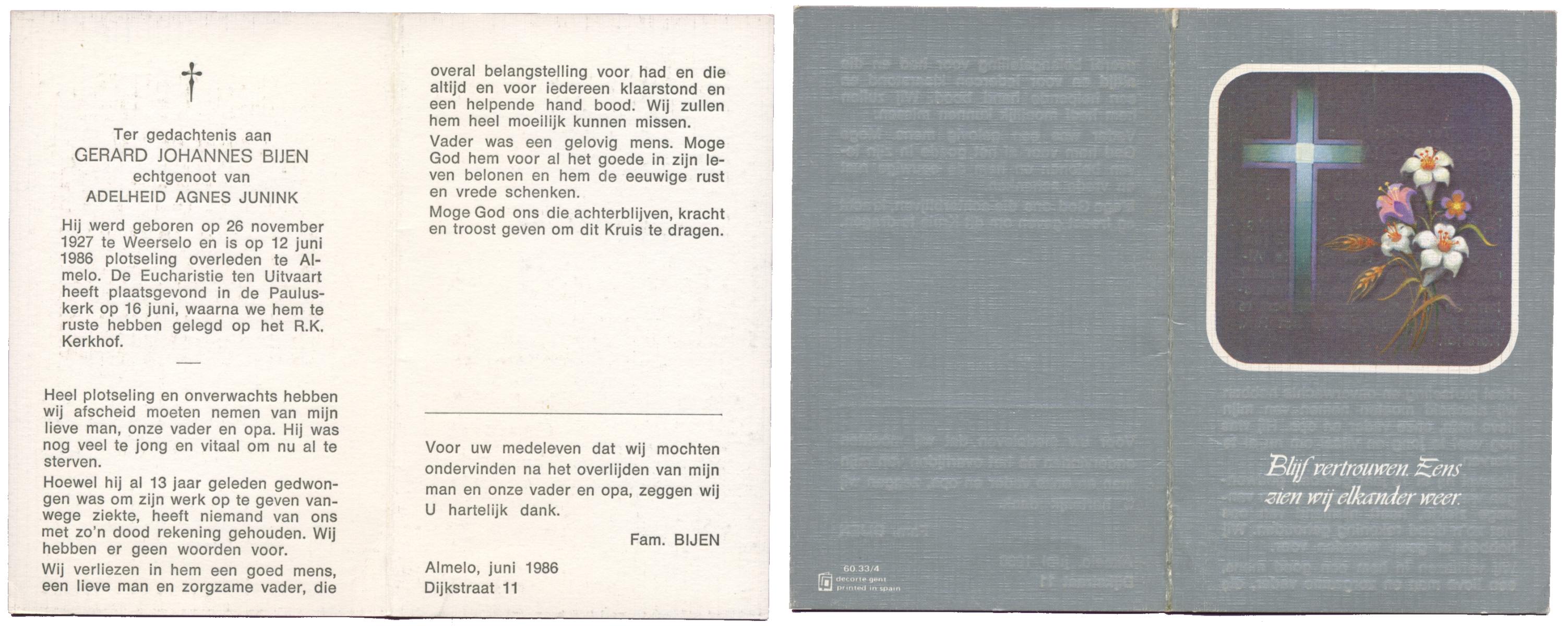 BIJEN, Gerard Johannes, geboren op 26-11-1927 te Weerselo, overleden op 12-6-1986 te Almelo op 58-jarige leeftijd, begraven op 16-6-1986 te Almelo.