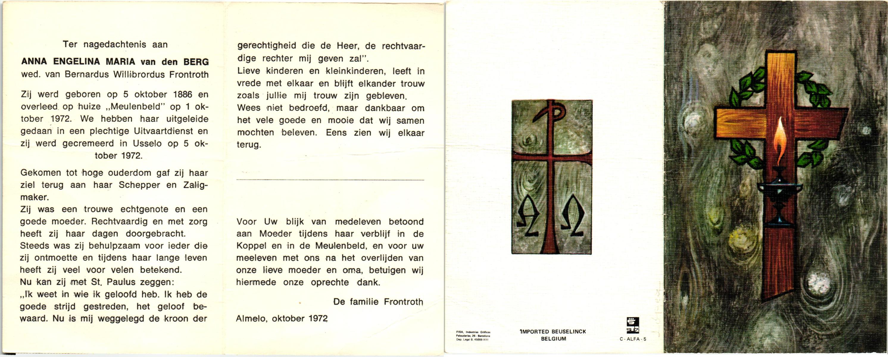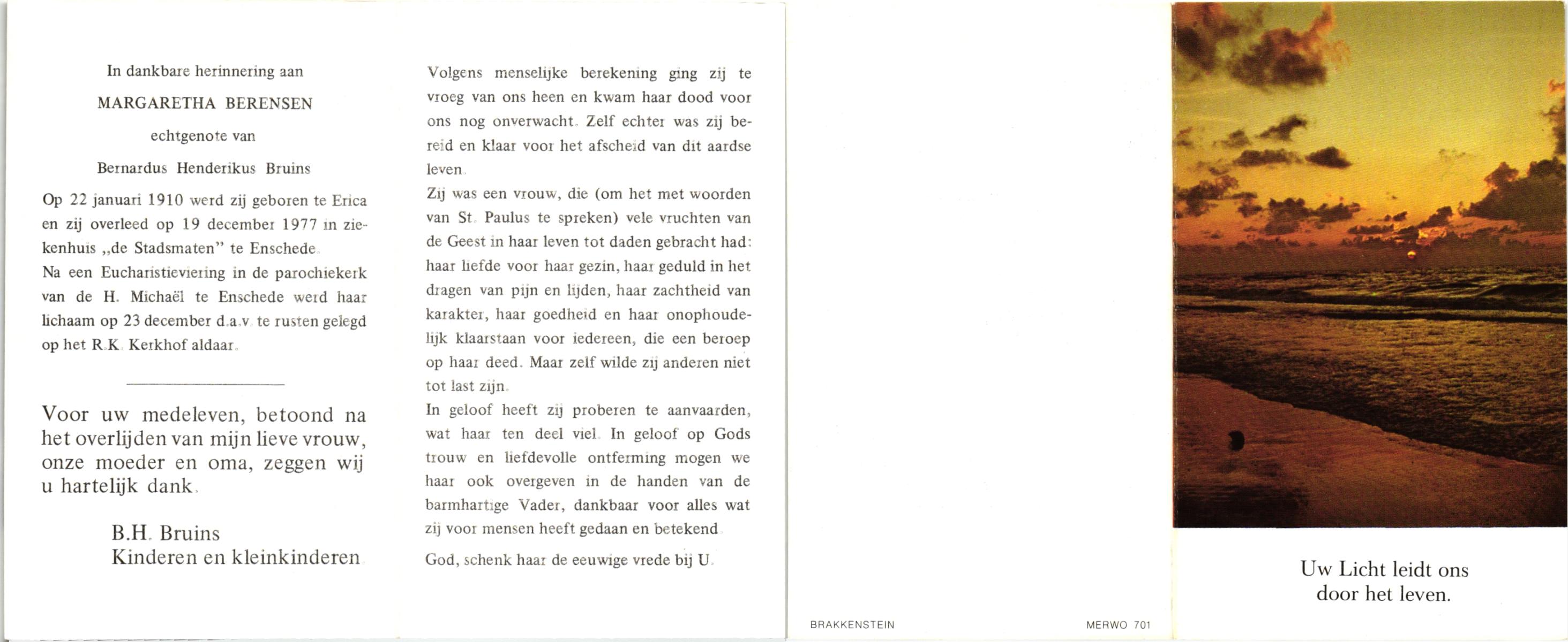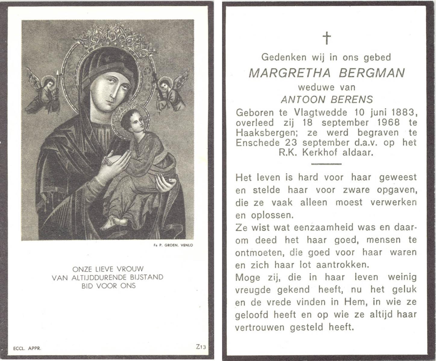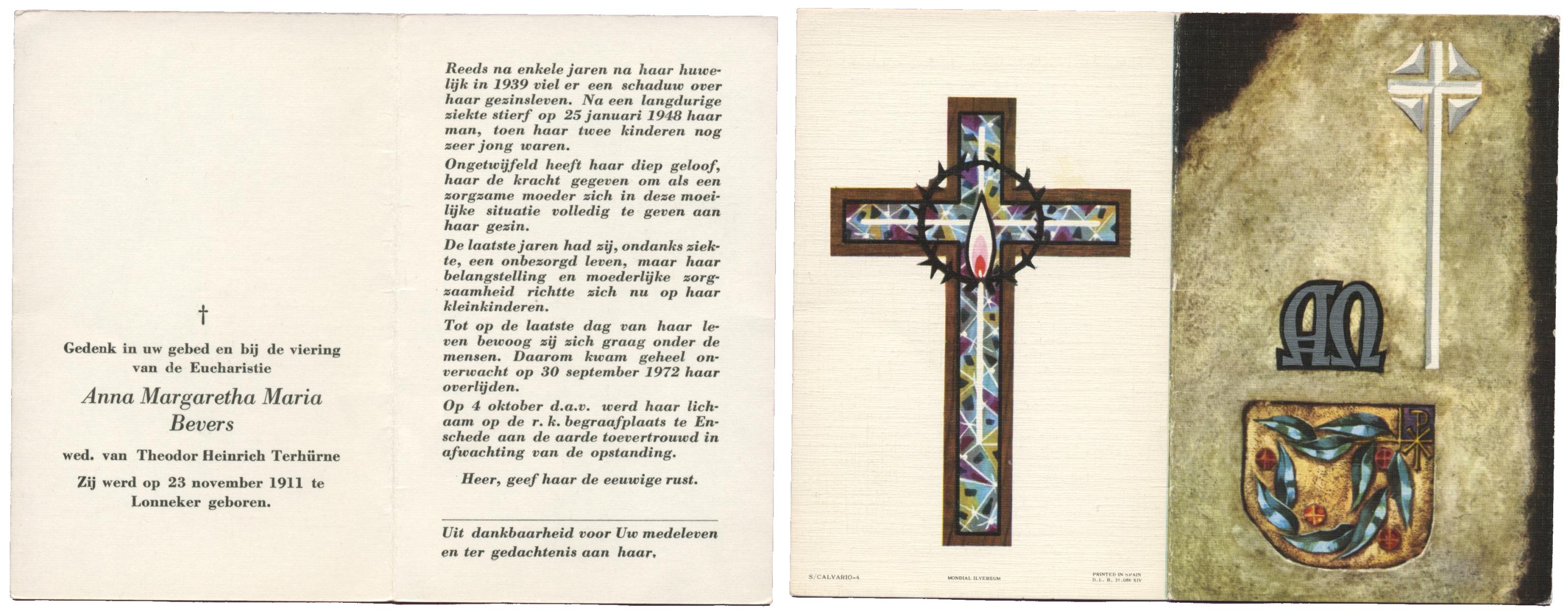 BEVERS, Anna Margaretha Maria, geboren op 23-11-1911 te Lonneker, overleden op 30-9-1972 te Enschede op 60-jarige leeftijd, begraven op 4-10-1972 te Enschede.