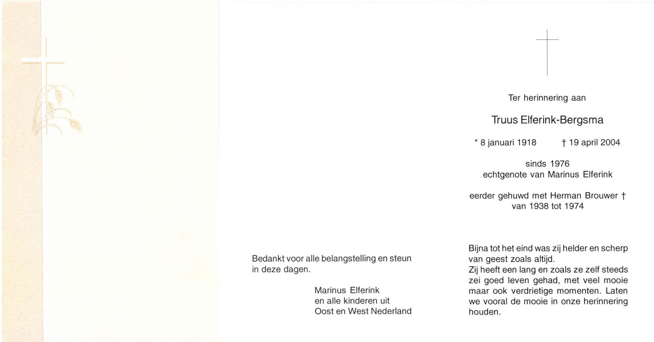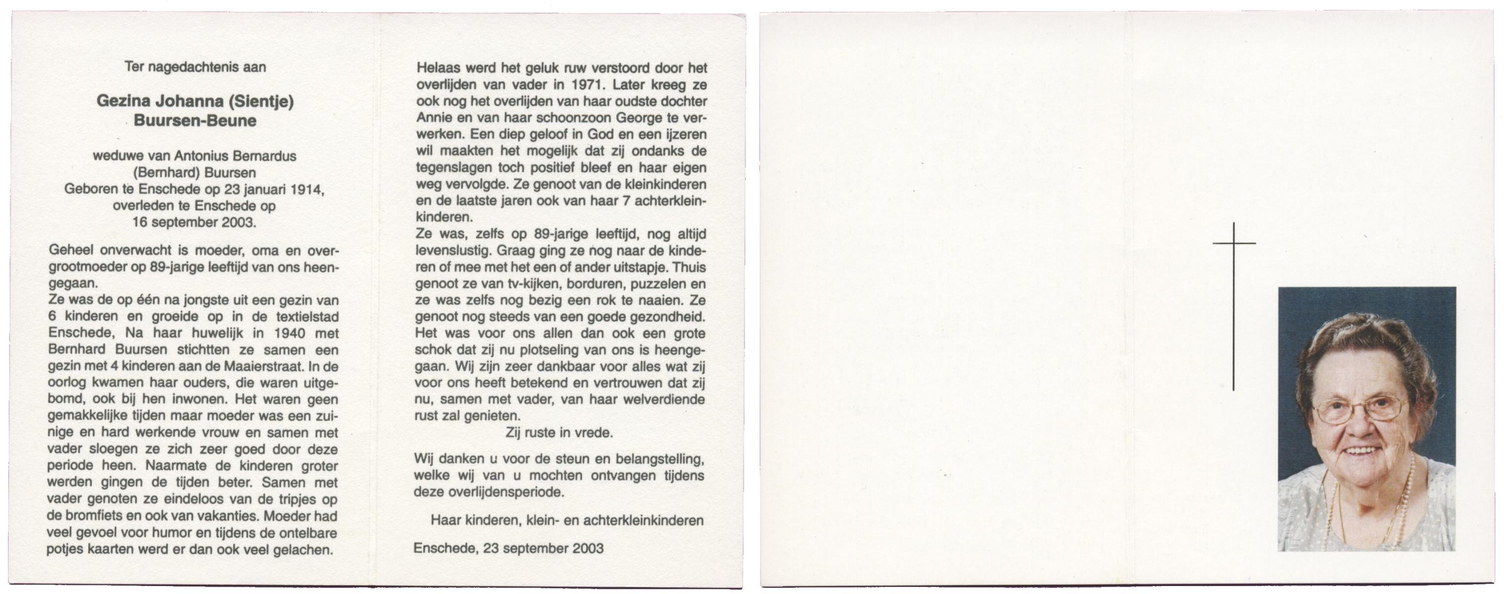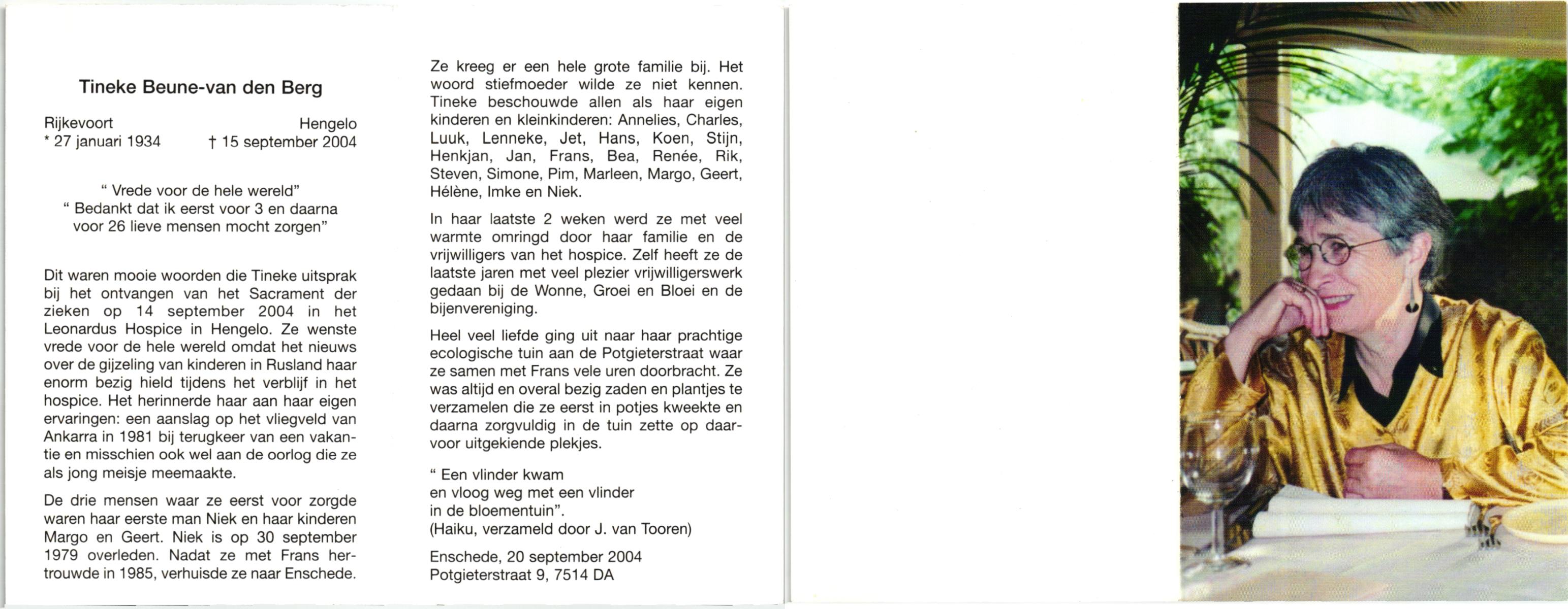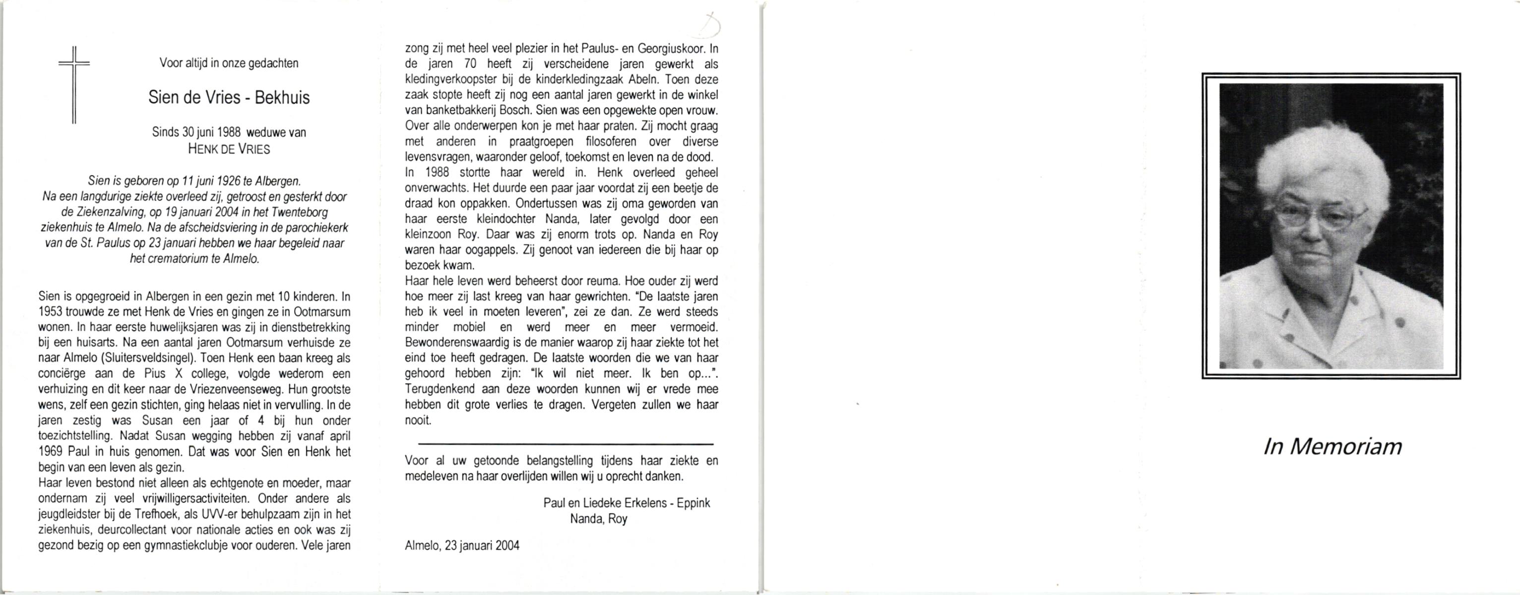 BEKHUIS, , Sien, geboren op 11-6-1926 te Albergen, overleden op 19-1-2004 te Almelo op 73-jarige leeftijd, gecremeerd op 23-1-2004 te Almelo.