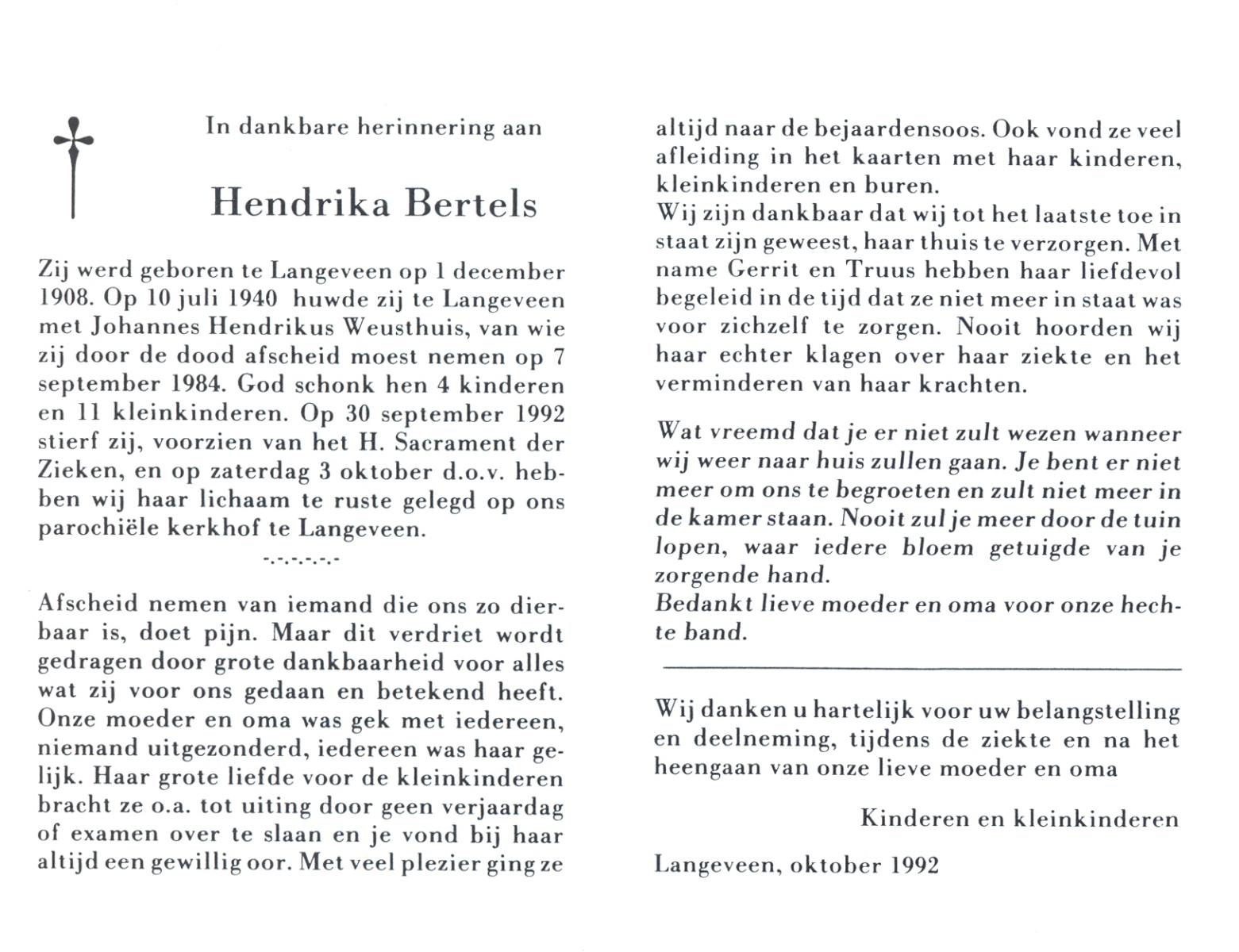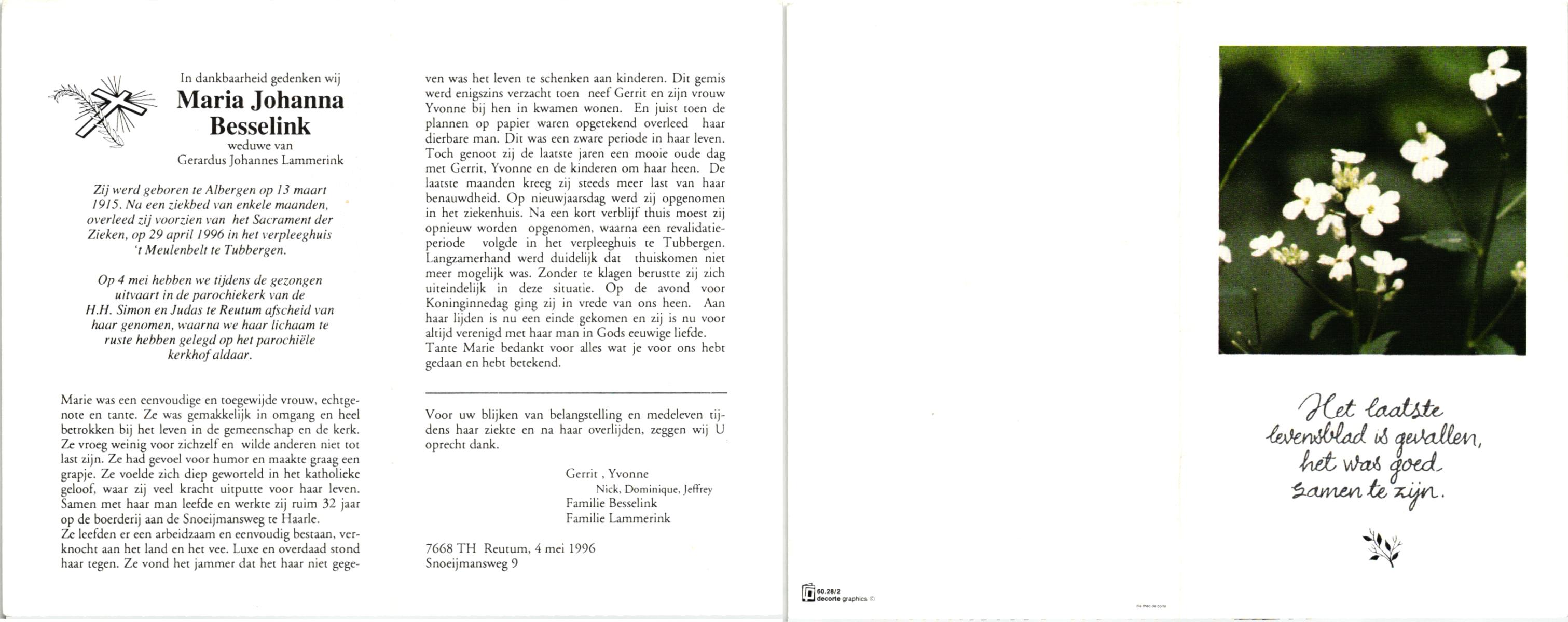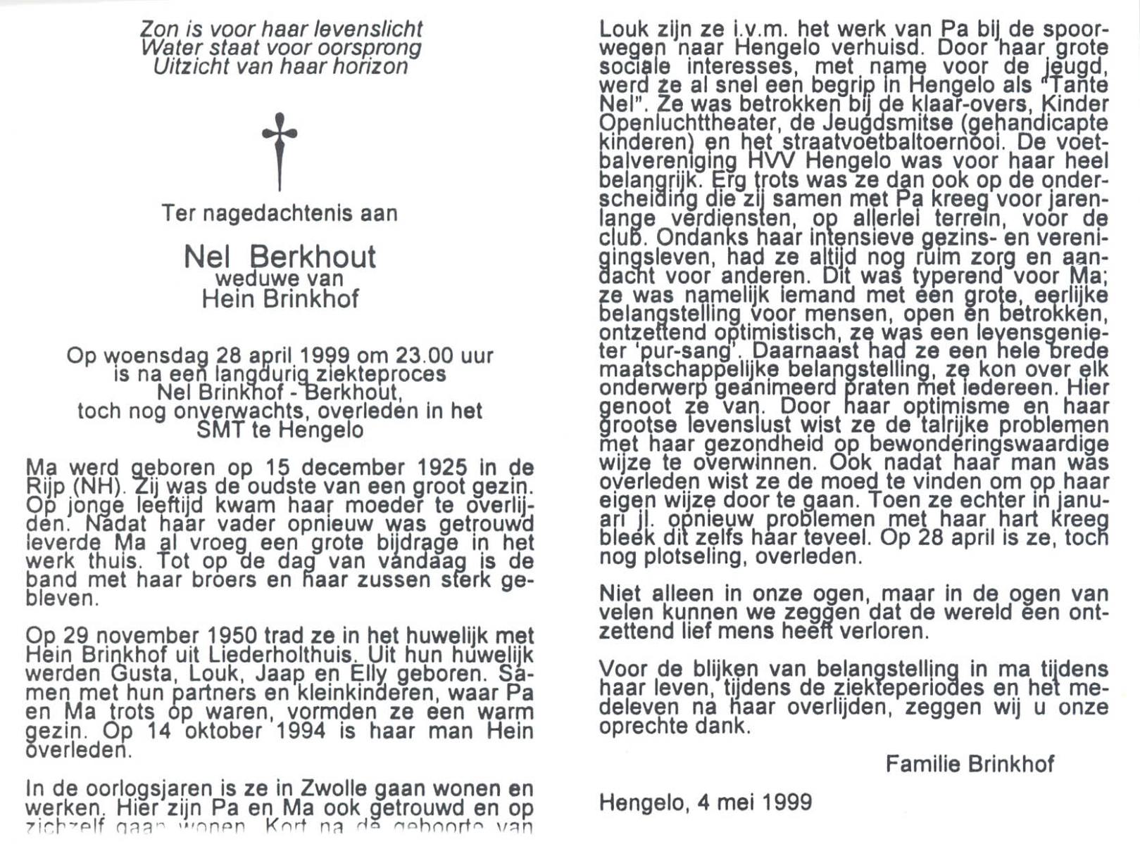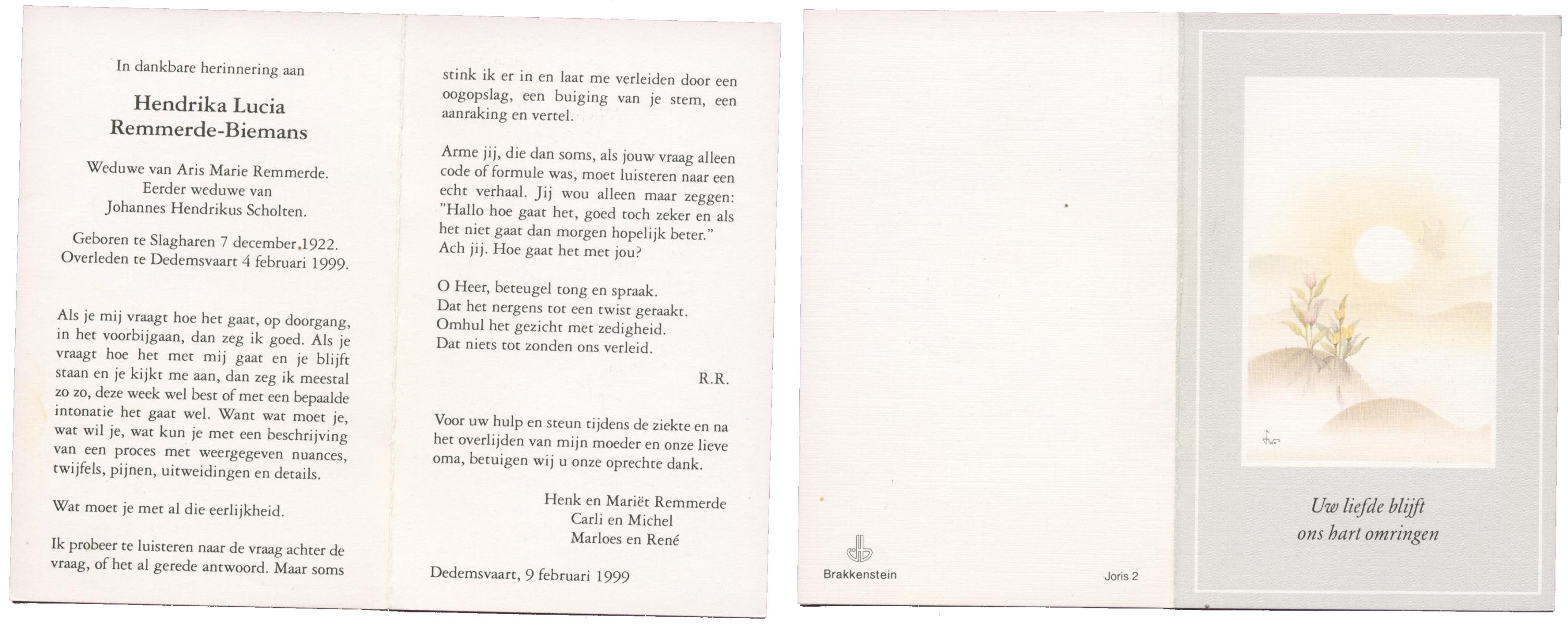BIEMANS, Hendrika Lucia, geboren op 7-12-1922 te Slagharen, overleden op 4-2-1999 te Dedemsvaart op 76-jarige leeftijd.