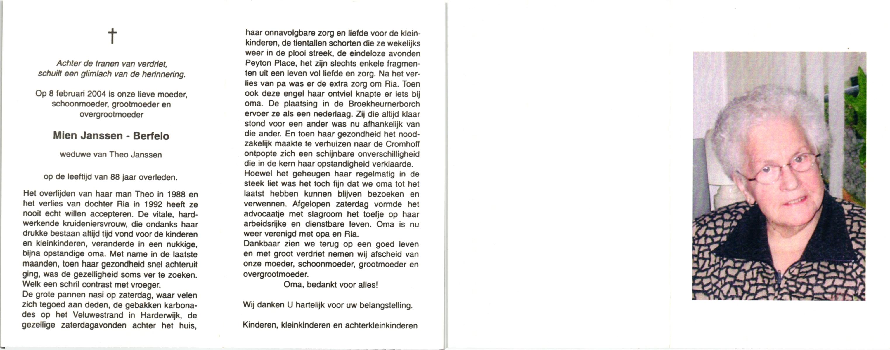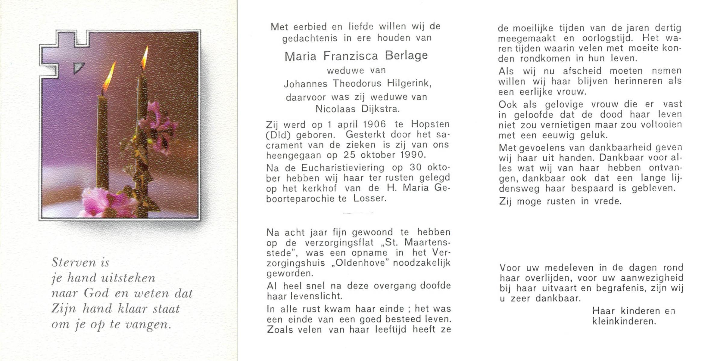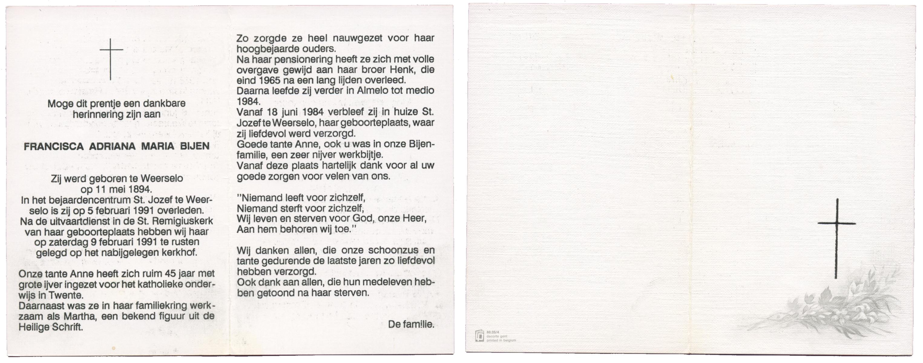 BIJEN, Francisca Adriana Maria, geboren op 11-05-1894 te Weerselo, overleden op 5-2-1991 te Weerselo op 96-jarige leeftijd, begraven op 9-2-1991 te Weerselo.