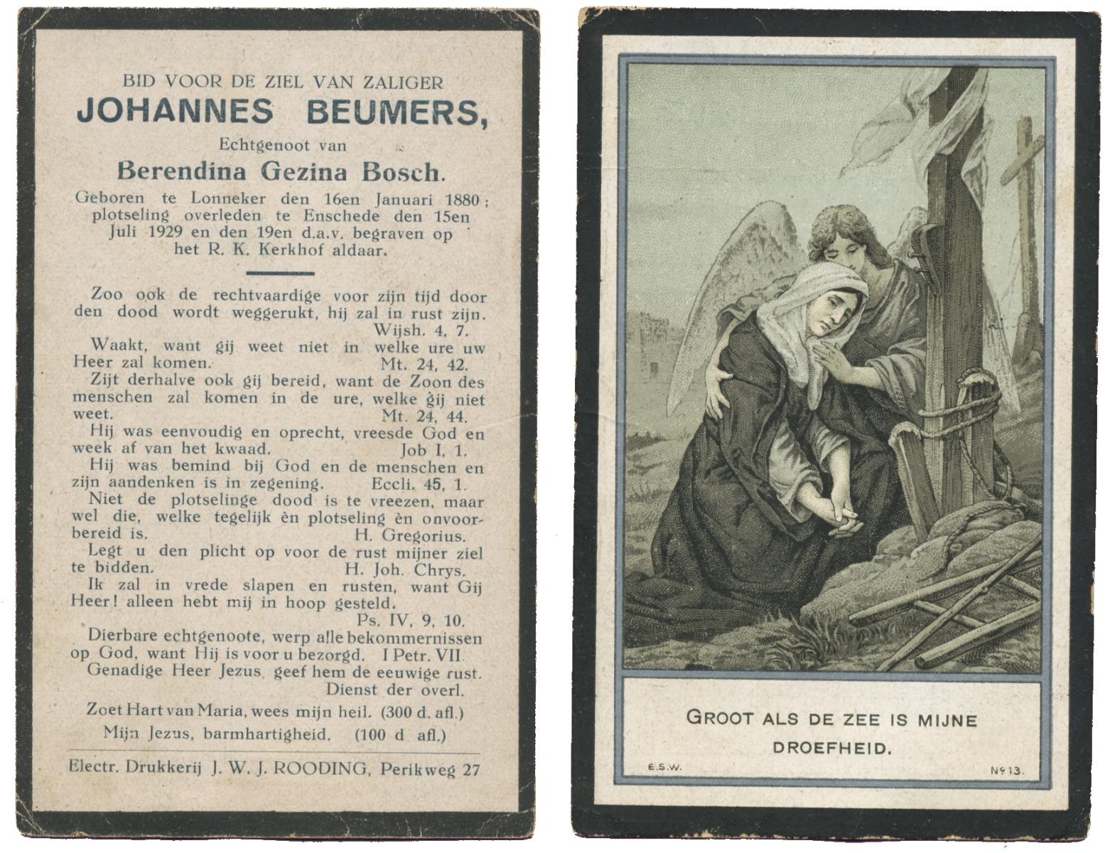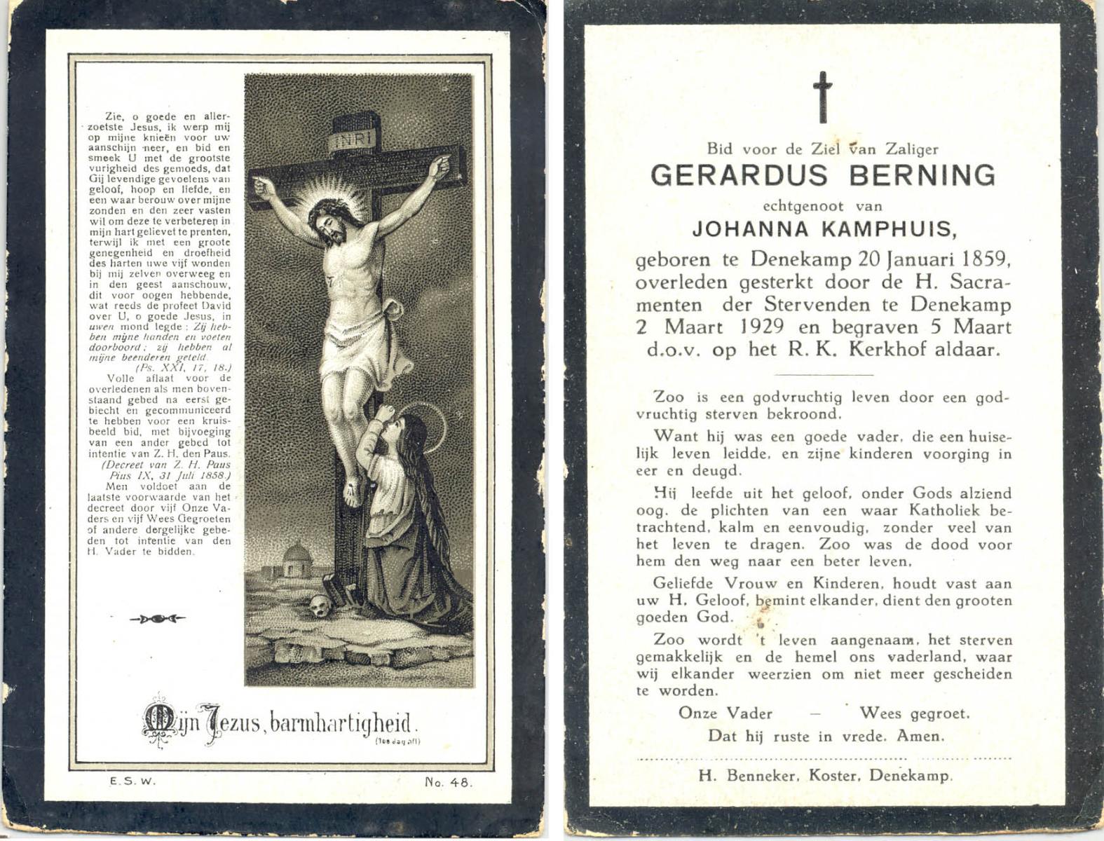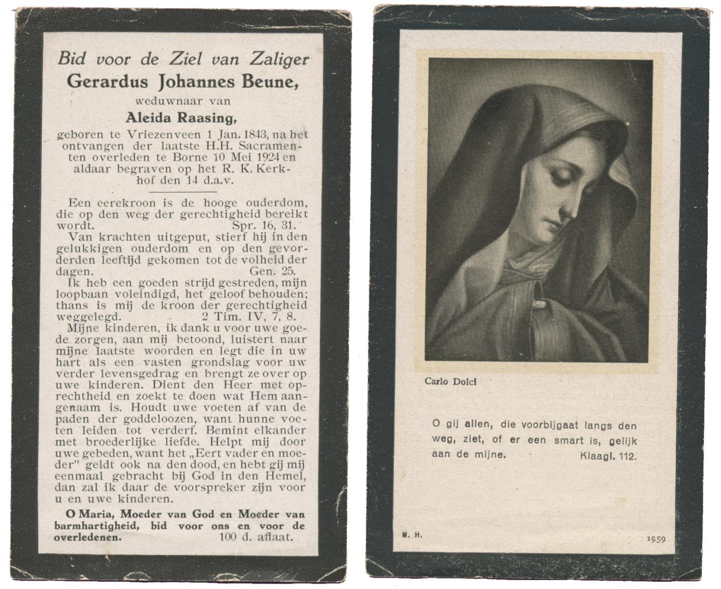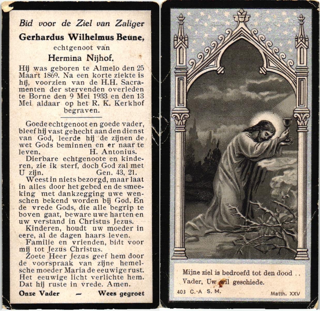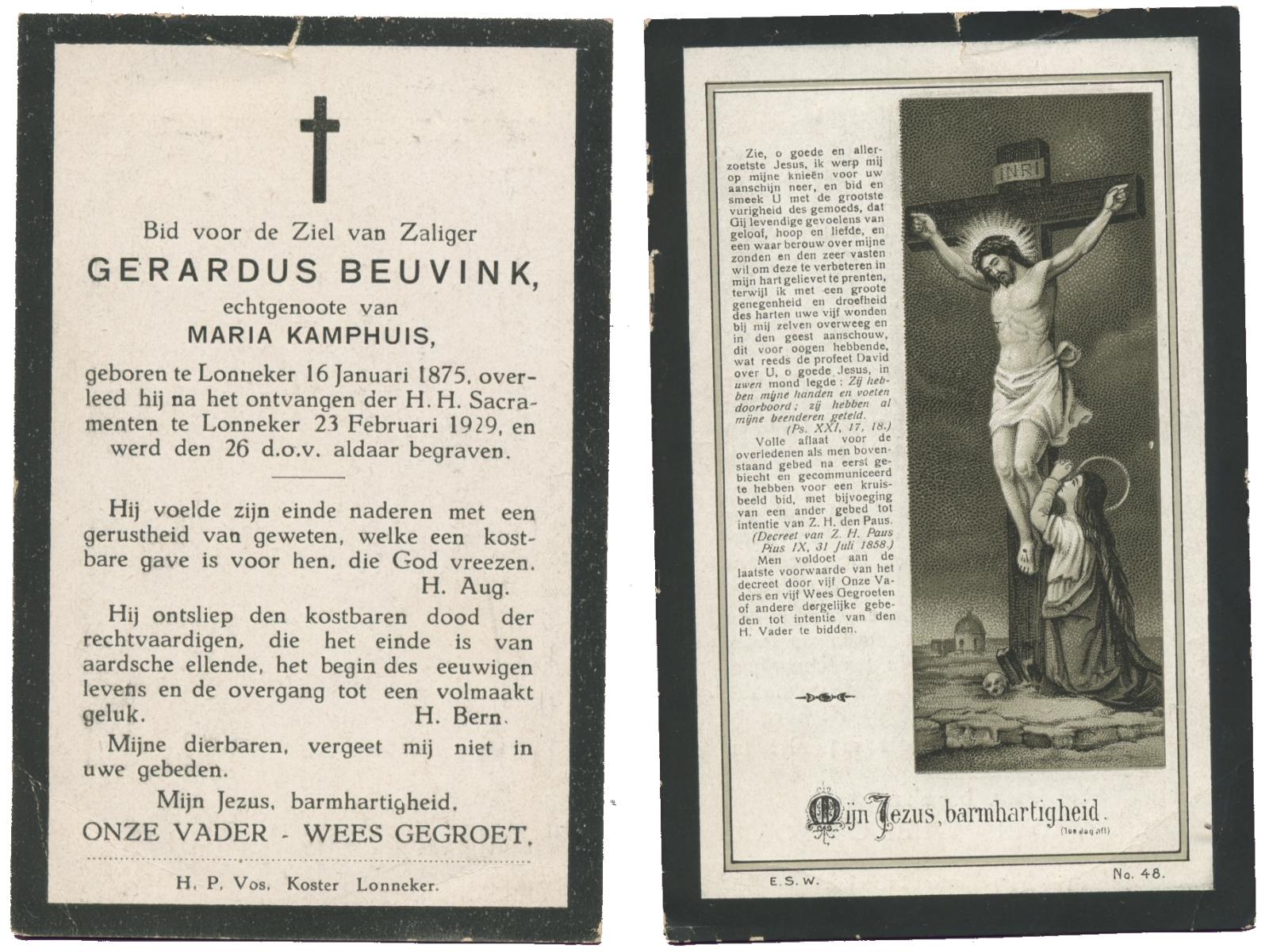BEUVINK, Gerardus, geboren op 16-01-1875 te Lonneker, overleden op 23-2-1929 te Lonneker op 54-jarige leeftijd, begraven op 26-2-1929 te Lonneker.