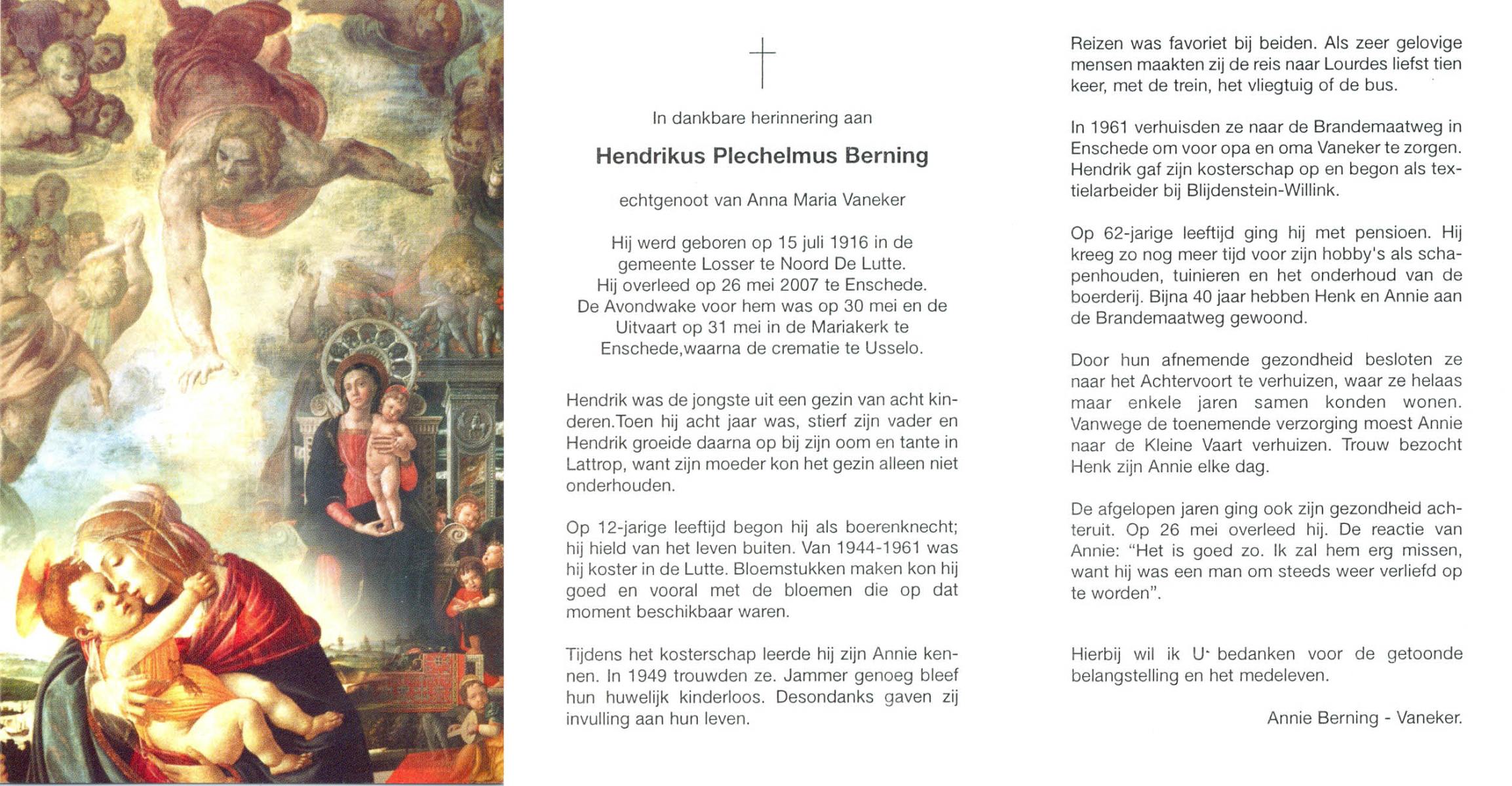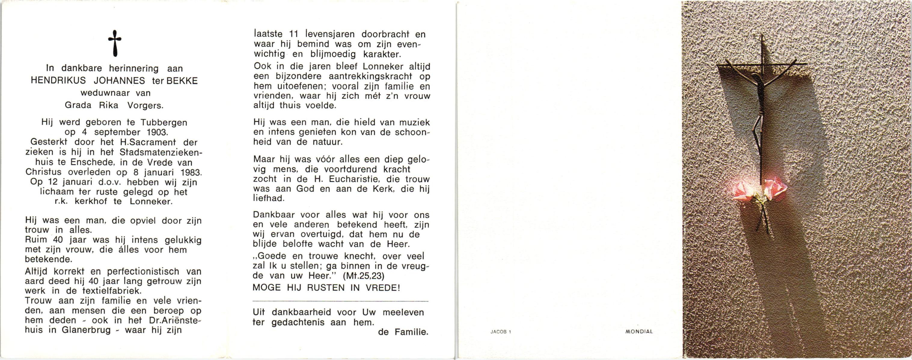 BEKKE, ter, Hendrikus Johannes, geboren op 4-9-1903 te Tubbergen, overleden op 8-1-1983 te Enschede, ziekenhuis op 79-jarige leeftijd, begraven op 12-1-1983 te Lonneker.