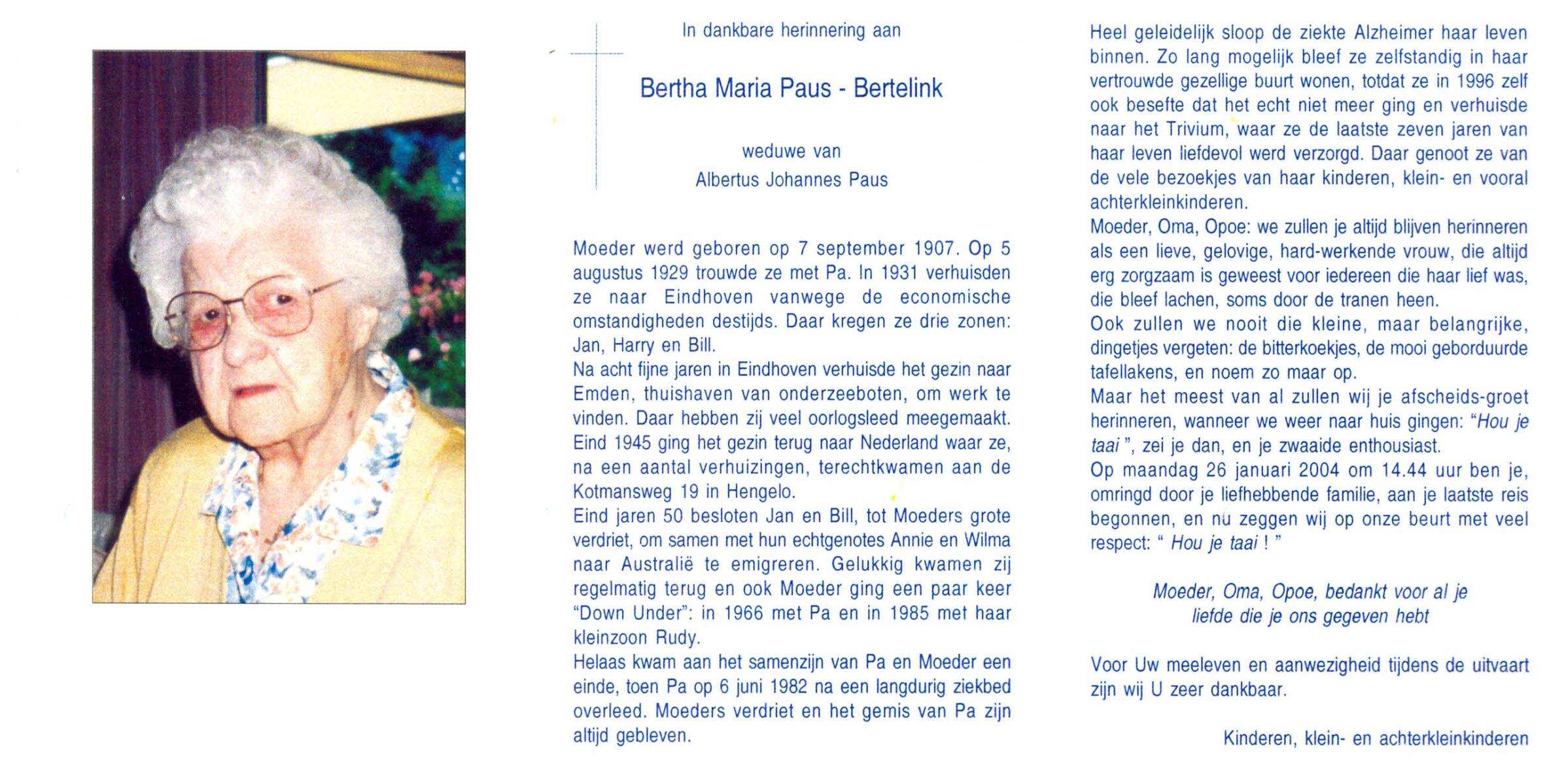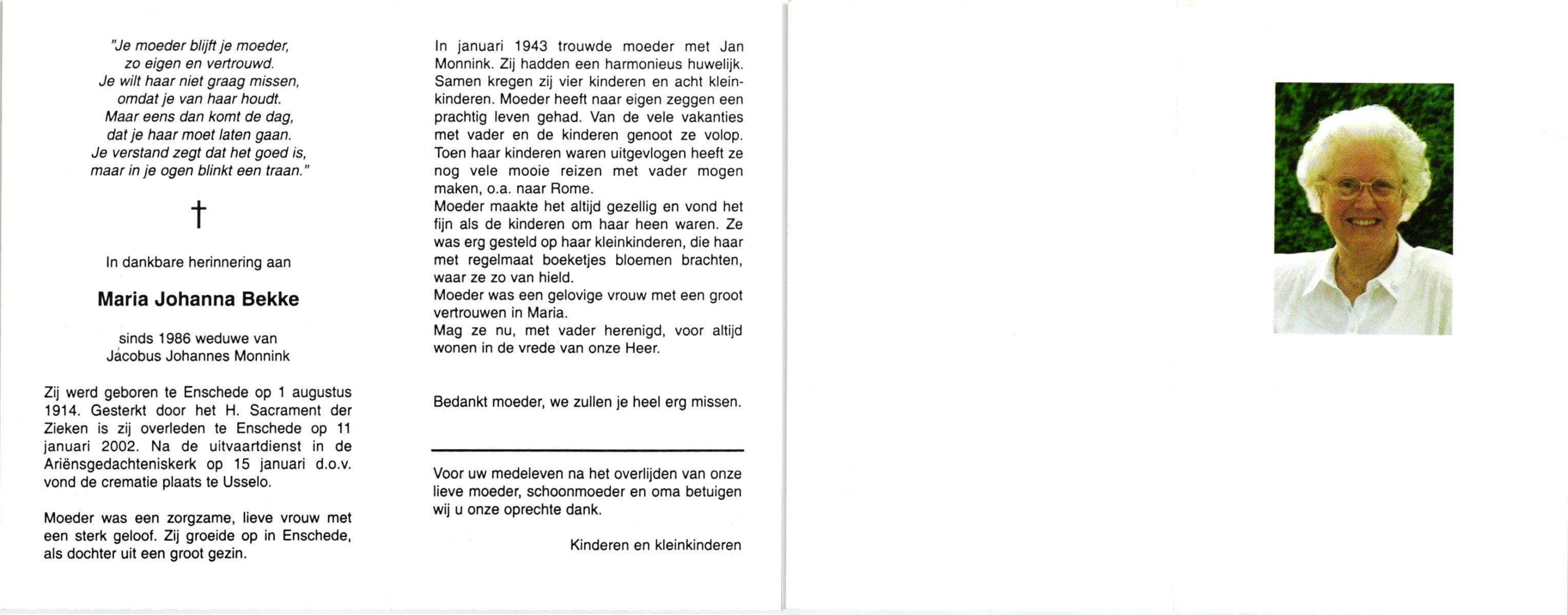 BEKKE, , Maria Johanna, geboren op 1-8-1914 te Enschede, overleden op 11-1-2002 te Enschede op 87-jarige leeftijd, gecremeerd op 15-1-2002 te Usselo.