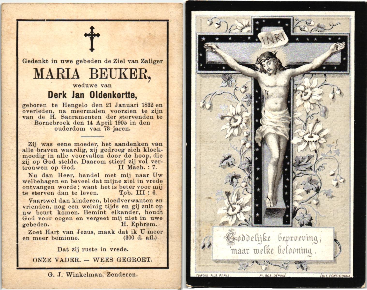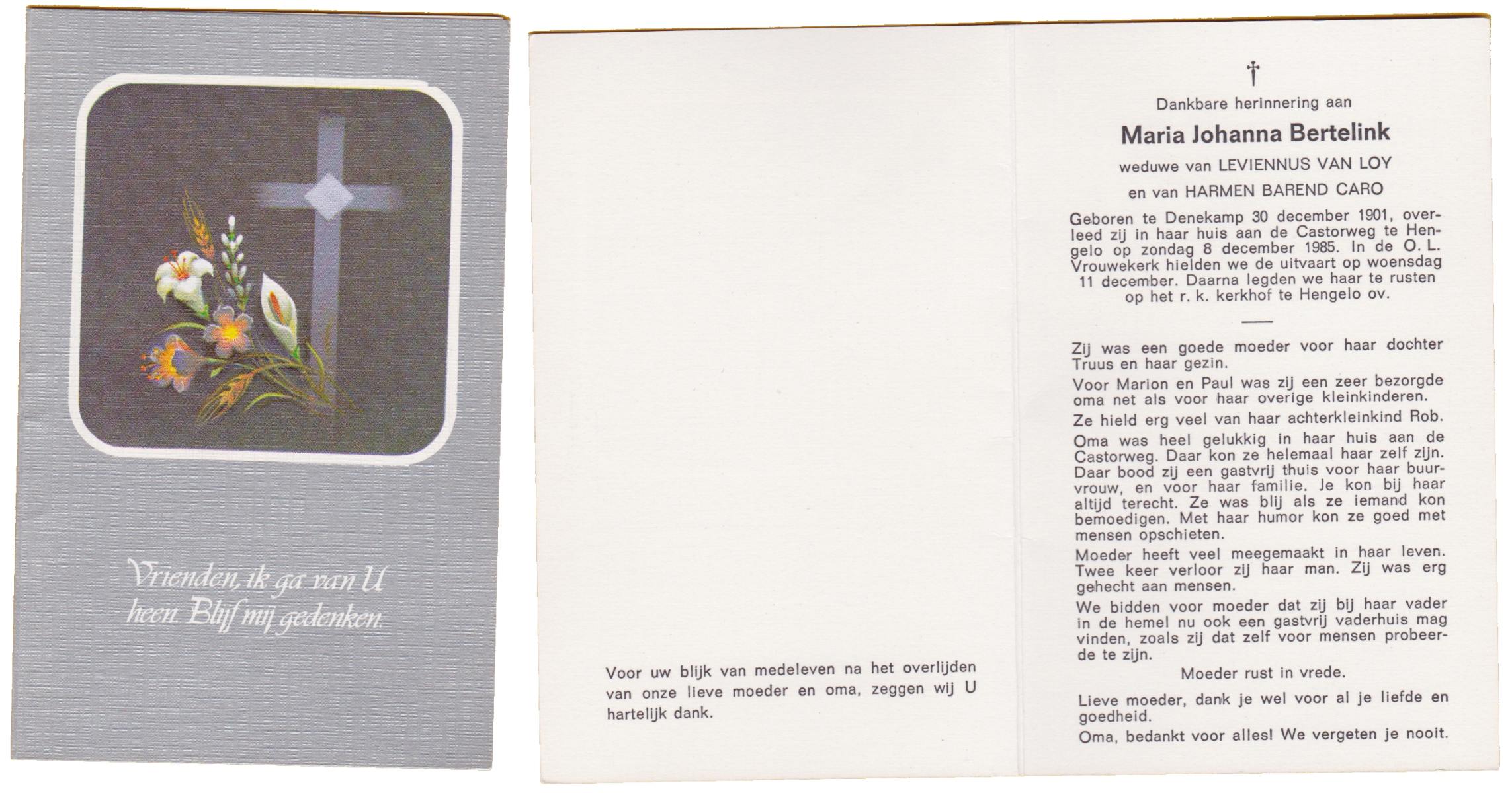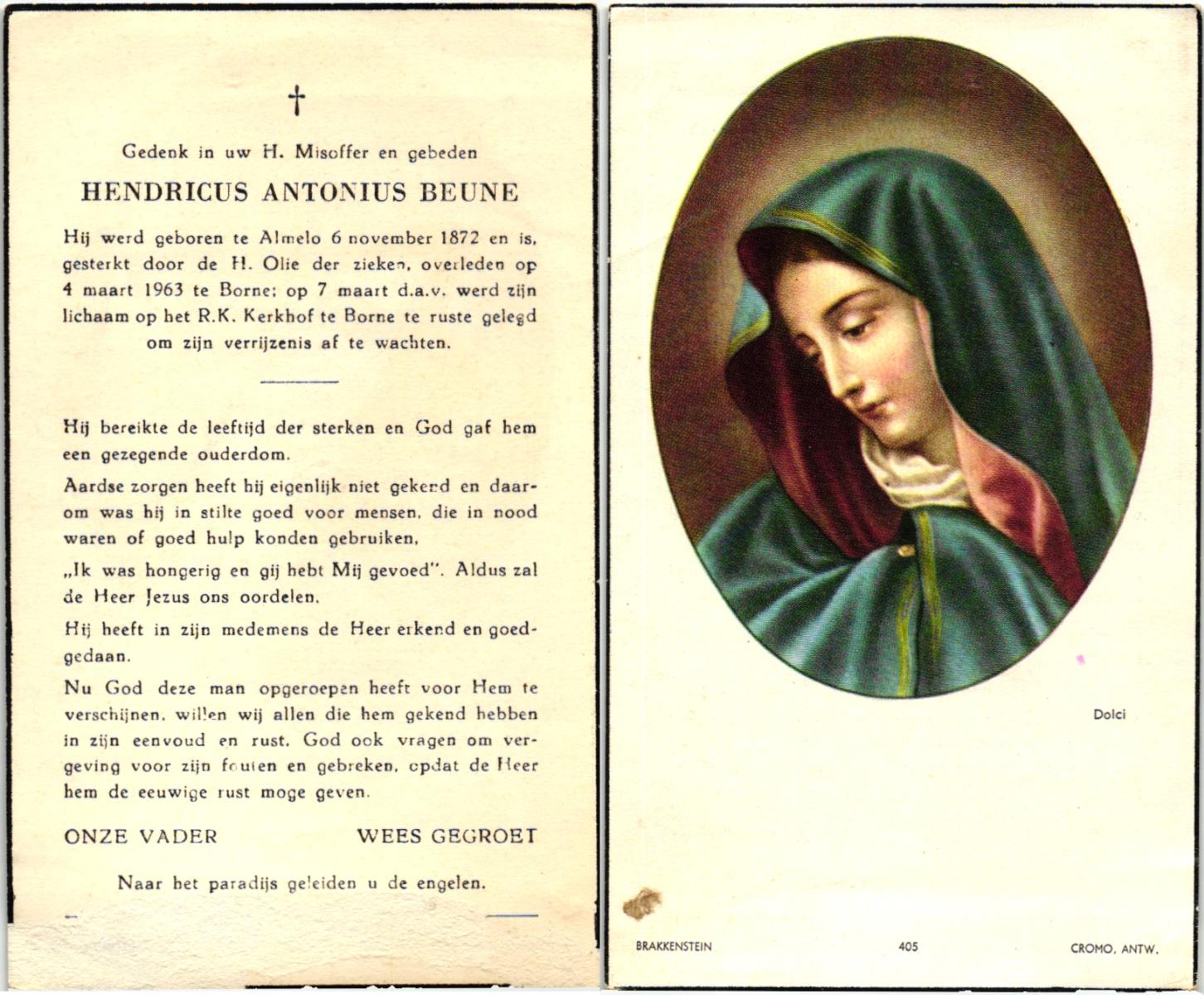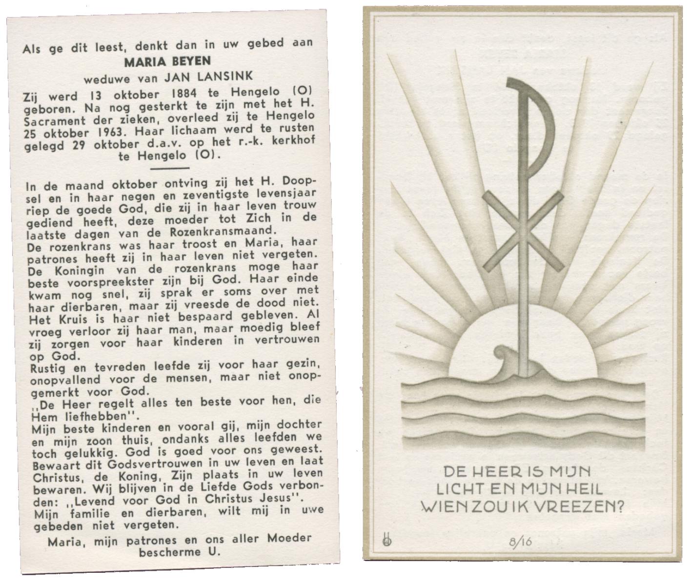 BEYEN, Maria, geboren op 13-10-1884 te Hengelo (O), overleden op 25-10-1963 te Hengelo (Ov.) op 79-jarige leeftijd, begraven op 29-10-1963 te Hengelo (Ov.).