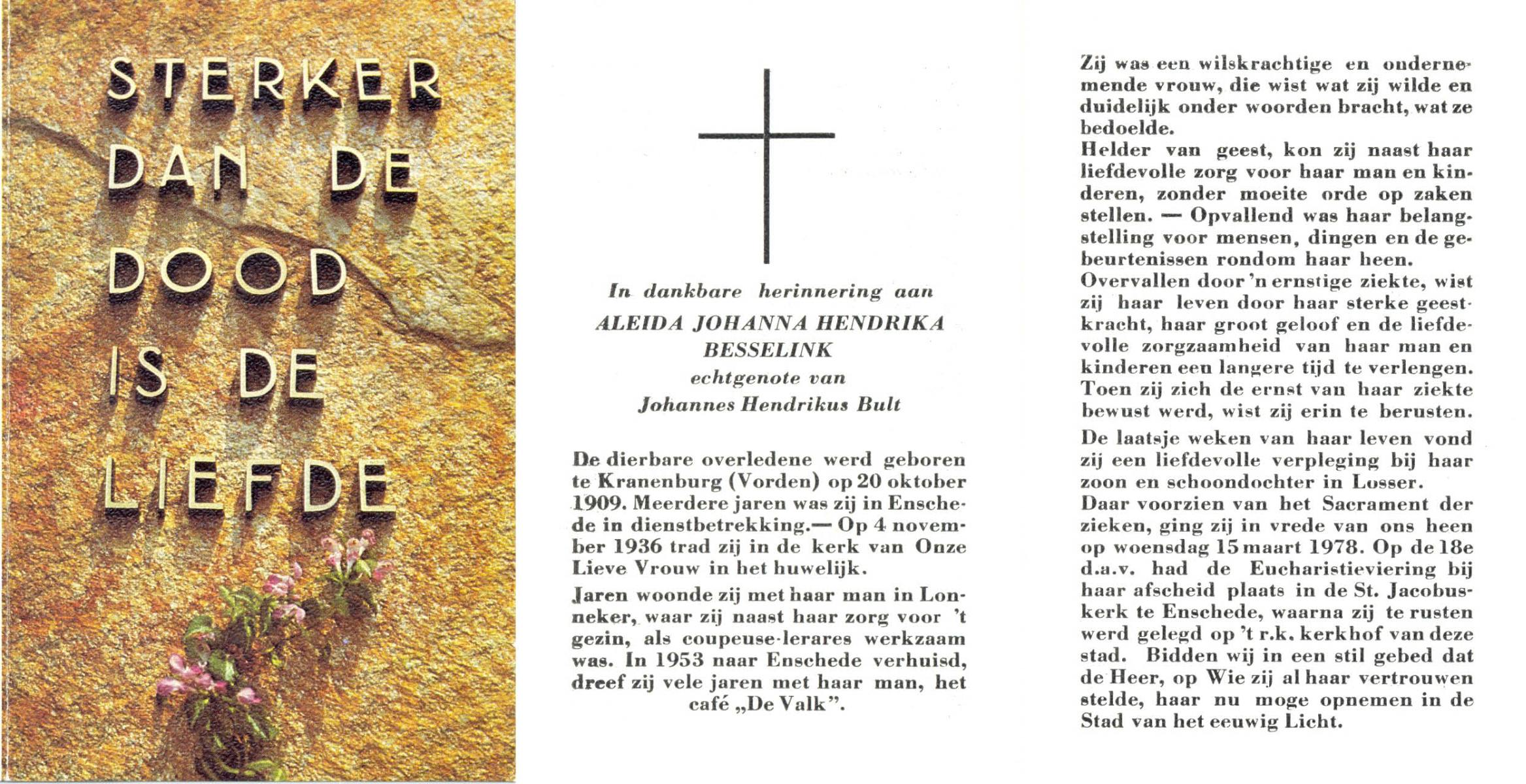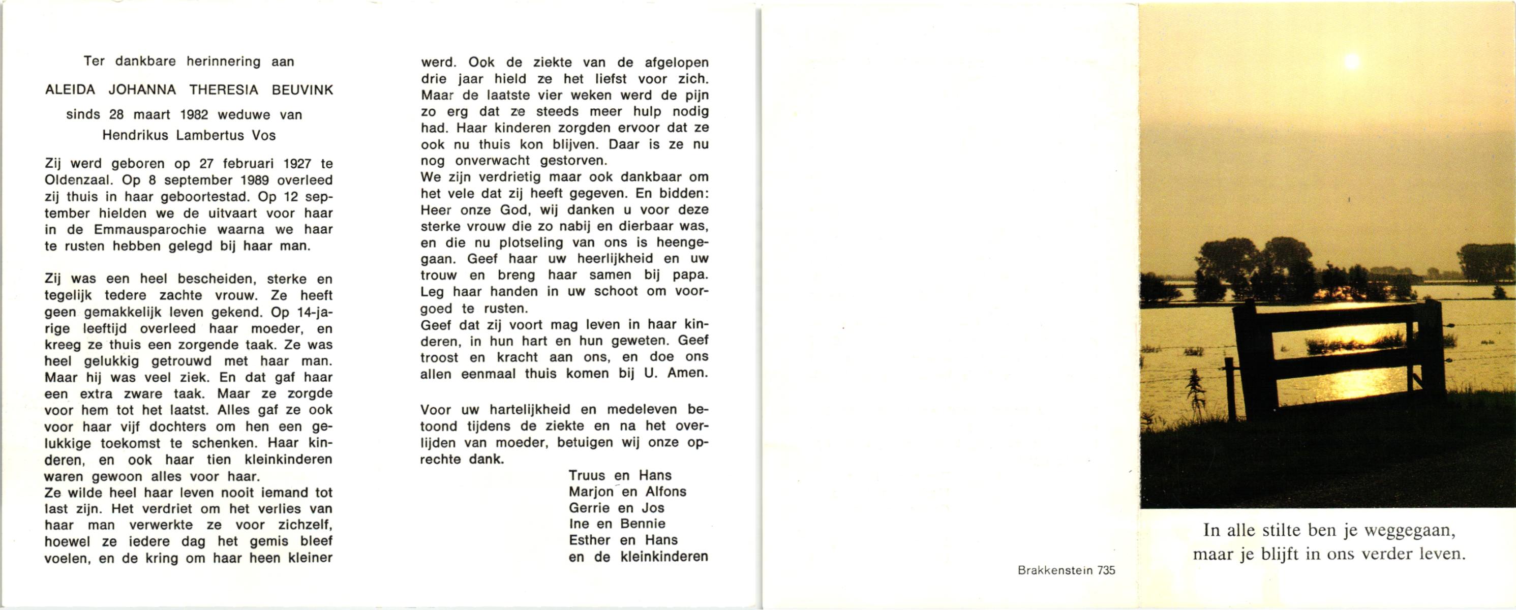 BEUVINK, , Aleida Johanna Theresia, geboren op 27-2-1927 te Oldenzaal, overleden op 8-9-1989 te Oldenzaal op 62-jarige leeftijd, begraven te Oldenzaal.