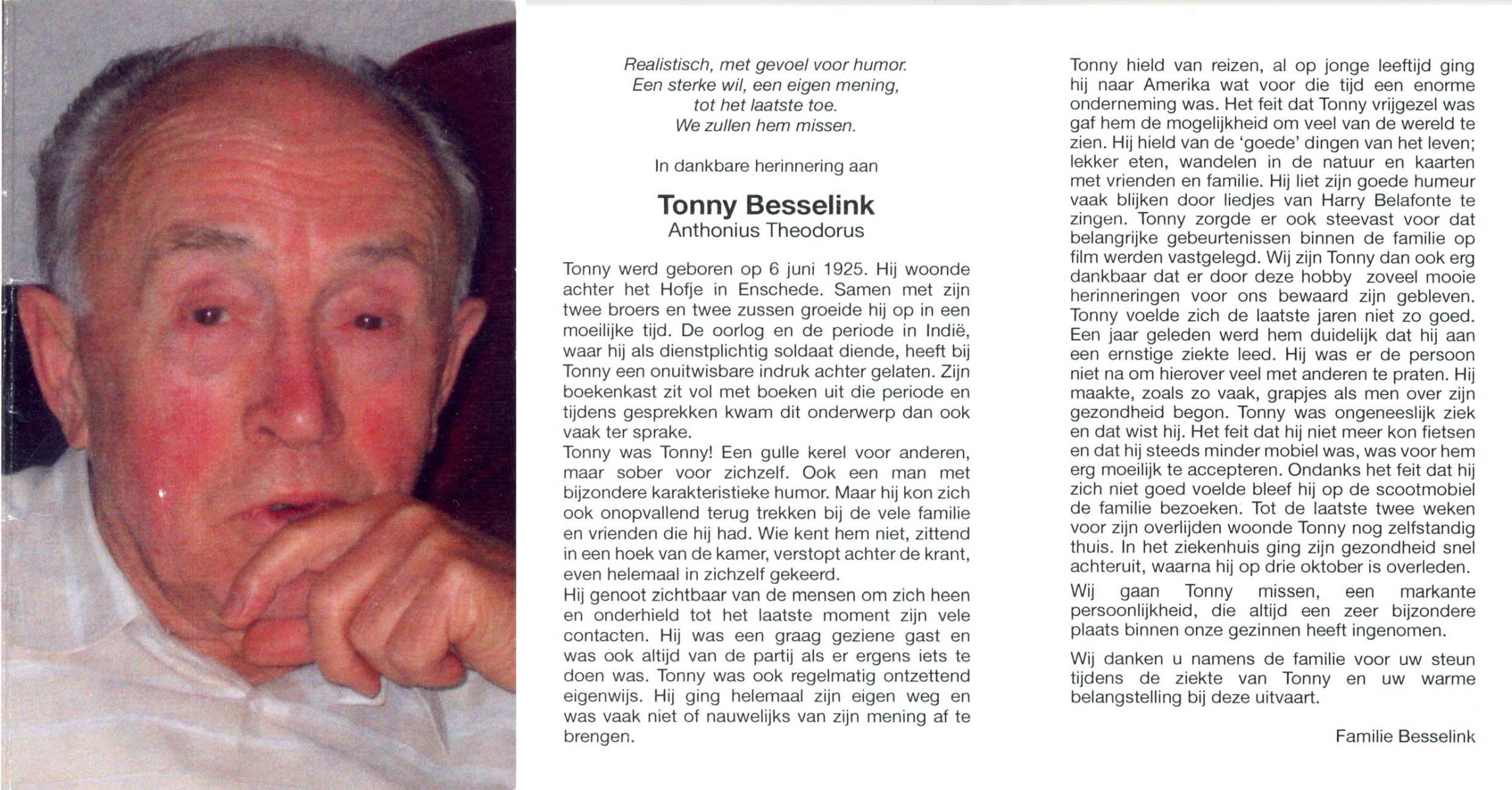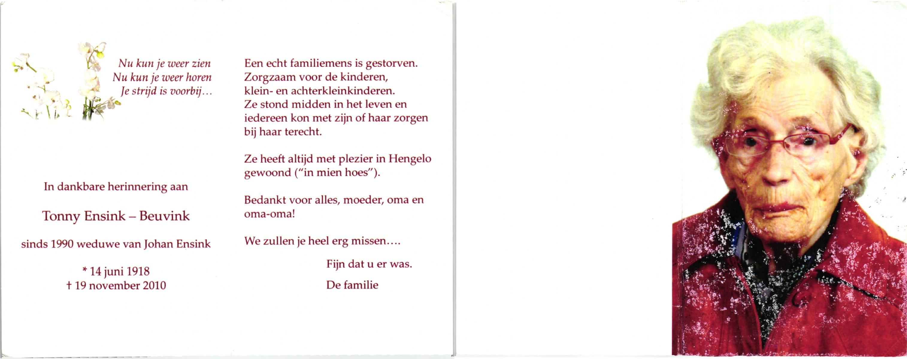 BEUVINK, , Tonny, geboren op 14-6-1918, overleden op 19-11-2010 te Hengelo (O) op 92-jarige leeftijd.