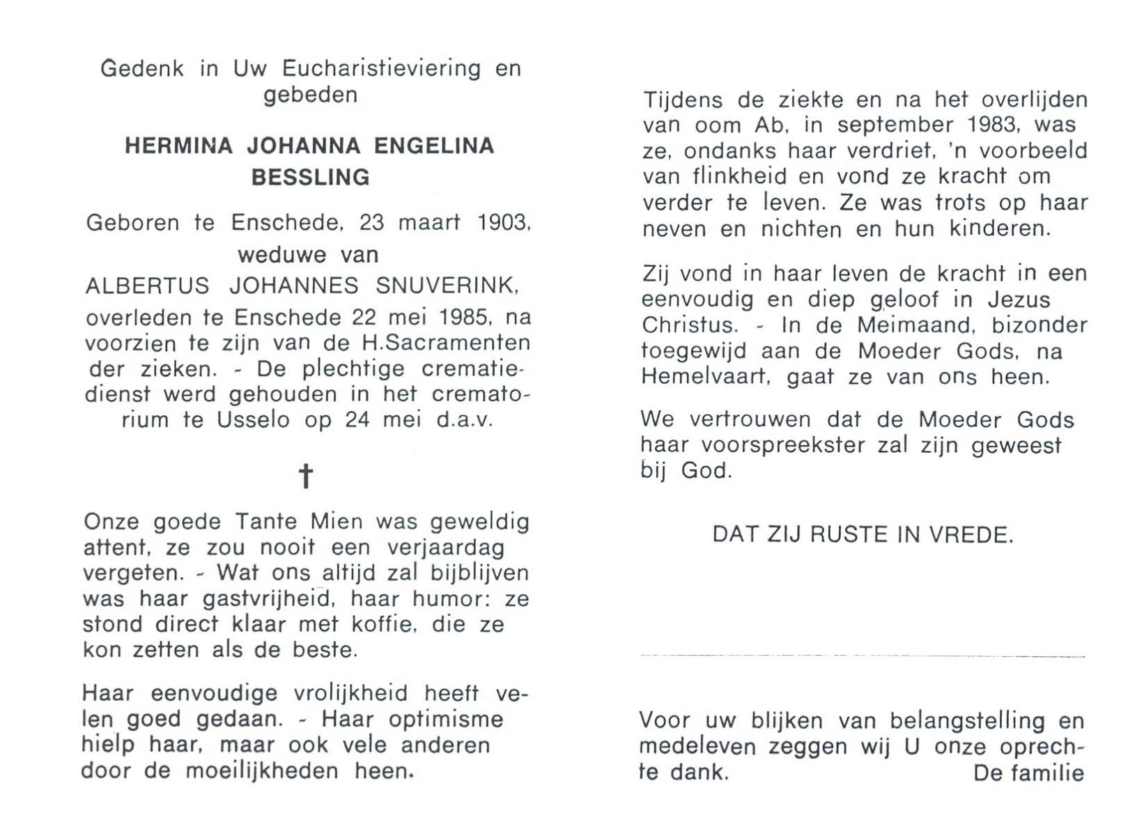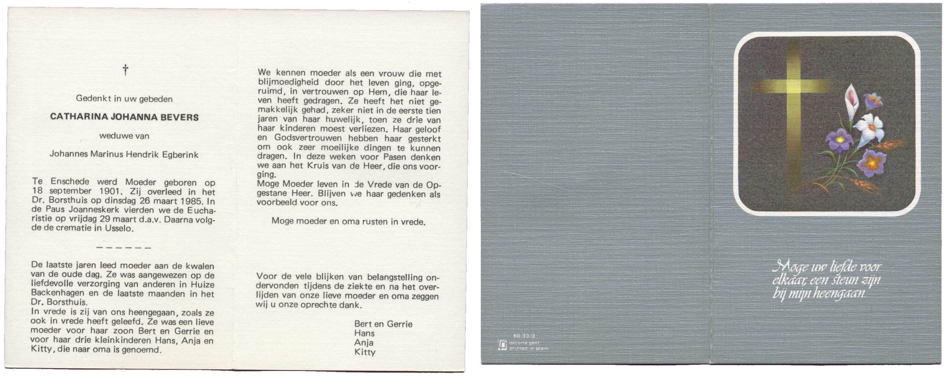 BEVERS, Catharina Johanna, geboren op 18-9-1901 te Enschede, overleden op 26-3-1985 te Enschede op 83-jarige leeftijd, gecremeerd op 29-3-1985 te Usselo.