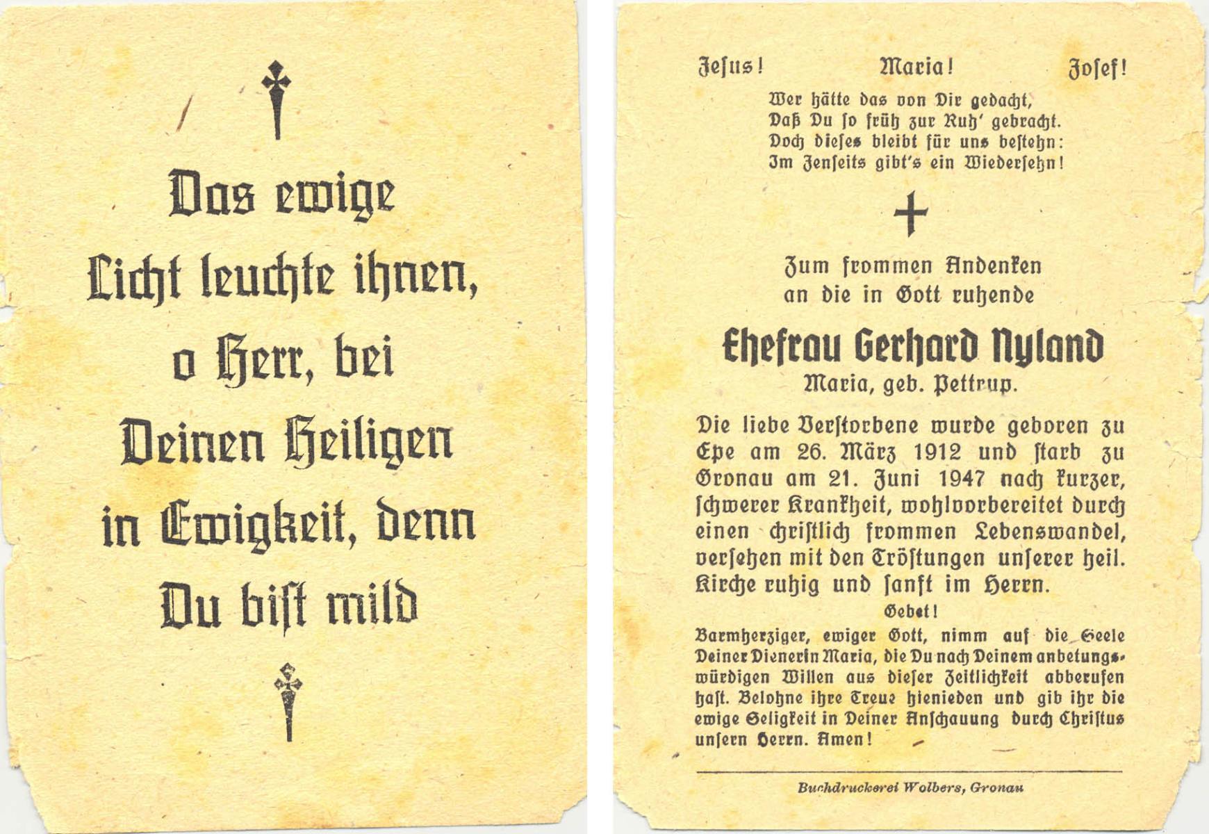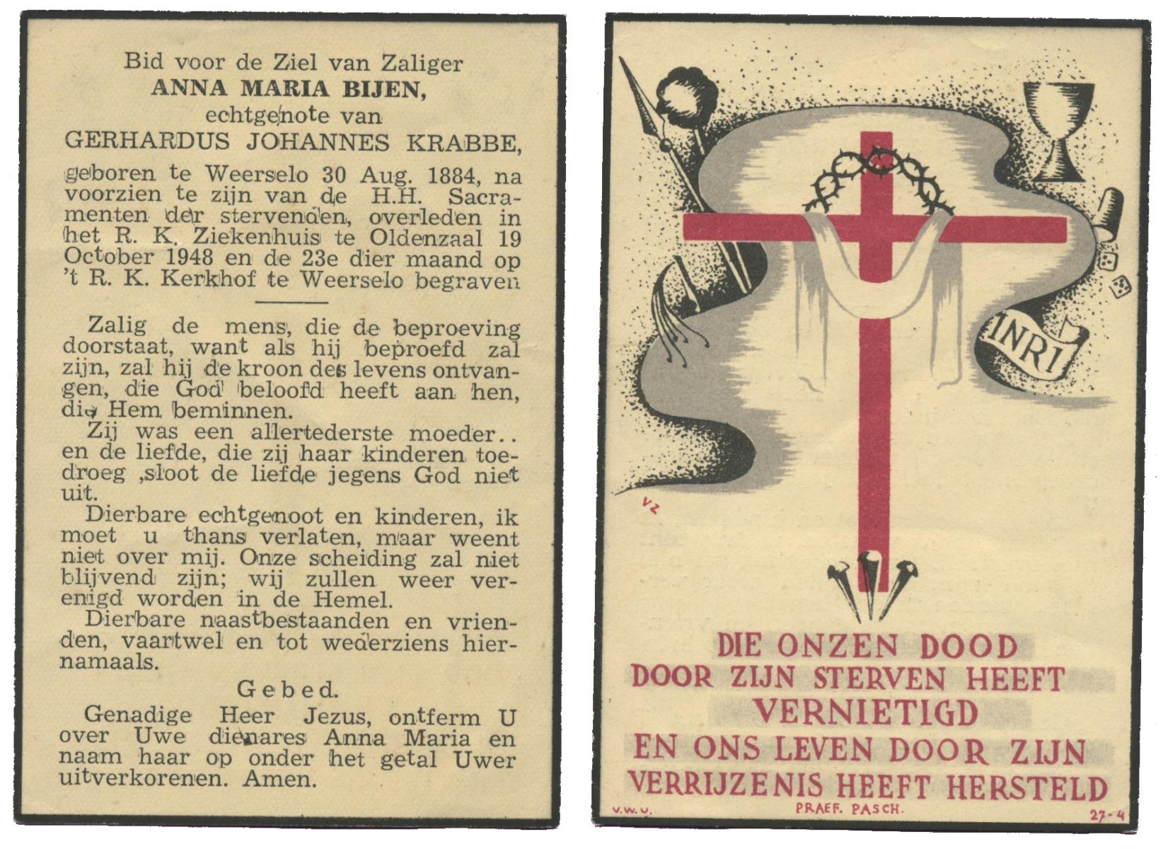 BIJEN, Anna Maria, geboren op 30-08-1884 te Weerselo, overleden op 19-10-1948 te Oldenzaal op 64-jarige leeftijd, begraven op 19-10-1948 te Weerselo.