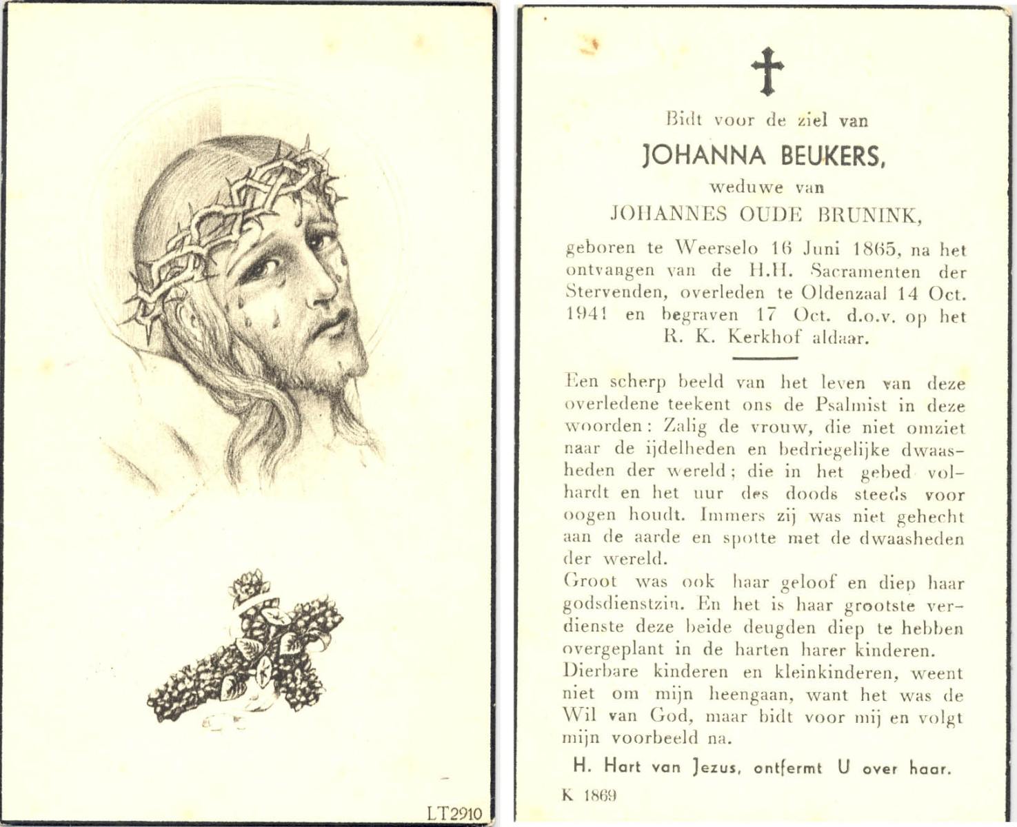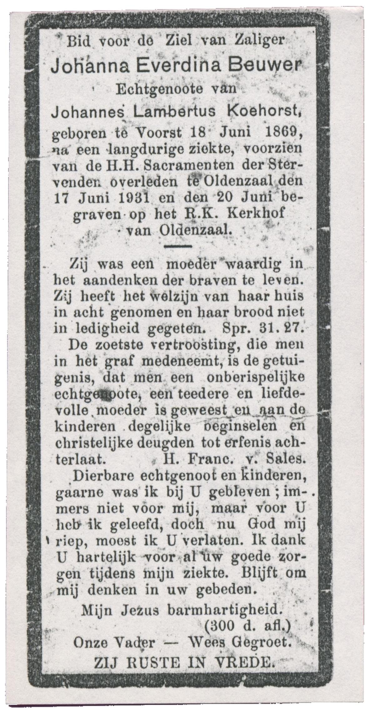 BEUWER, Johanna Everdina, geboren op 18-06-1869 te Voorst, overleden op 17-6-1931 te Oldenzaal op 61-jarige leeftijd, begraven op 20-6-1931 te Oldenzaal.
