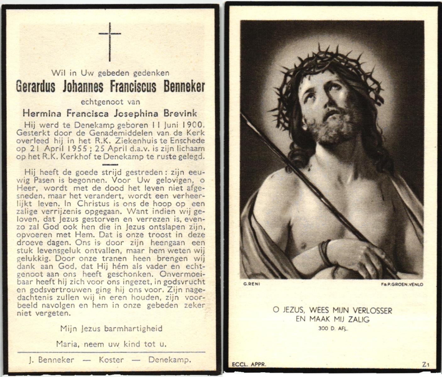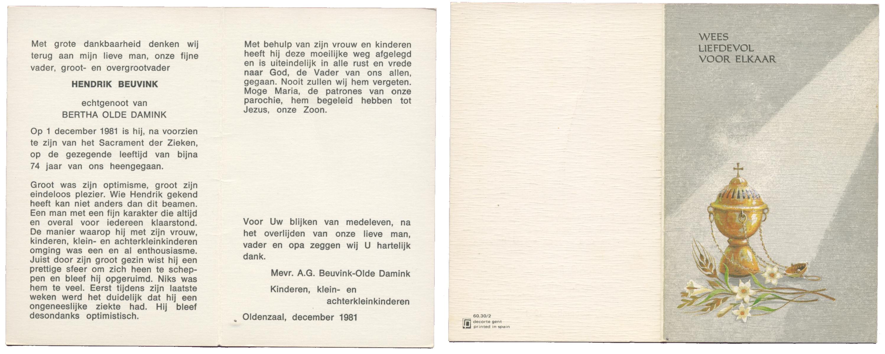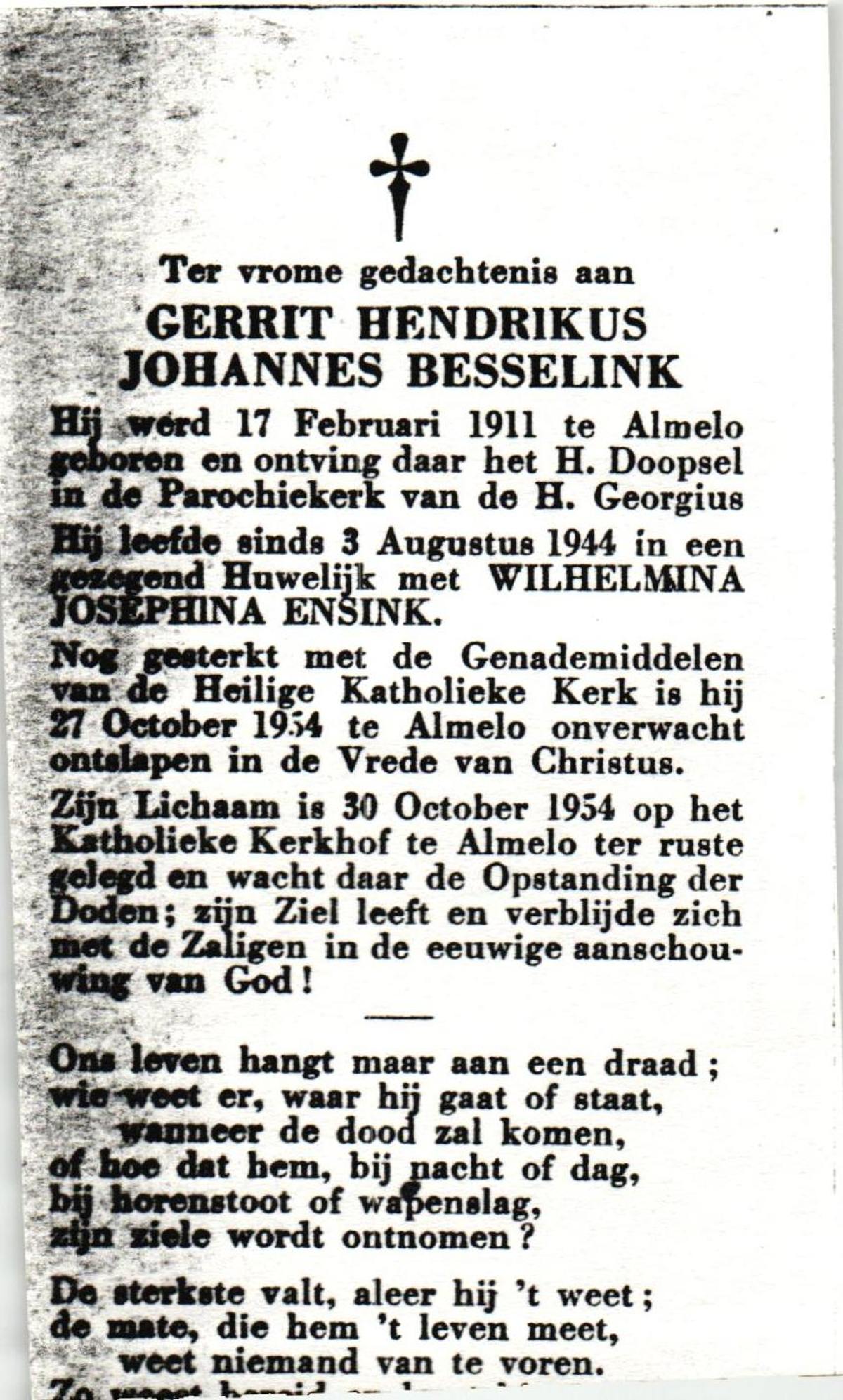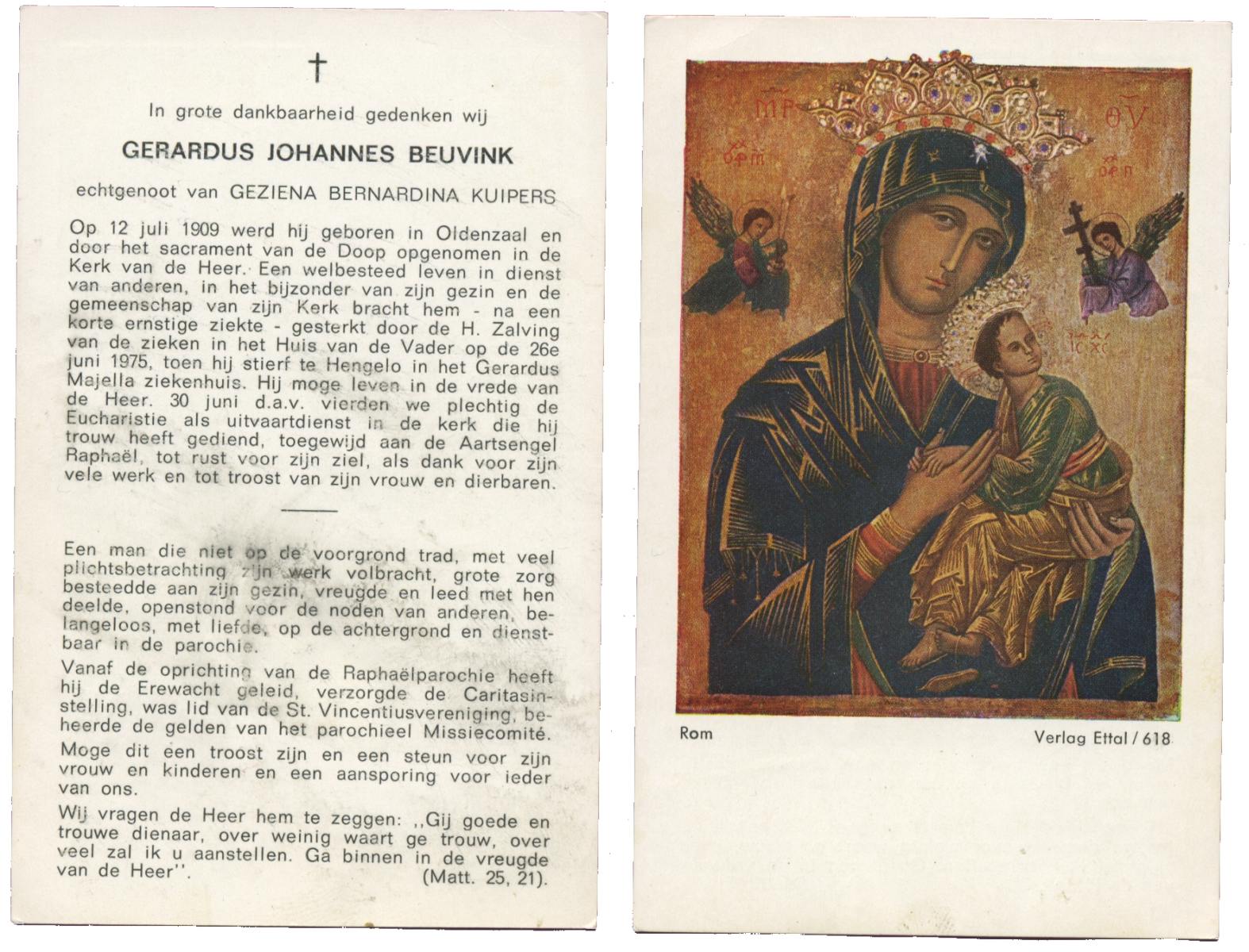 BEUVINK, Gerardus Johannes, geboren op 12-7-1909 te Oldenzaal, overleden op 26-6-1975 te Hengelo (Ov.) op 65-jarige leeftijd.