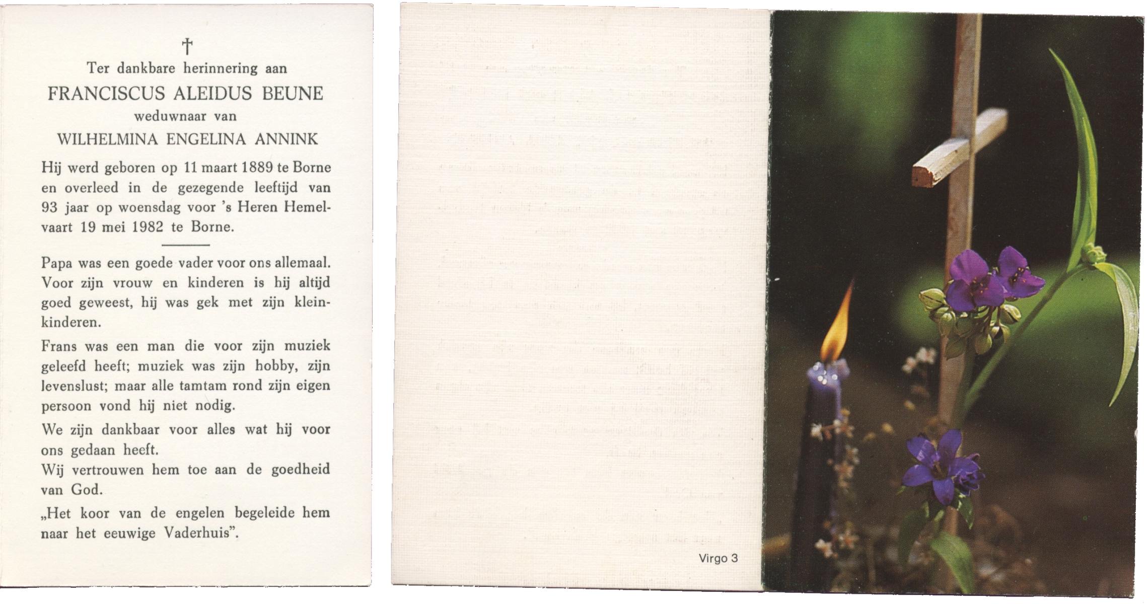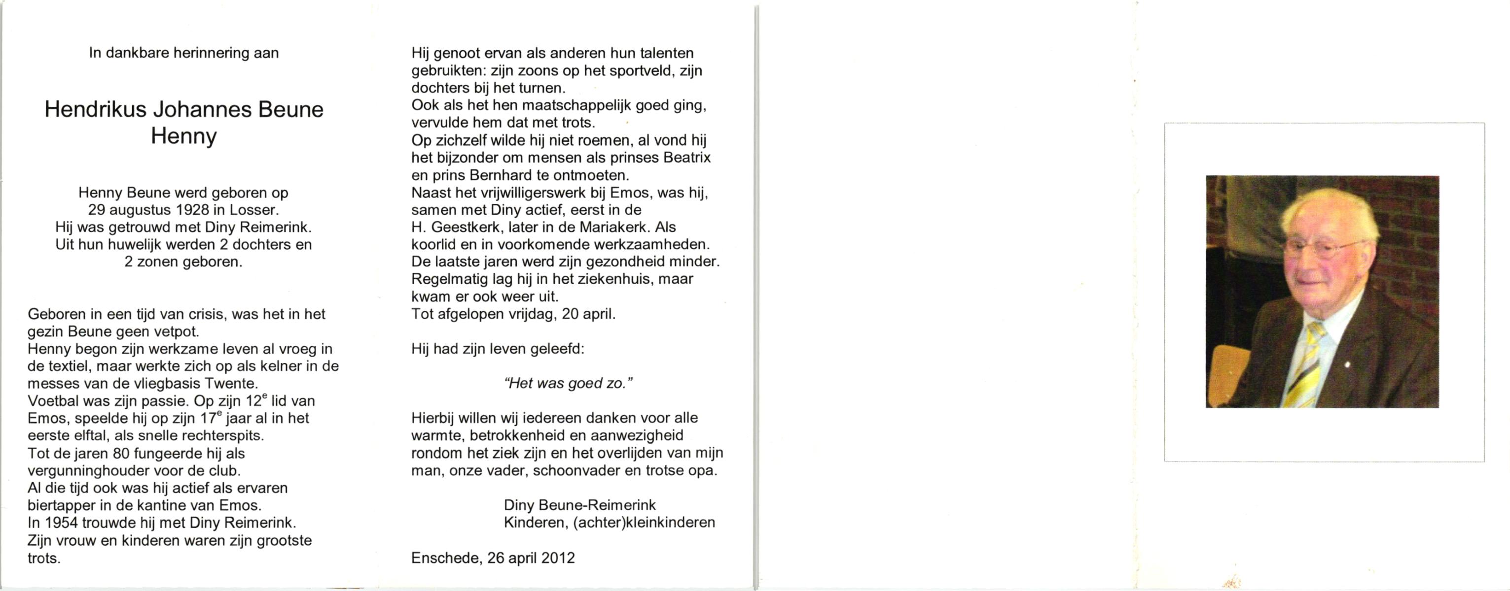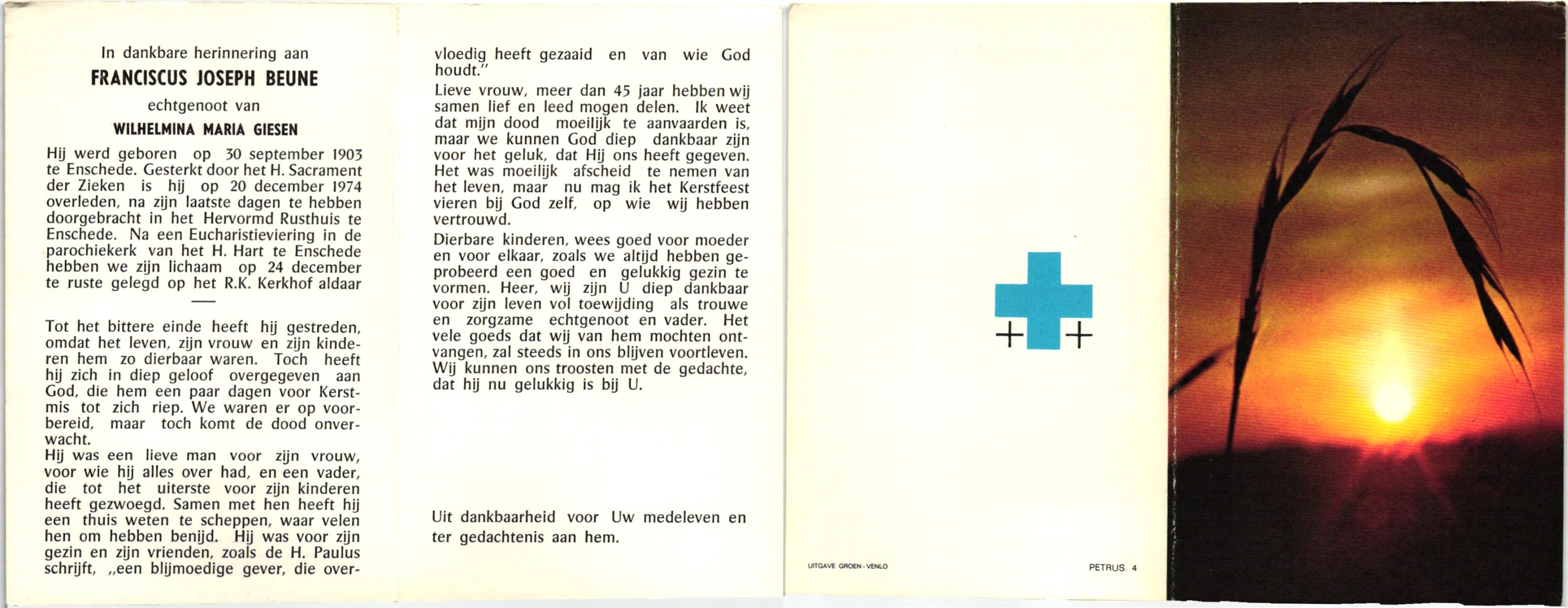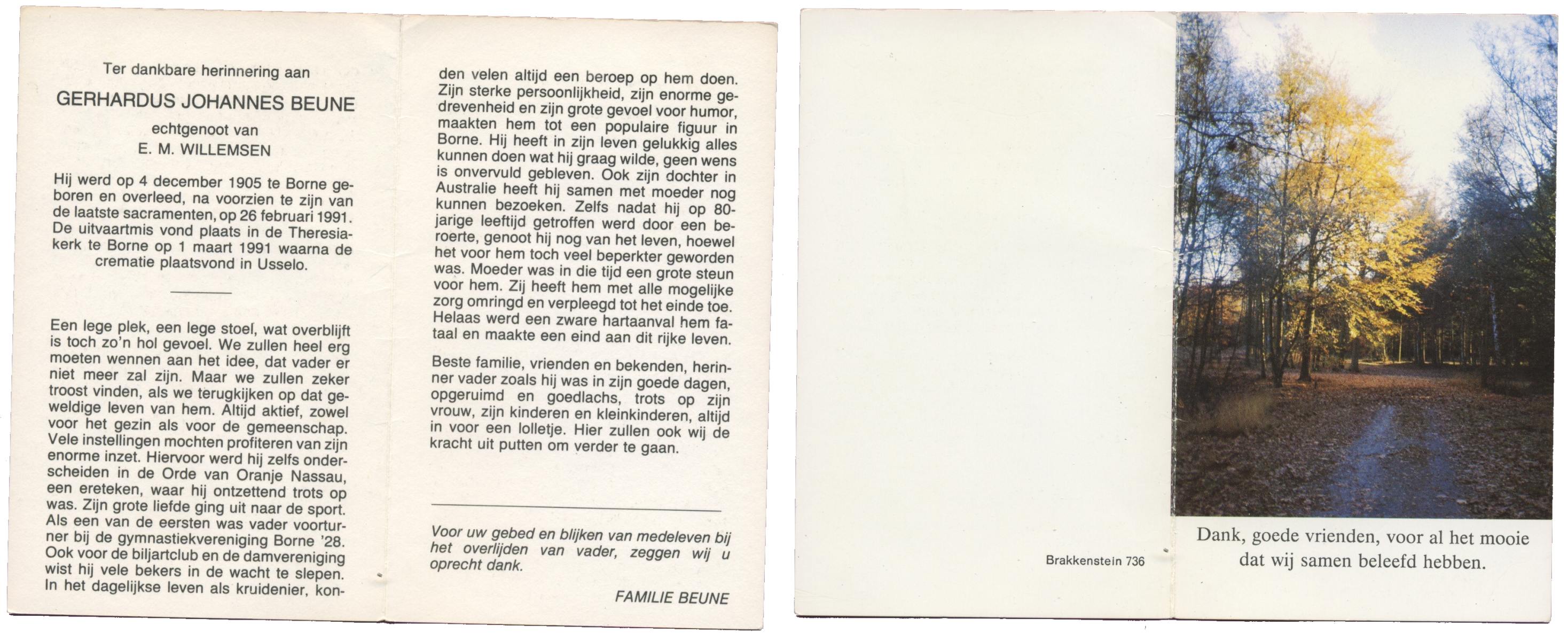 BEUVINK, Gerardus Johannes, geboren op 12-7-1909 te Oldenzaal, overleden op 26-6-1975 te Hengelo (Ov.) op 65-jarige leeftijd.