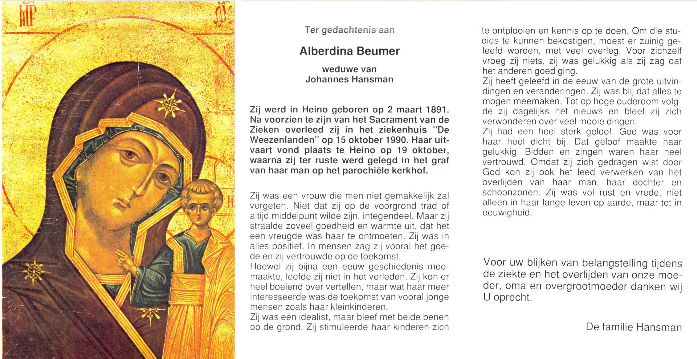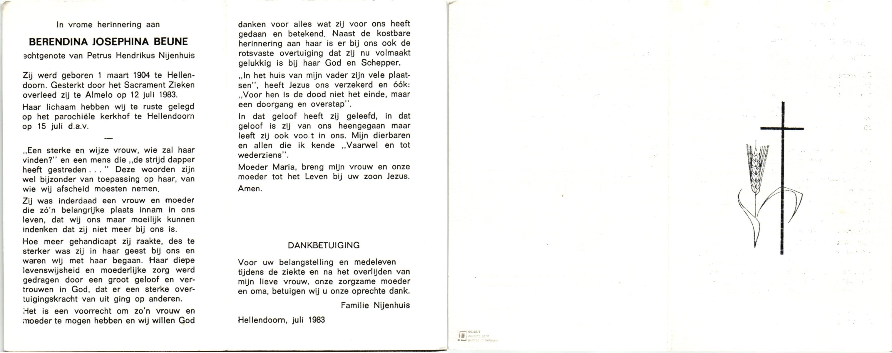 BEUWER, Antonia Alberta, geboren op 1-7-1907 te Heeten, overleden op 15-7-1995 te Raalte op 87-jarige leeftijd, begraven op 20-7-1995 te Heeten.