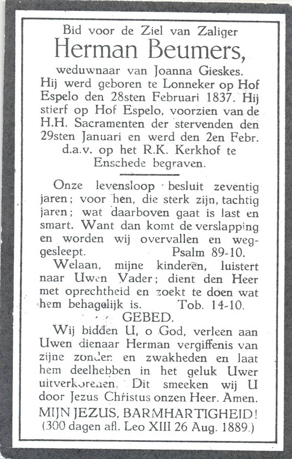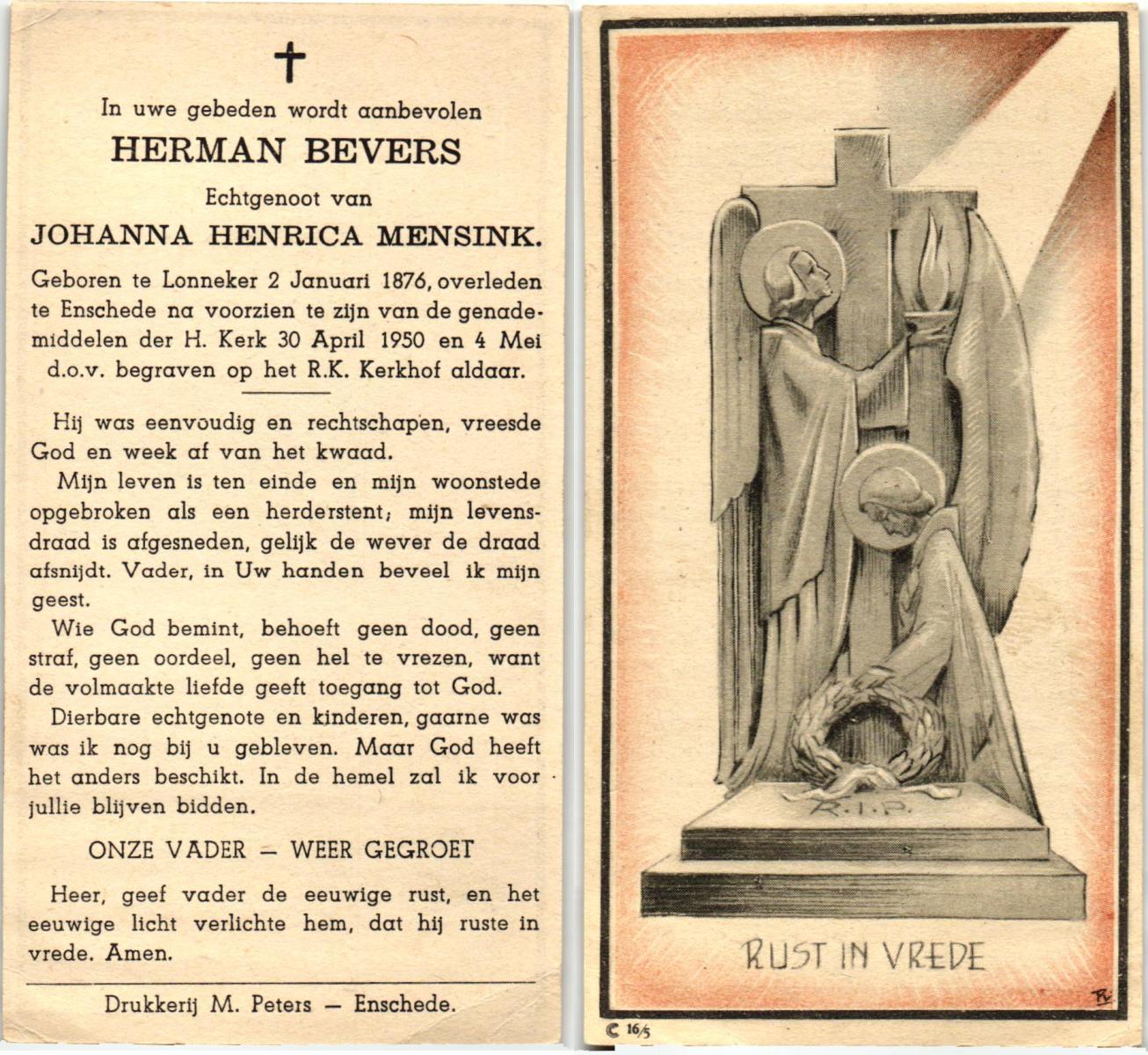 BEVERS, Herman, geboren op 02-01-1876 te Lonneker, overleden op 30-4-1950 te Enschede op 74-jarige leeftijd, begraven op 4-5-1950 te Enschede.