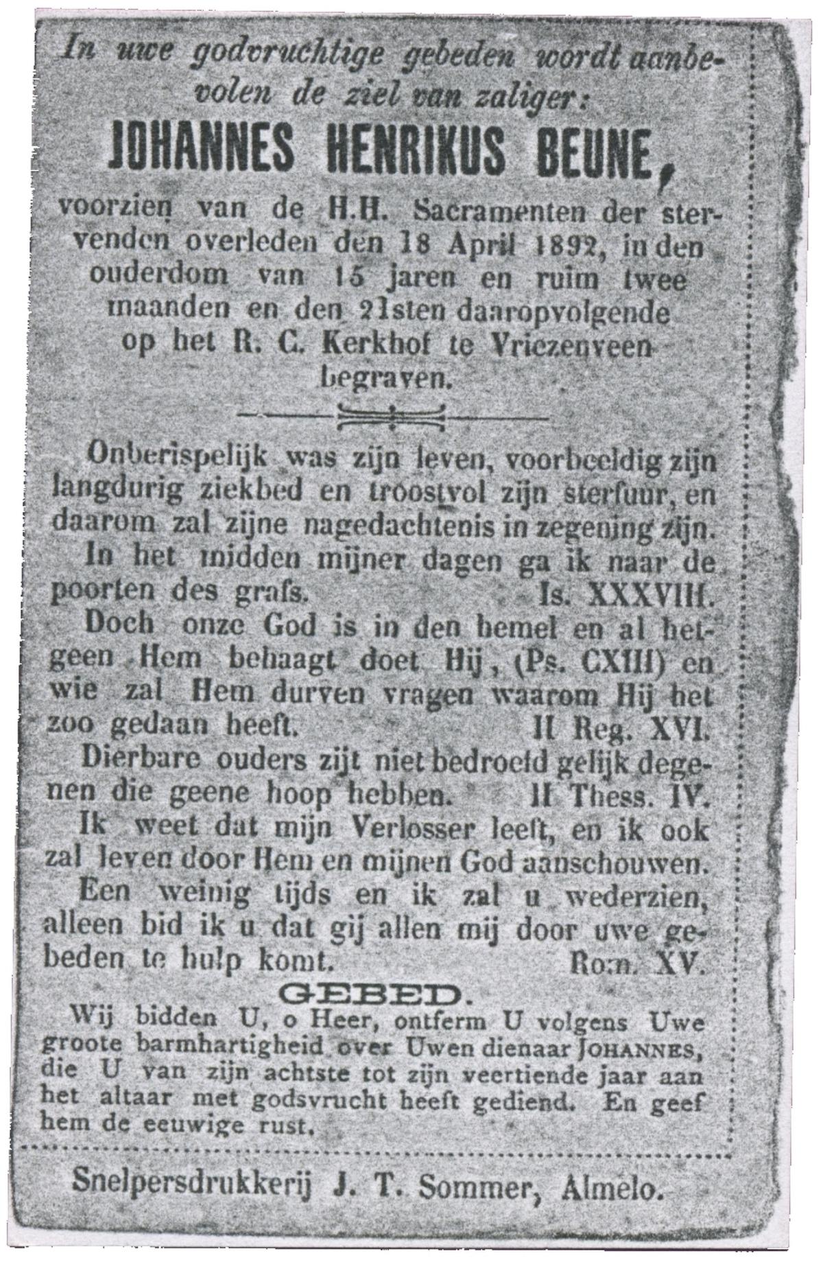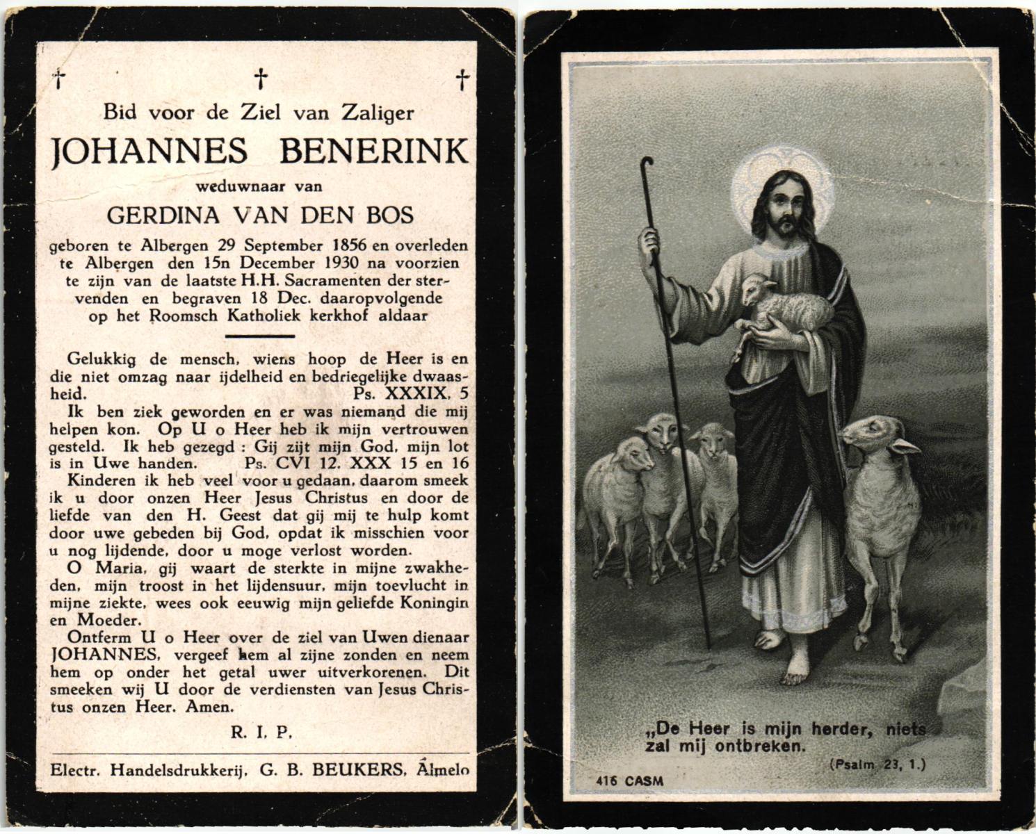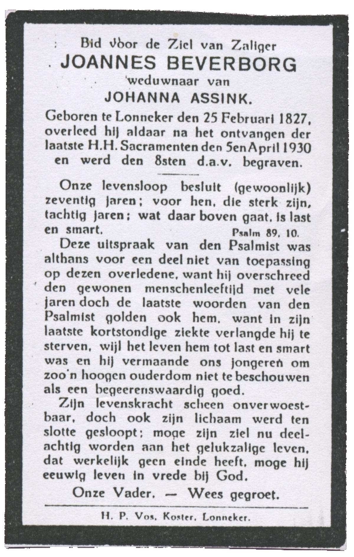 BEVERBORG, Johannes, geboren op 25-02-1827 te Lonneker, overleden op 5-4-1930 te Lonneker op 103-jarige leeftijd, begraven op 8-4-1930 te Lonneker.