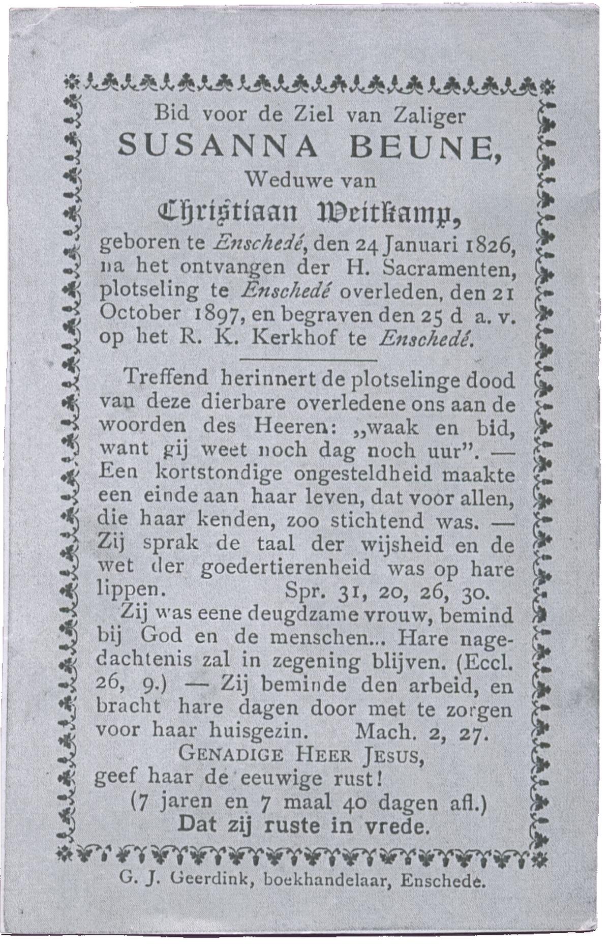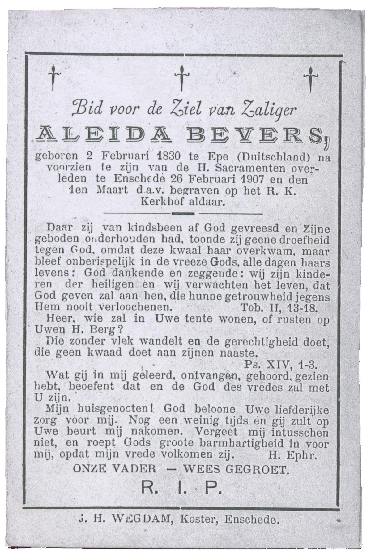 BEVERS, Aleida, geboren op 02-02-1830 te Epe (Dld), overleden op 26-2-1907 te Enschede op 77-jarige leeftijd, begraven op 1-3-1907 te Enschede.