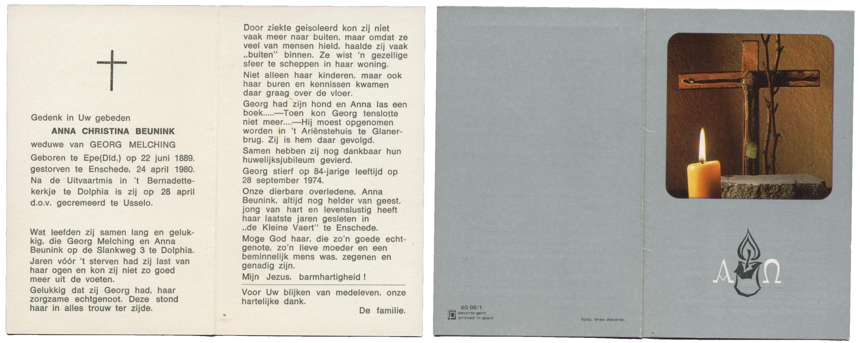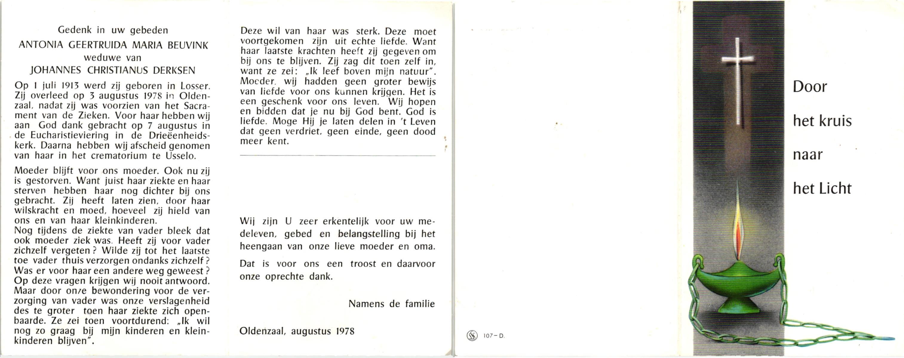BEUVINK, , Antonia Geertruida Maria, geboren op 1-7-1913 te Losser, overleden op 3-8-1978 te Oldenzaal op 65-jarige leeftijd, gecremeerd op 7-8-1978 te Usselo.