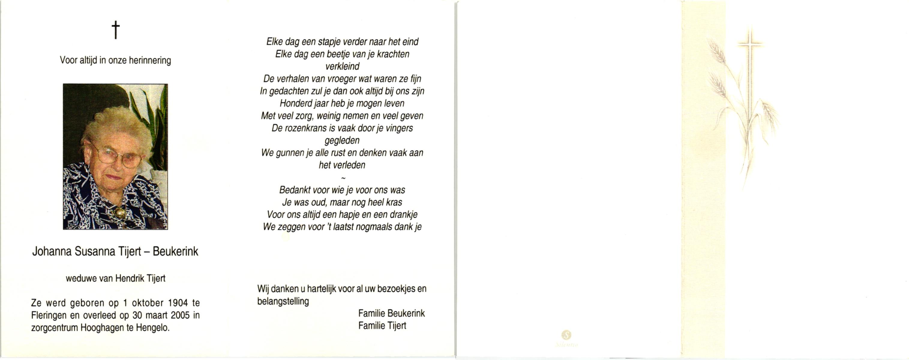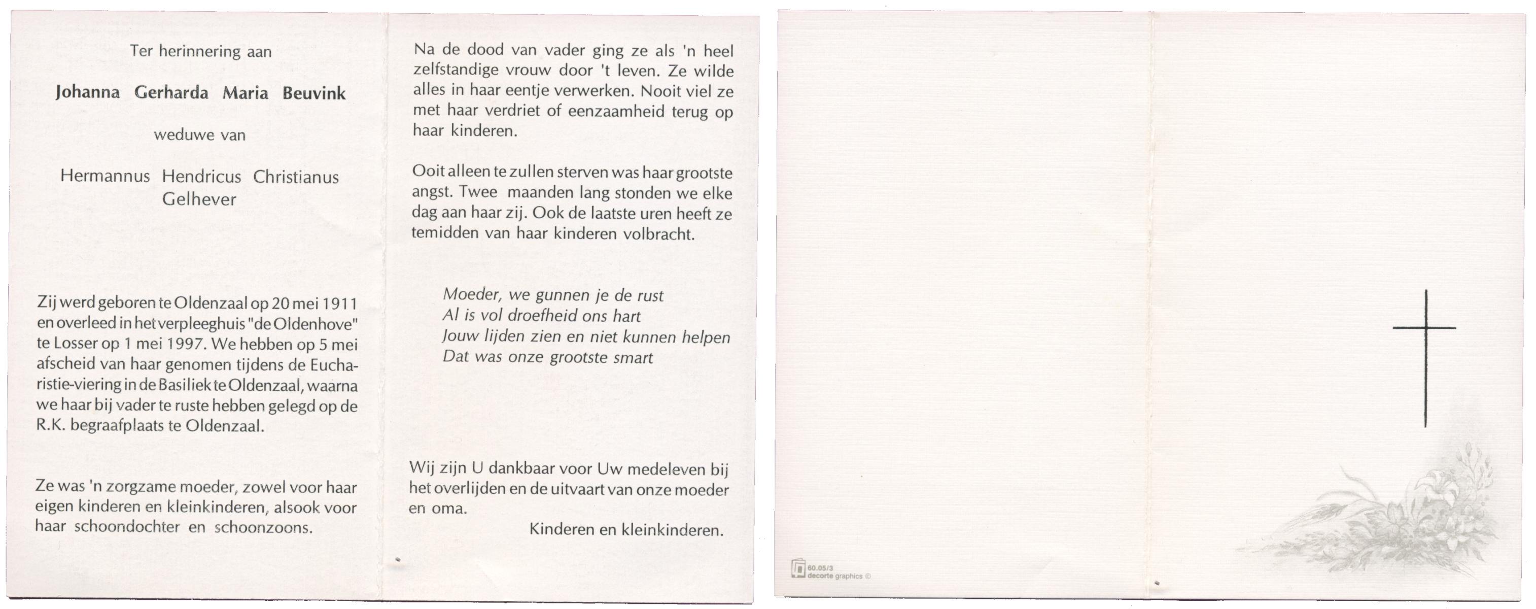 BEUVINK, Johanna Gerharda Maria, geboren op 20-5-1911 te Oldenzaal, overleden op 1-5-1997 te Losser op 85-jarige leeftijd, begraven op 5-5-1997 te Oldenzaal.