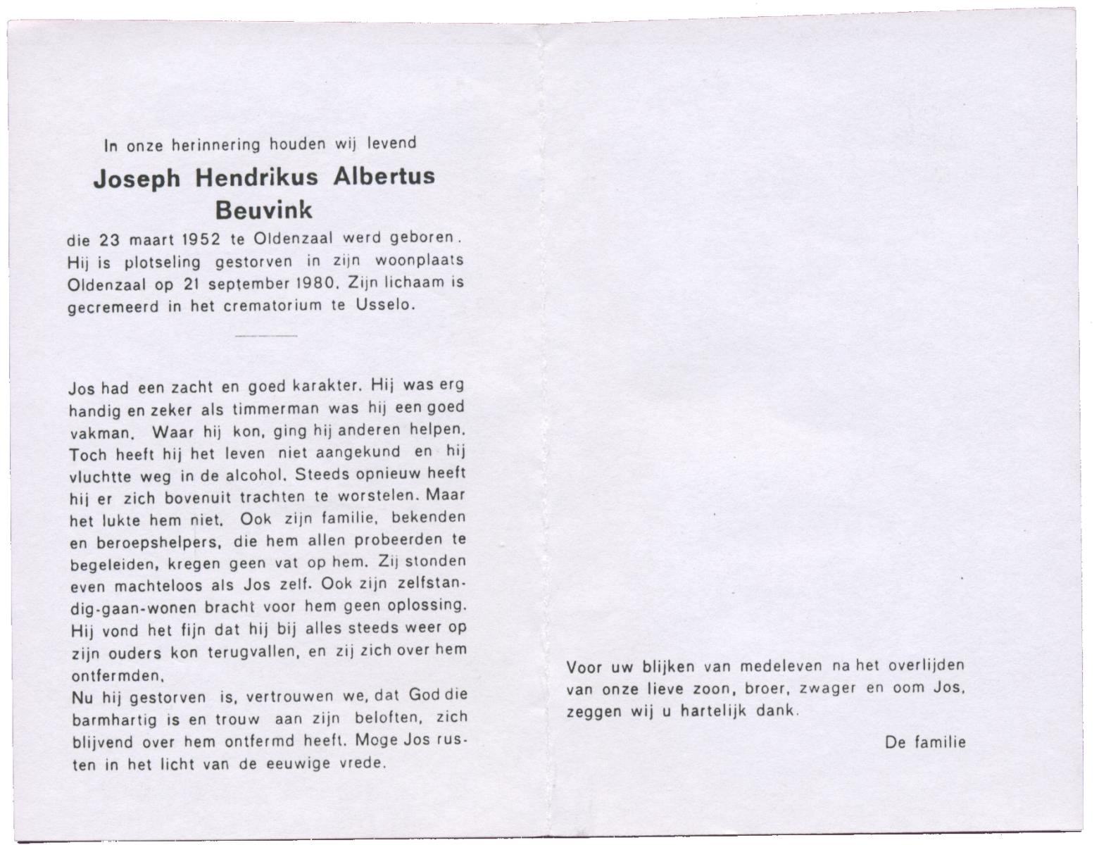 BEUVINK, Joseph Hendrikus Albertus, geboren op 23-3-1952 te Oldenzaal, overleden op 21-9-1980 te Oldenzaal op 28-jarige leeftijd, gecremeerd te Usselo.